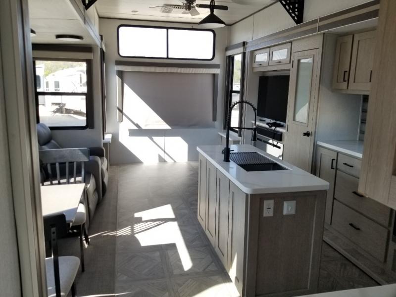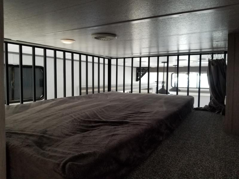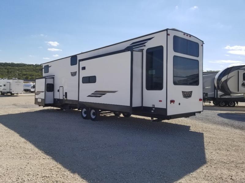 Choose a quiet spot in the woods or a fun location on the lake for your Wildwood Grand Lodge destination trailer by Forest River. Everyone will enjoy the spacious rooms with three slides throughout, and the double loft provides three bunk mats that your children or grandchildren will love. Dual entry includes a set of patio doors for the main entrance plus a private entry door that leads into the front master bedroom for added convenience. You will love the large walk-in pantry for all of your non-perishables and the kitchen island that provides extra counter space to prep and serve your meals, as well as added storage beneath for your larger pots and pans. The kitchen also features a skylight for added natural light making it seem bright even on cloudy days. And there is much more to enjoy each time you stay in this Grand Lodge.