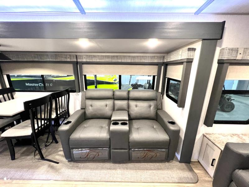 How does sleeping in your own queen bed each night after exploring outdoors away from home sound to you? In this Wildwood Heritage Glen travel trailer, the private bedroom up front offers just that plus dual wardrobes and a closet to stow away all of your clothing, blankets, and such. When you wake up the next morning, head to the spacious living area and kitchen that has two slide outs. The booth dinette, the tri-fold sofa, and the theatre seats offer plenty of seating when you have friends, plus they offer sleeping space as well. The TV and fireplace provide inside entertainment and comfort, and the two awnings offer an outdoor living area. You will also find an exterior coax/TV hookup and a Texas-size pass-through compartment to store your outdoor gear.
