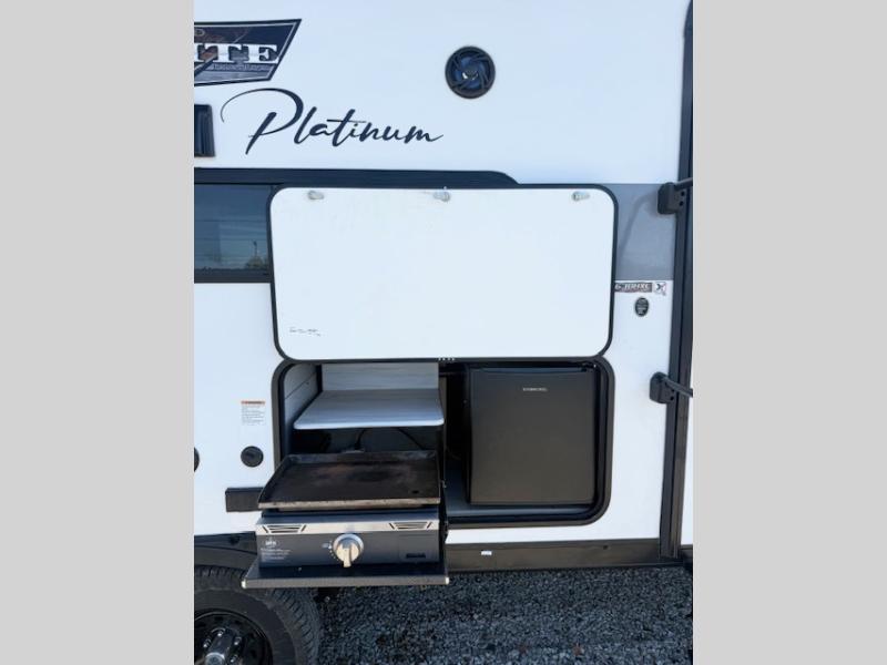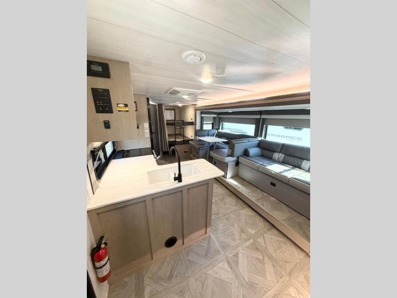 If you need a trailer that will enhance your family getaways, this Wildwood X-Lite travel trailer is it! Because of the double-size bunks in the back and the custom king bed in the front private bedroom, your family can stretch out and sleep comfortably, and the Versa Lounge, which is made up of a U-shaped dinette and sofa, can also transform into extra sleeping space if needed. The whole family will enjoy how accessible the full bathroom is because it contains both an interior and exterior entry door, and the entertainment center with fireplace is certainly going to enrich your time spent indoors. You might even want to add the optional exterior camp kitchen!