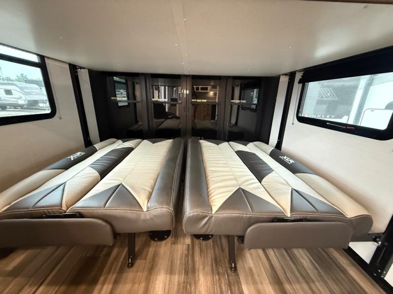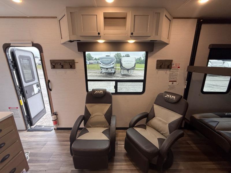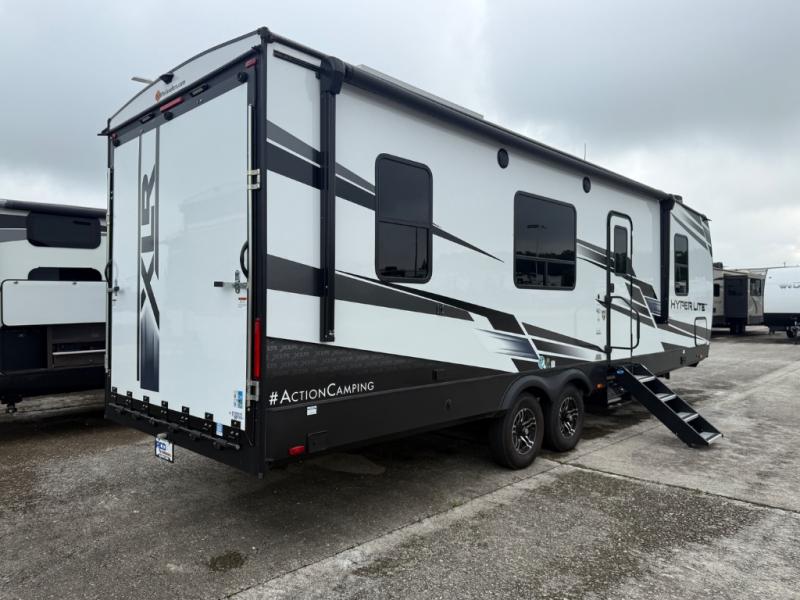 With the XLR Hyper Lite toy hauler travel trailer by Forest River, there is a wider interior with a 74" width even when the slides are retracted in so you can enjoy modern decor, at-home amenities and custom styling. The garages are spacious and include 5,000 lb. cargo tie downs that are anchored to steel plates, an insulated floor, a black rear privacy screen, a ramp patio cable kit for outdoor fun above ground, and Alumi-tread rear entry steps to mention a few highlights. More standout features include MORryde CRE3000 premium suspension that smooths out even the toughest of roads, heavy-duty Dexter axles offering the best in class carrying capacities, and the XLR fully enclosed "Body Armor" underbelly that is insulated and uses a panel system for ease of access. So when you want to play hard, choose an XLR Hyper Lite that offers upgraded features, quality construction, and allows you the control of venturing on or off road!
