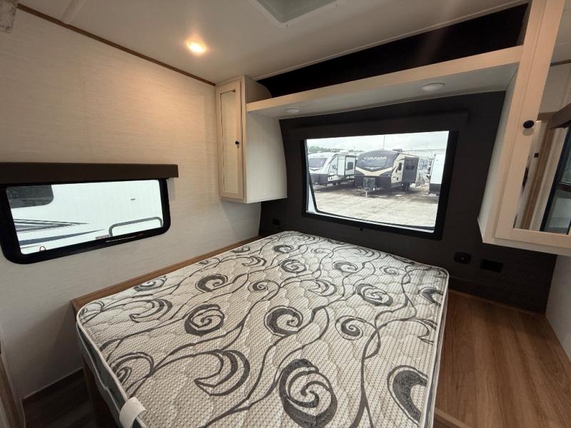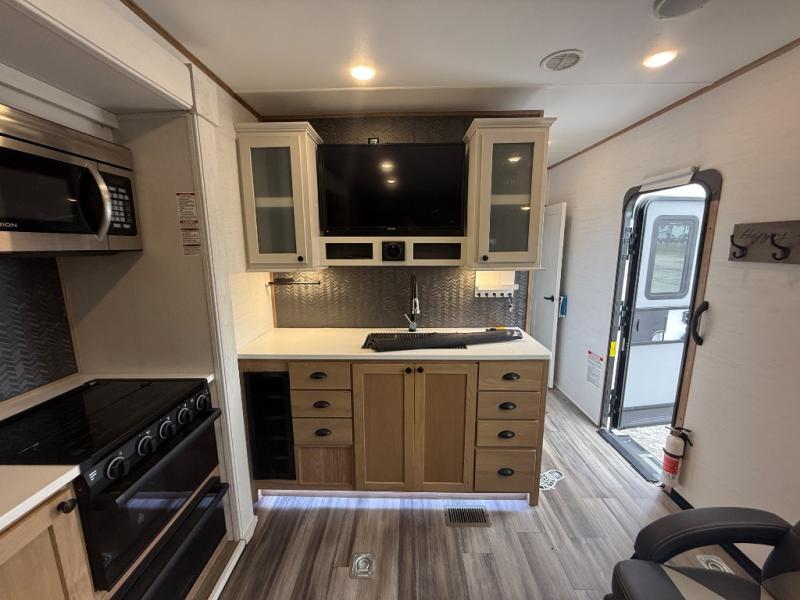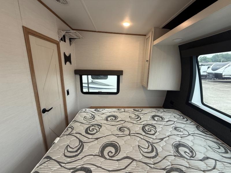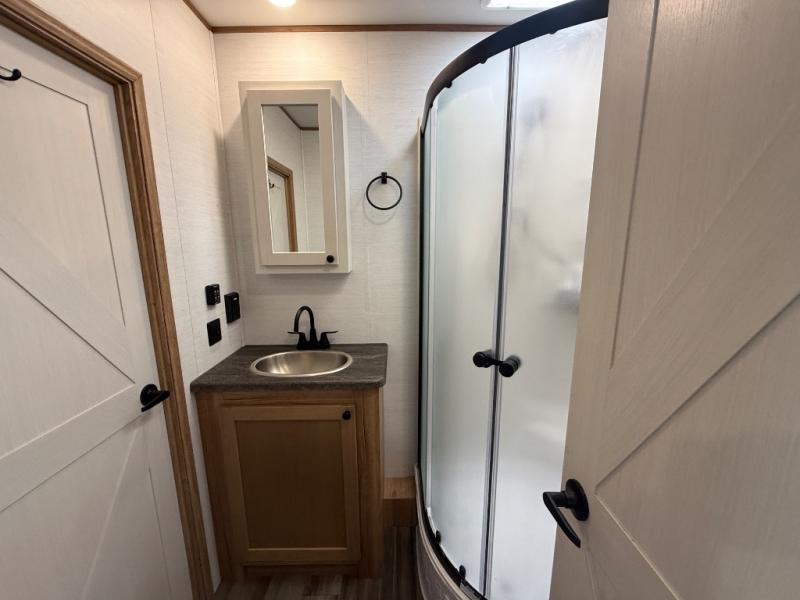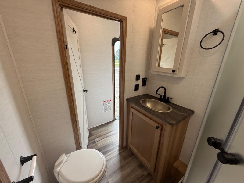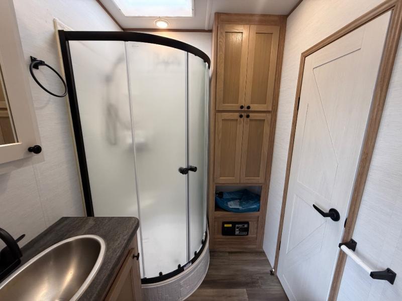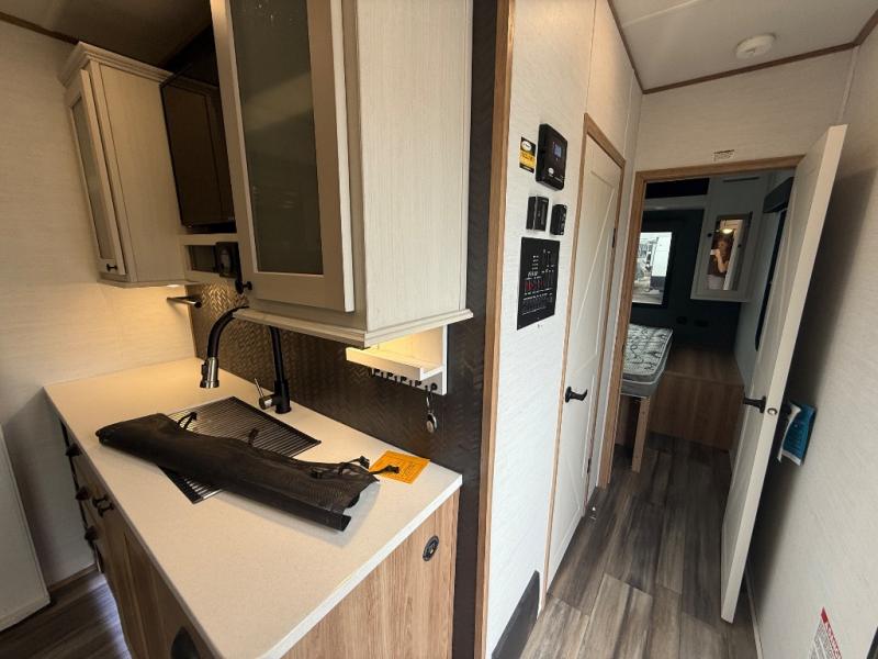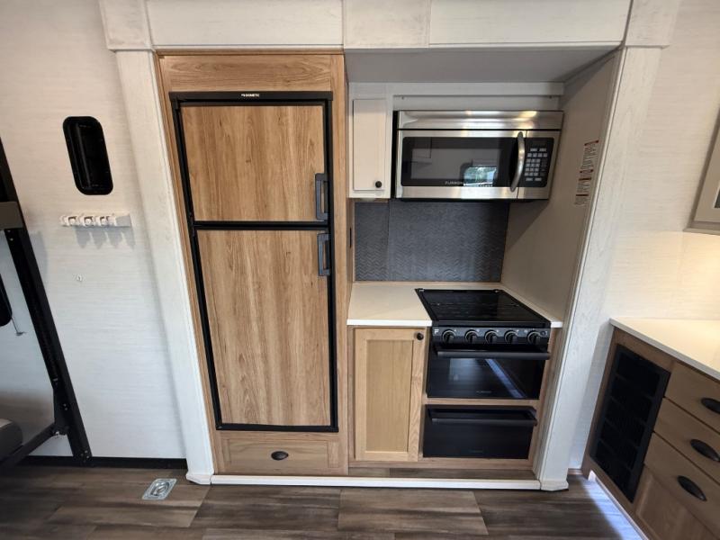 As you seek adventure with your toys, you can also require comfort in your own bedroom at the campsite! The front bedroom provides your own walk-around queen bed with dual wardrobes and windows with great views and natural lighting, plus access to the full bathroom with a radius shower. The main living and kitchen area offers two lounge chairs with end table in between to place your drinks on, dual sofas with dinettes in the rear to dine at, and a slide out with kitchen amenities plus there is extra counter space and a stainless steel single basin sink plus storage for the cook. You will love the hardwood cabinet doors, the grate style sink cover/drying rack, and the metropolitan grey countertops. And the furniture doubles as sleeping space, plus the electric bunk gives you room for two more.