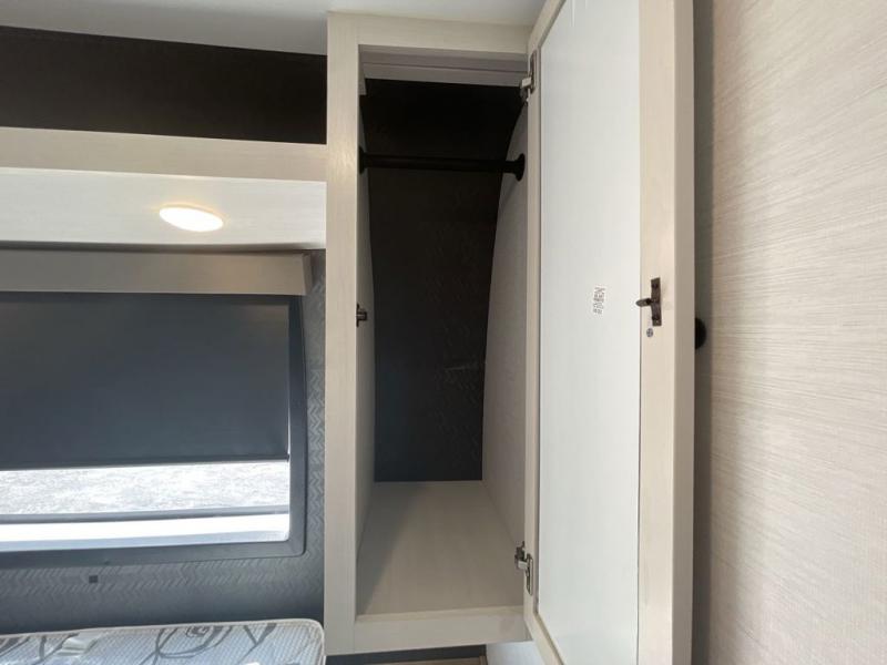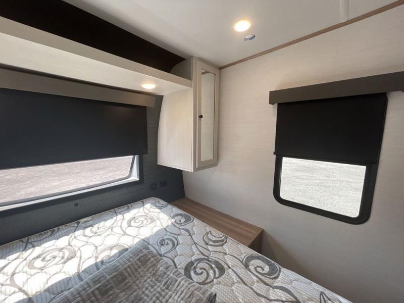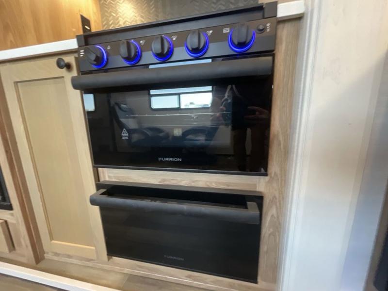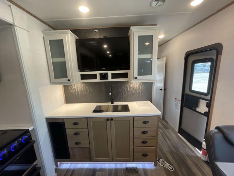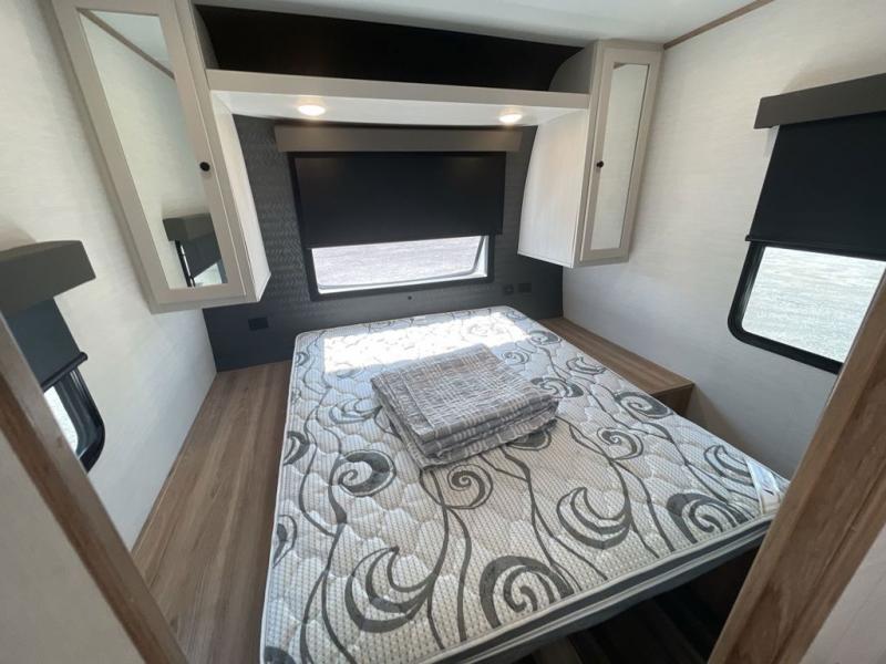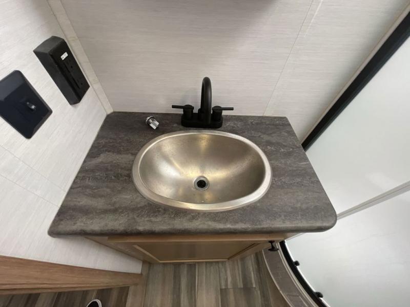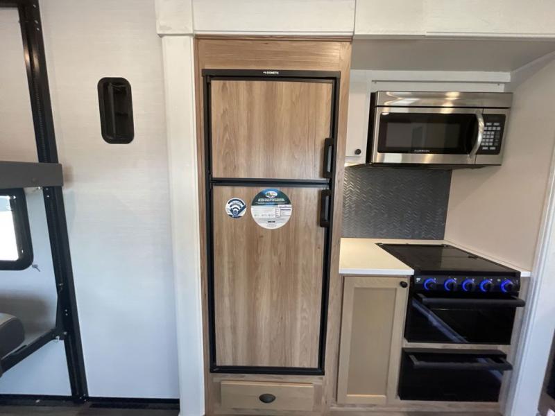 As you seek adventure with your toys, you can also require comfort in your own bedroom at the campsite! The front bedroom provides your own walk-around queen bed with dual wardrobes and windows with great views and natural lighting, plus access to the full bathroom with a radius shower. The main living and kitchen area offers two lounge chairs with end table in between to place your drinks on, dual sofas with dinettes in the rear to dine at, and a slide out with kitchen amenities plus there is extra counter space and a stainless steel single basin sink plus storage for the cook. You will love the hardwood cabinet doors, the grate style sink cover/drying rack, and the metropolitan grey countertops. And the furniture doubles as sleeping space, plus the electric bunk gives you room for two more.