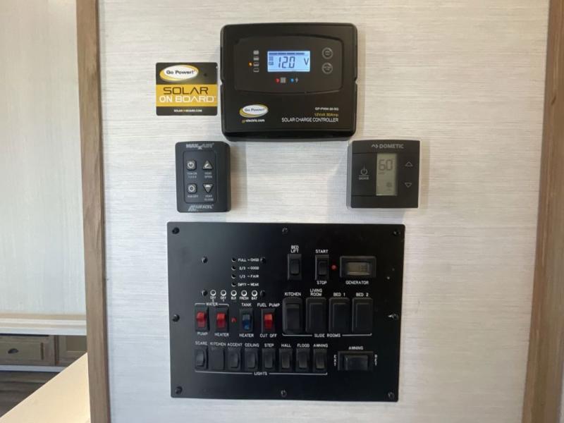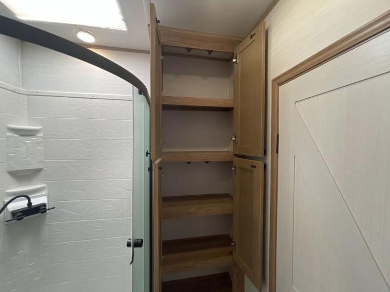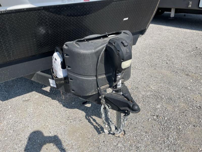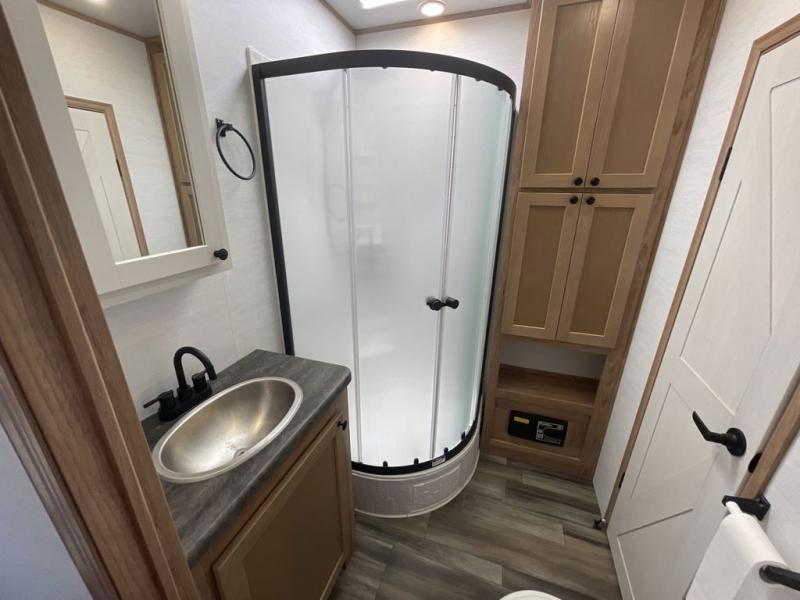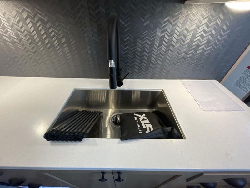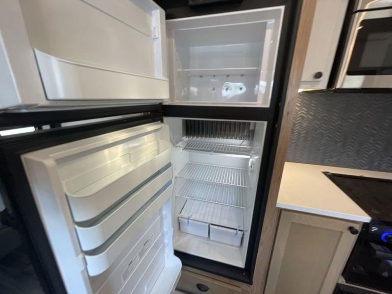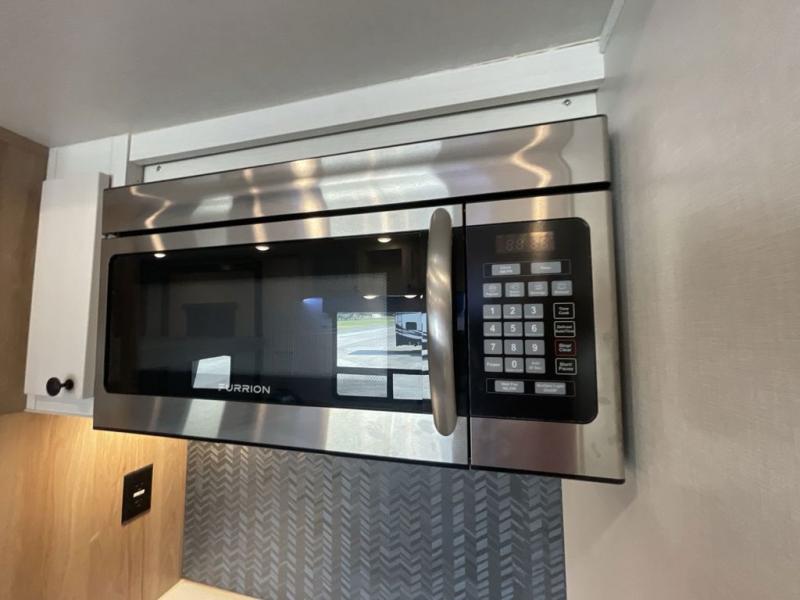 As you seek adventure with your toys, you can also require comfort in your own bedroom at the campsite! The front bedroom provides your own walk-around queen bed with dual wardrobes and windows with great views and natural lighting, plus access to the full bathroom with a radius shower. The main living and kitchen area offers two lounge chairs with end table in between to place your drinks on, dual sofas with dinettes in the rear to dine at, and a slide out with kitchen amenities plus there is extra counter space and a stainless steel single basin sink plus storage for the cook. You will love the hardwood cabinet doors, the grate style sink cover/drying rack, and the metropolitan grey countertops. And the furniture doubles as sleeping space, plus the electric bunk gives you room for two more.