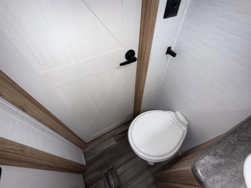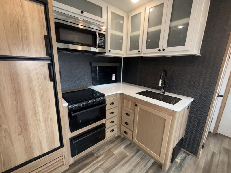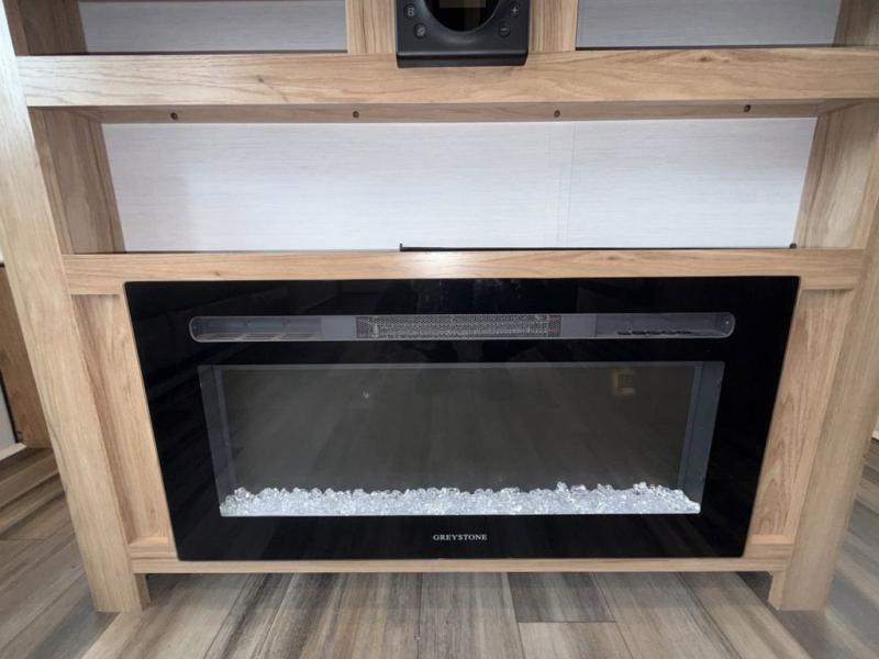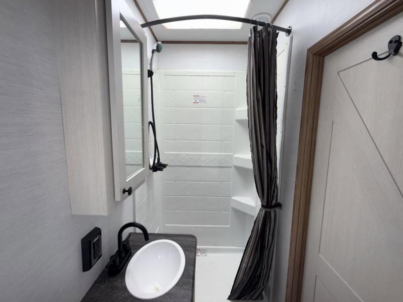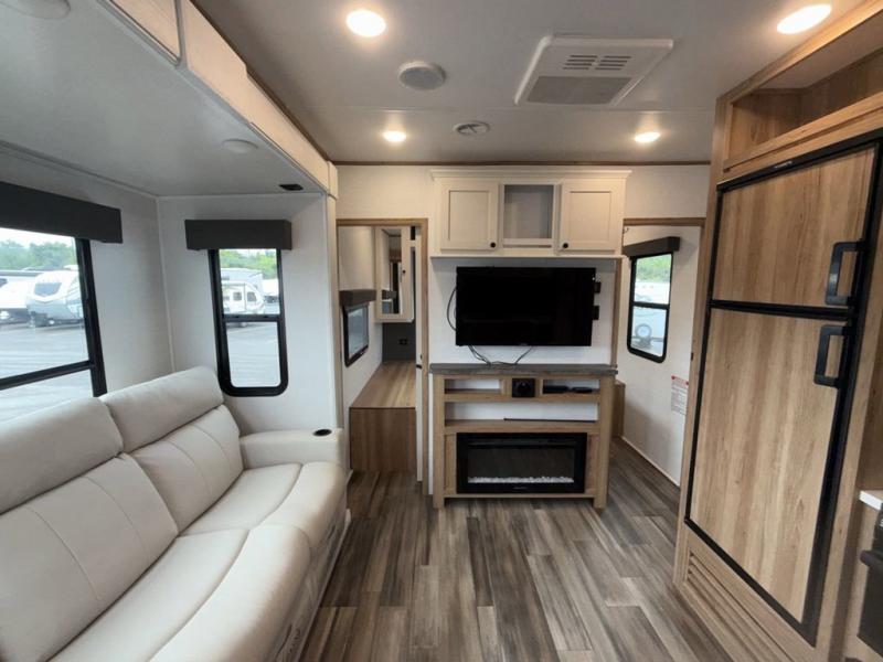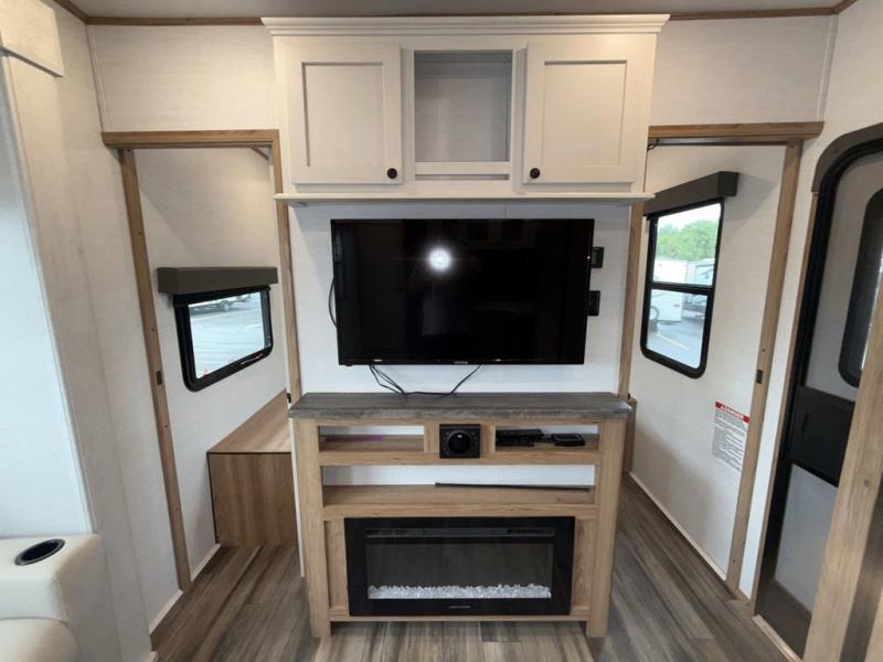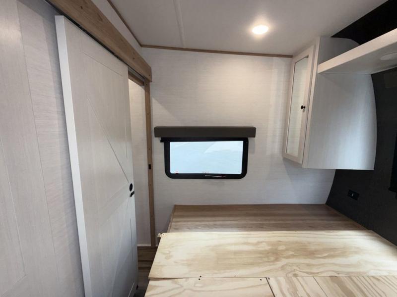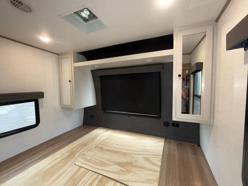 Looking for your own space to relax and unwind after riding your toys? Does the cook want their own area to whip up meals for the crew? This trailer is your answer to both of those wants! The main living and kitchen area is separated from the rear garage and includes a slide out sofa, a 39" TV with fireplace below, an L-shaped kitchen area with full amenities including metropolitan grey countertops, a stainless steel single basin sink, and a cast iron three-burner cooktop, plus the main entry door and a full bathroom. The front bedroom includes dual entries, a queen bed, wardrobes and a front window plus side windows for natural lighting. And the rear separate garage offers a side man door, an electric bunk with sofas and dinettes below allowing this space to be utilized as a staging, dining and sleeping area, the choice is yours!