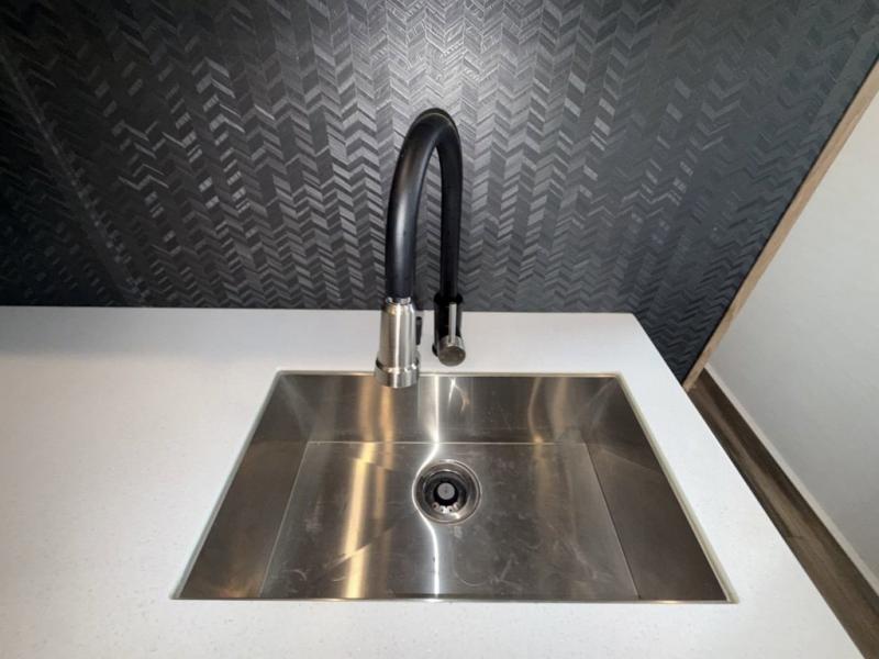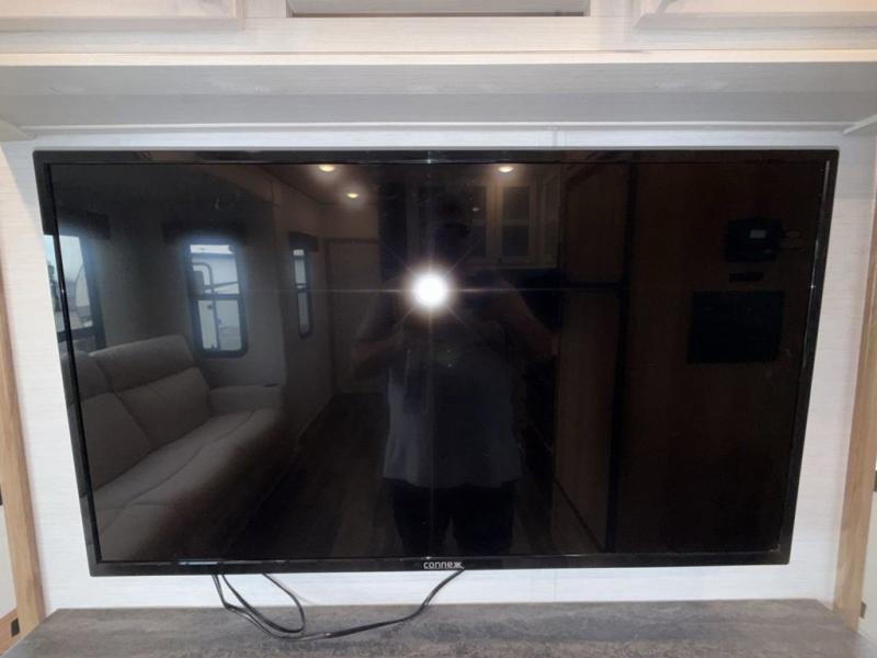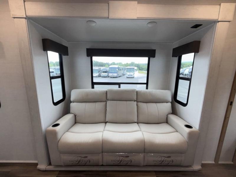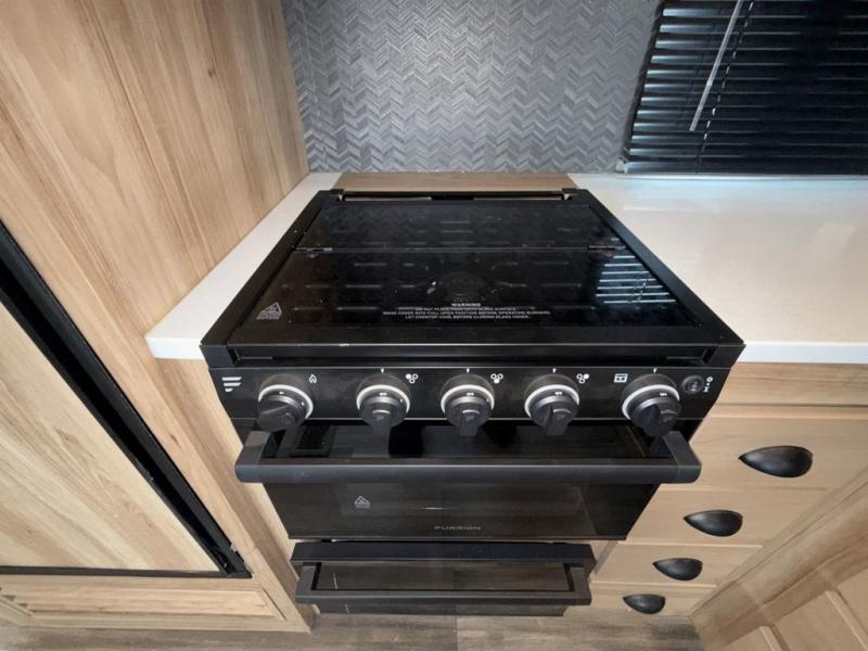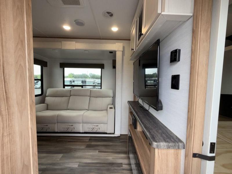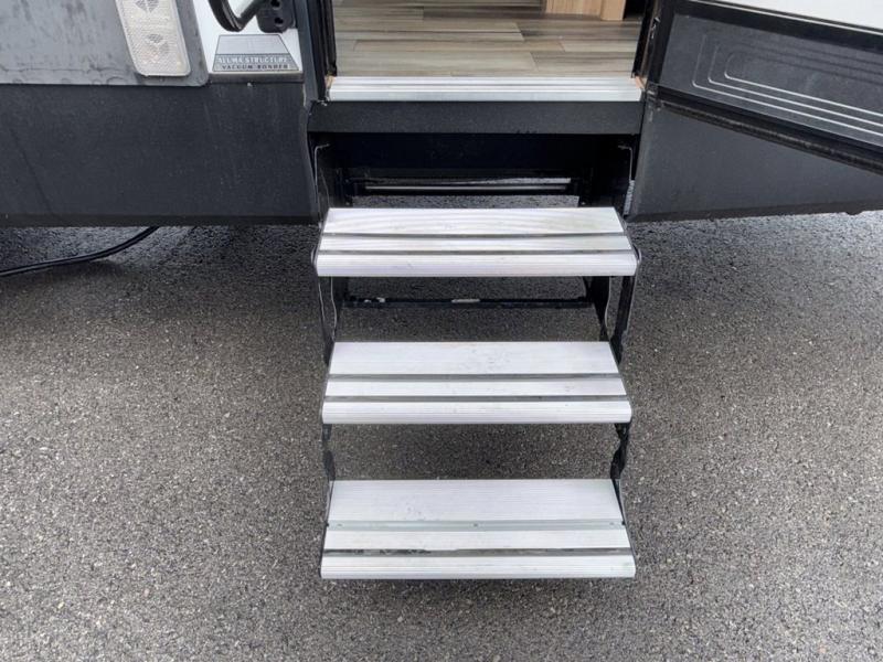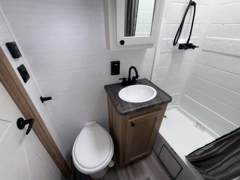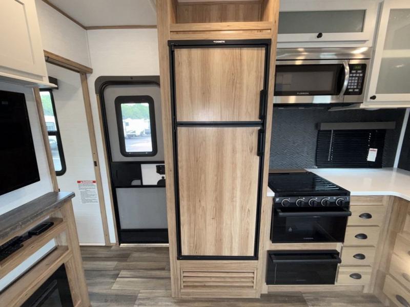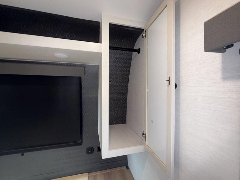 Looking for your own space to relax and unwind after riding your toys? Does the cook want their own area to whip up meals for the crew? This trailer is your answer to both of those wants! The main living and kitchen area is separated from the rear garage and includes a slide out sofa, a 39" TV with fireplace below, an L-shaped kitchen area with full amenities including metropolitan grey countertops, a stainless steel single basin sink, and a cast iron three-burner cooktop, plus the main entry door and a full bathroom. The front bedroom includes dual entries, a queen bed, wardrobes and a front window plus side windows for natural lighting. And the rear separate garage offers a side man door, an electric bunk with sofas and dinettes below allowing this space to be utilized as a staging, dining and sleeping area, the choice is yours!