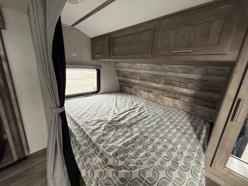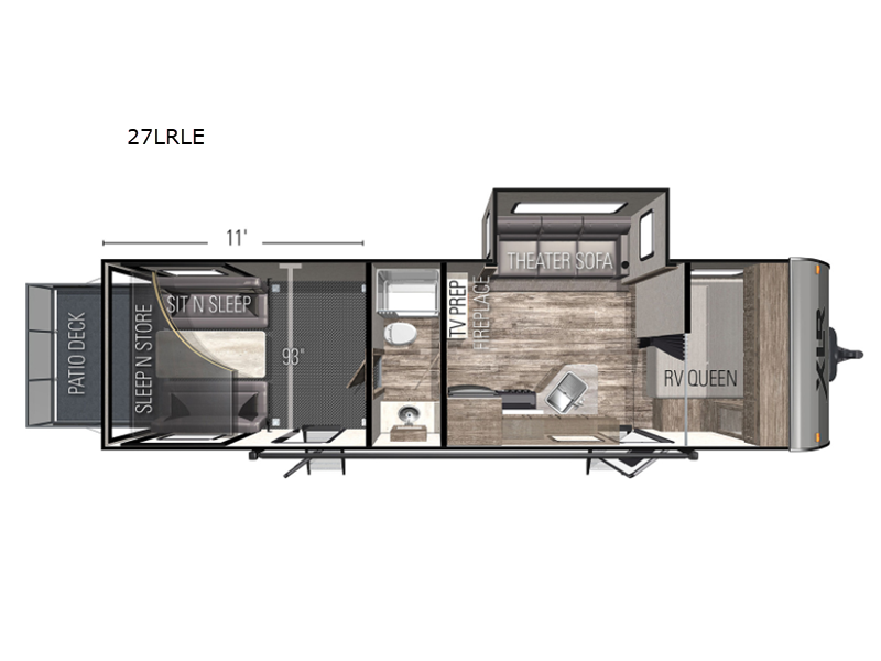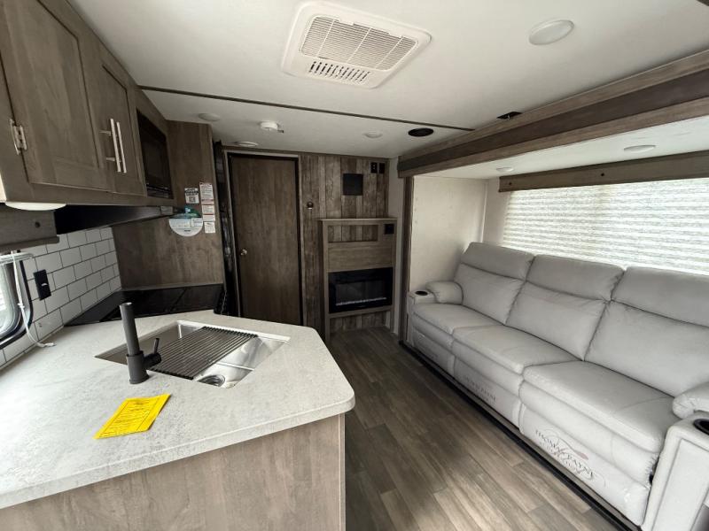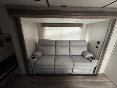 Dual entry doors in this travel trailer will make camping at your favorite state park easier than ever. Once your toys are unloaded, set up the patio deck for a cold drink. There is also Sit N Sleep sofas here and a Sleep N Store manual bed system for your guests to sleep on. Step into the walk-through bath to freshen up, then head to the full kitchen to prepare lunch on the three burner cooktop. You can relax on the theater sofa slide out, or take your plate outdoors to sit under the 15' power awning with LED lights. The RV queen bed in the front private bedroom will be calling your name after a day of fun, while your guests sleep in the separate garage. You can't beat this travel trailer!
