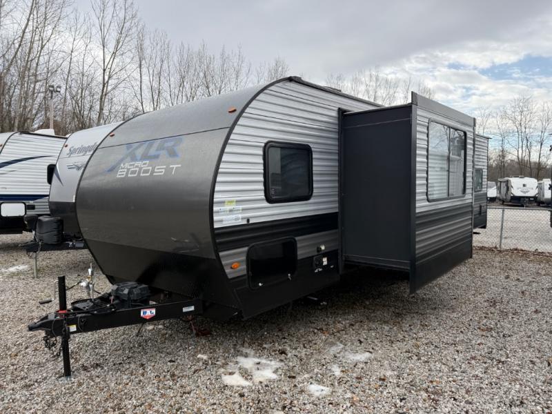 Each XLR Micro Boost toy hauler is made to last through years of use thanks to the seamless PVC roof system, the diamond plate front rock guard, and the Body Armor enclosed and insulated underbelly. You will appreciate the oil and gas resistant residential linoleum and the moisture barrier floor enclosure to keep your space clean, and the lightweight design will be perfect for smaller tow vehicles. Each model includes residential stainless steel sinks, decorative kitchen backsplash, solid core cabinet stiles, and large panoramic windows for breathtaking outdoor views. The exterior includes many convenient features to make camping easier than ever, including a pet leash for your furry friends, insulated storage doors, a hot and cold exterior shower, plus a friction hinge entry door. There is even a power awning with blue LED lights and two exterior speakers for the ultimate outdoor living space.