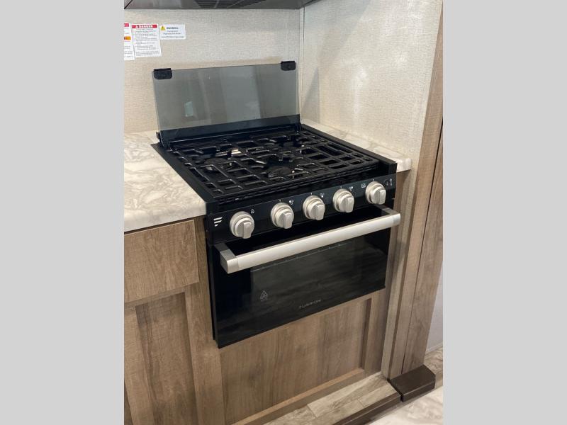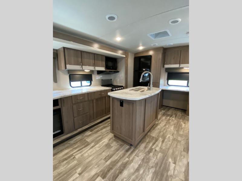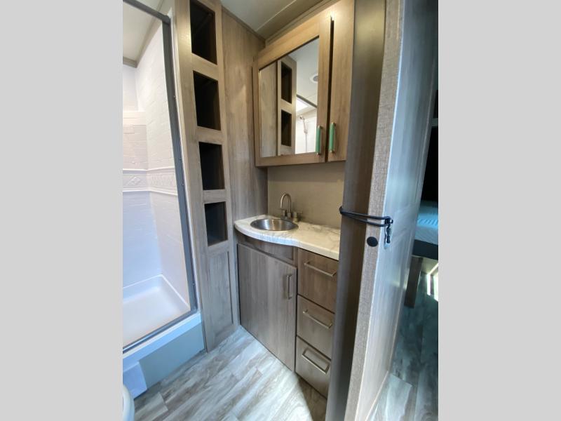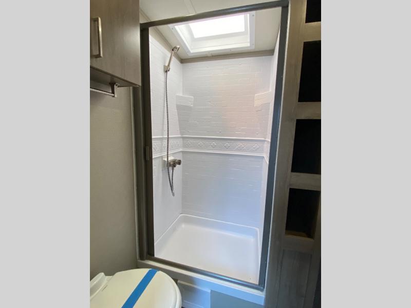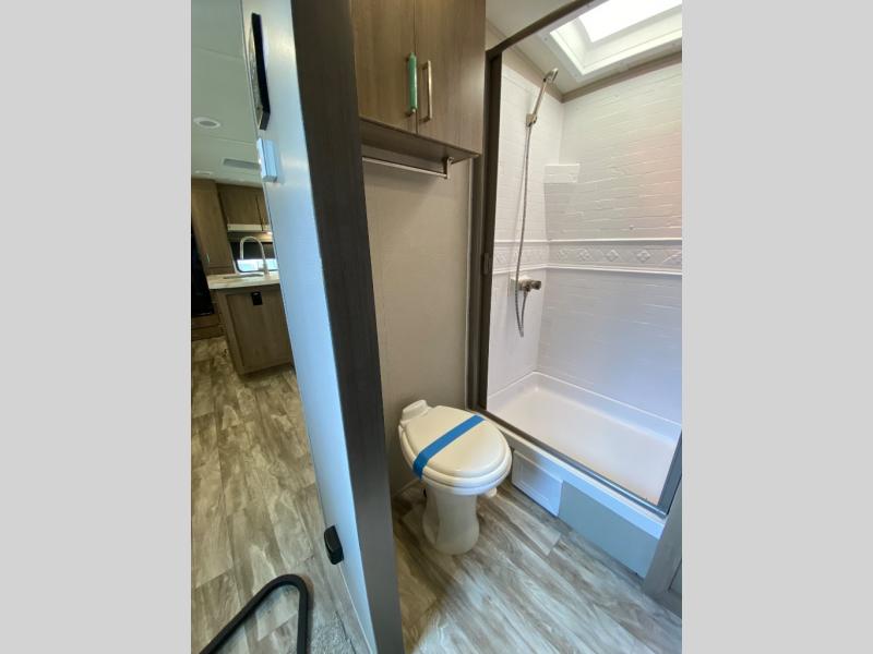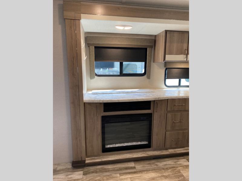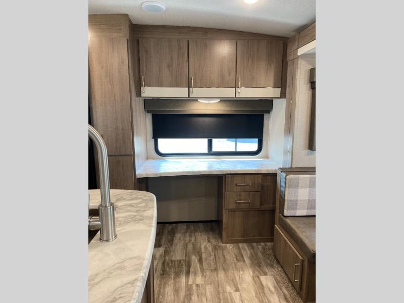With this Imagine travel trailer, you can work while you're on the road because it offers you a desk in the main living area. You won't have to miss out on the action since you'll be right next to the booth dinette and tri-fold sofa, and there is even a pantry directly to the left of the desk for you to grab a quick snack while you're working. Once you're done with work, you can relax on the tri-fold sofa while you watch the telescoping 40" LED HDTV, and the private bedroom offers you a 60" x 80" queen bed to rest on when you're ready to call it a night.