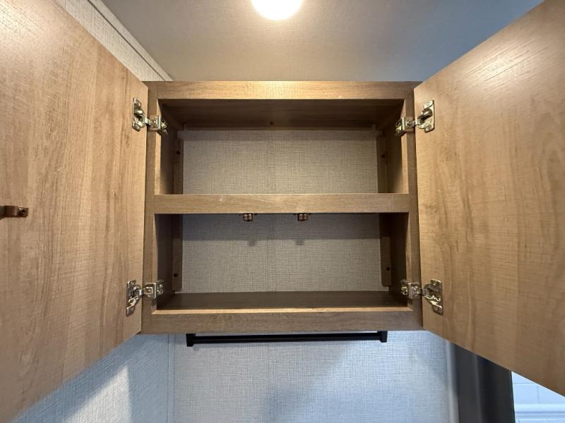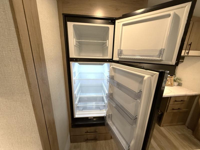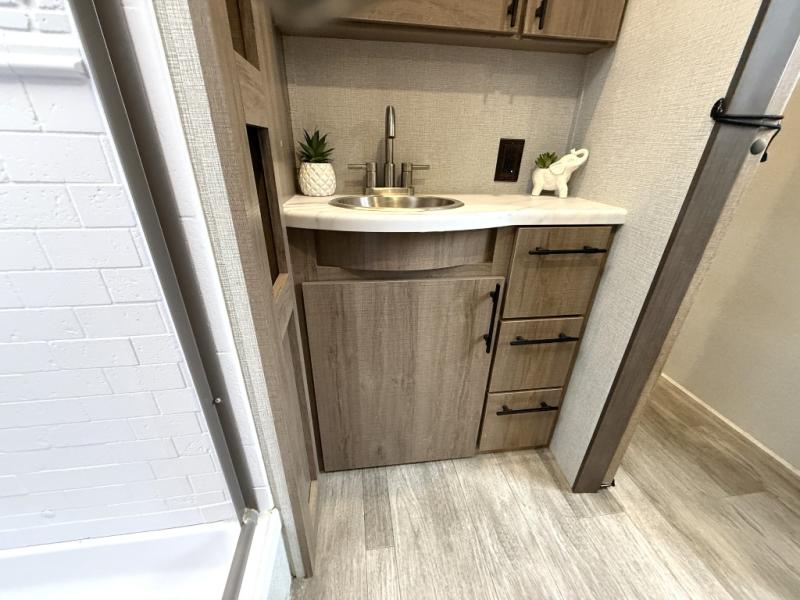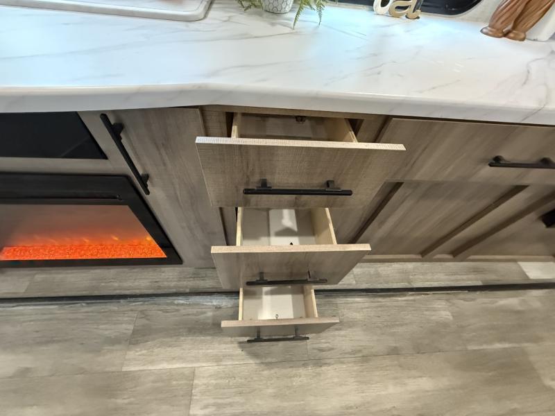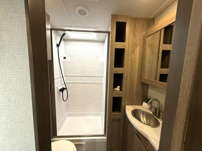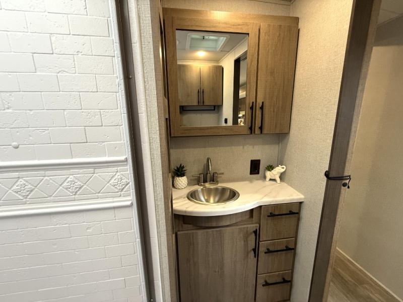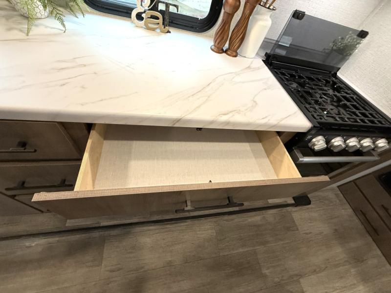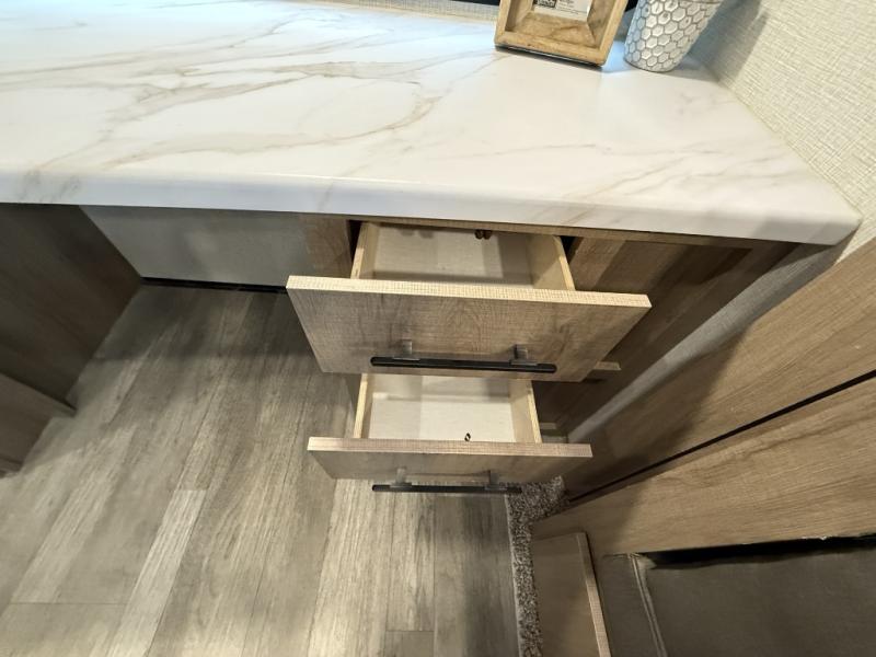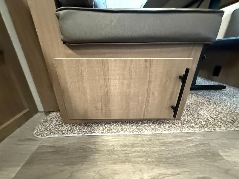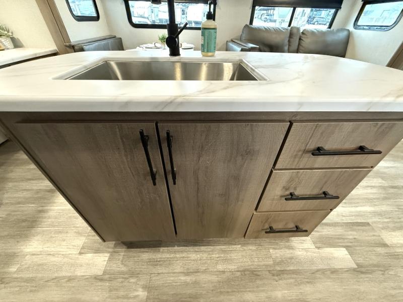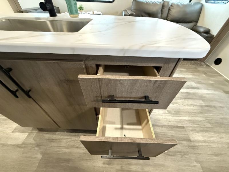 With this Imagine travel trailer, you can work while you're on the road because it offers you a desk in the main living area. You won't have to miss out on the action since you'll be right next to the booth dinette and tri-fold sofa, and there is even a pantry directly to the left of the desk for you to grab a quick snack while you're working. Once you're done with work, you can relax on the tri-fold sofa while you watch the telescoping 40" LED HDTV, and the private bedroom offers you a 60" x 80" queen bed to rest on when you're ready to call it a night.