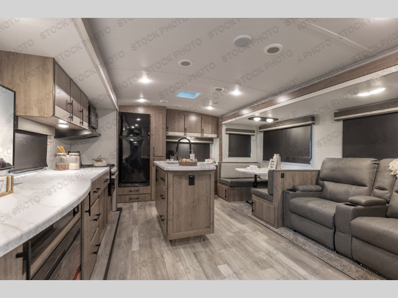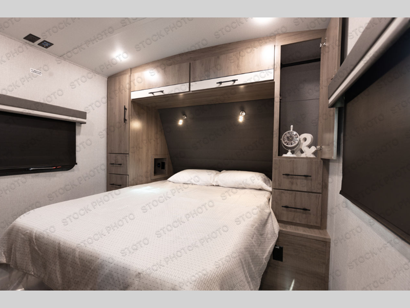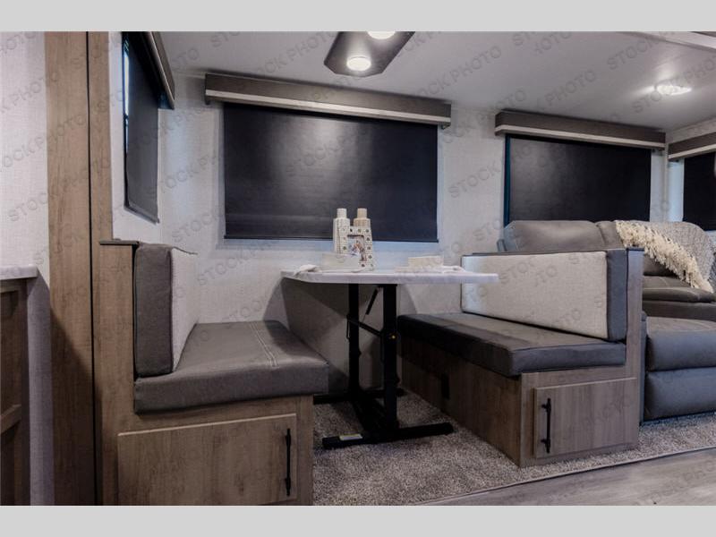 With this Imagine travel trailer, you can work while you're on the road because it offers you a desk in the main living area. You won't have to miss out on the action since you'll be right next to the booth dinette and tri-fold sofa, and there is even a pantry directly to the left of the desk for you to grab a quick snack while you're working. Once you're done with work, you can relax on the tri-fold sofa while you watch the telescoping 40" LED HDTV, and the private bedroom offers you a 60" x 80" queen bed to rest on when you're ready to call it a night.