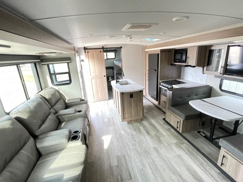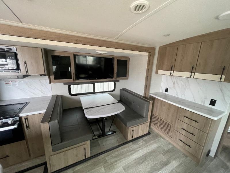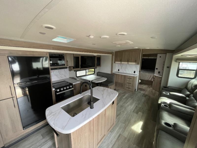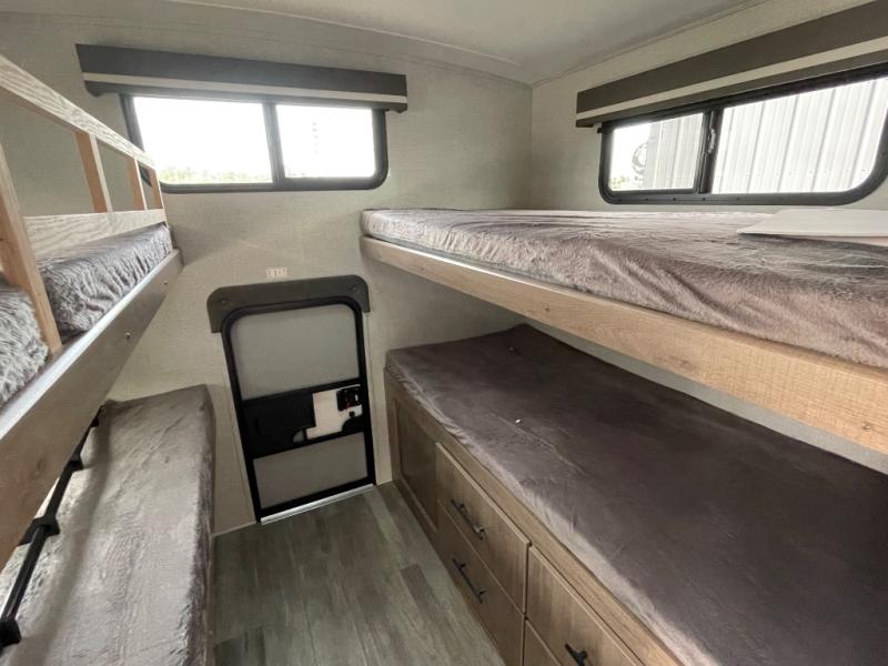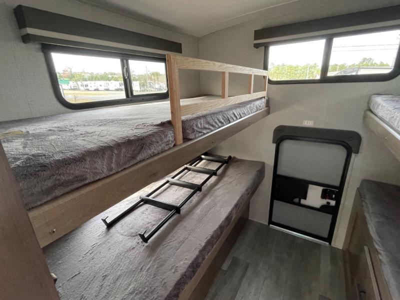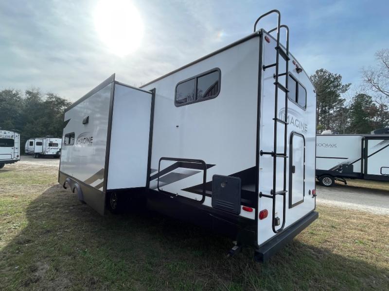 A great travel trailer for larger families or those that enjoy traveling with a few friends! This Imagine quad bunk model features two private bedrooms, with the master up front including a private entry/exit door just beyond a spacious walk-through bathroom that features a 30" x 36" shower with skylight to bring in more natural lighting each day, plus a toilet, sink and linen storage. In the kitchen, a nice island for food prep and cleaning up makes it easy to be part of the conversation in the room while you get meals ready for everyone. Speaking of food prep, how about the outside griddle and 1.6 cu. ft. refrigerator which is perfect for cooking outside, or for making late night snacks when all are enjoying the evening under the stars or in lawn chairs under one of two 9' 6" awnings with LED lighting. Your kids can bring along extra guests with the added sleeping that a quad bunk model provides. And, there is plenty of storage in the private bunkroom with drawers beneath for their things, plus a rear baggage door that is 42" x 22" for even more storage space for extra toys and gear.