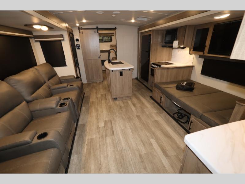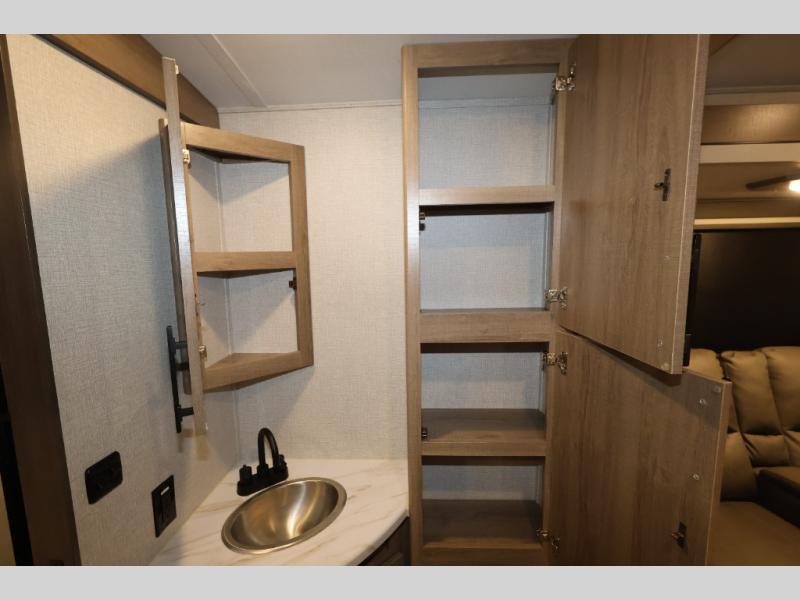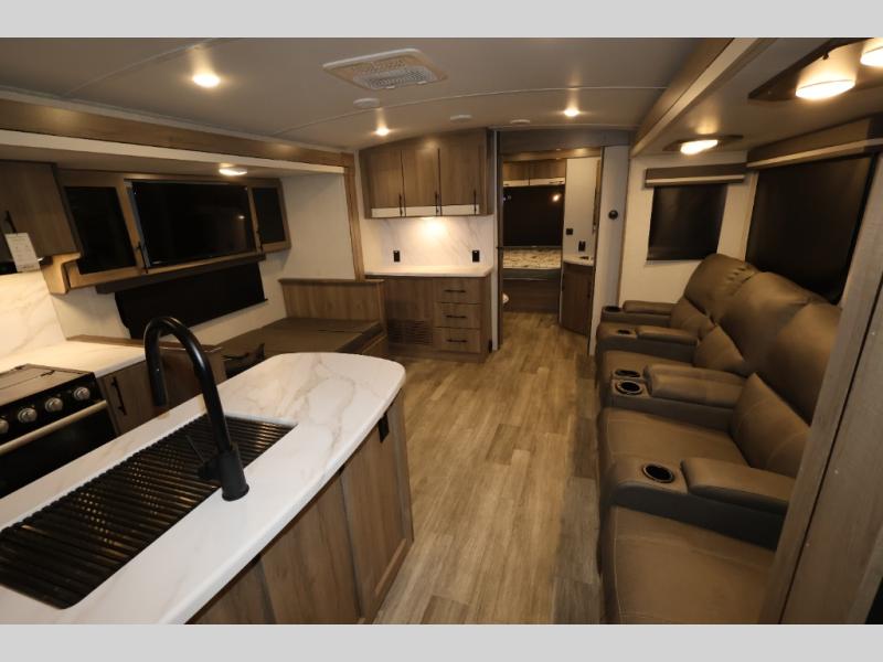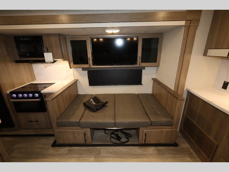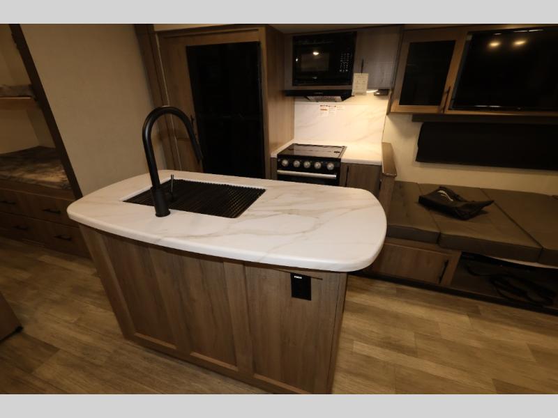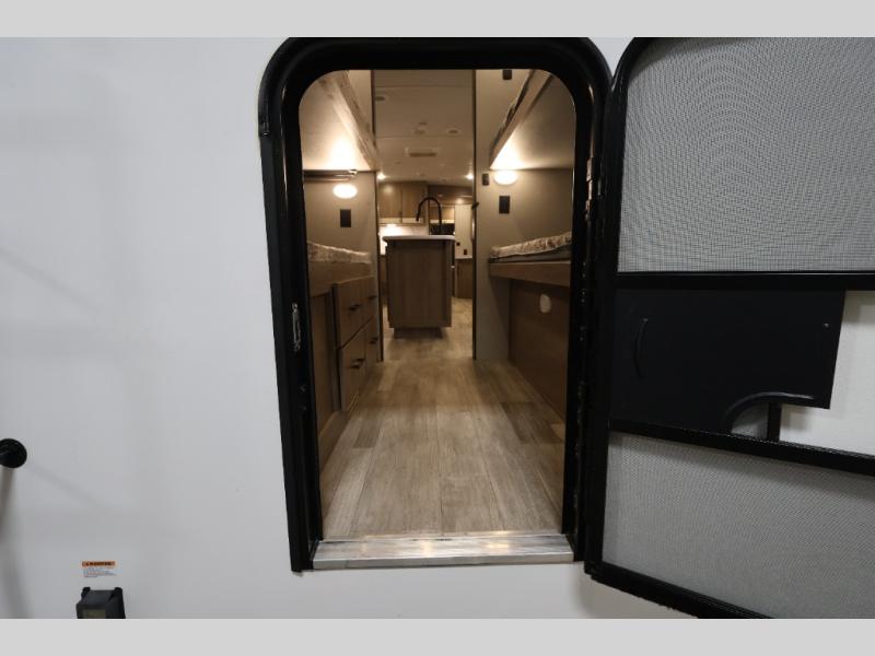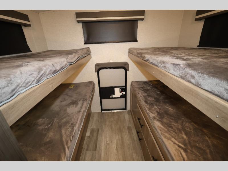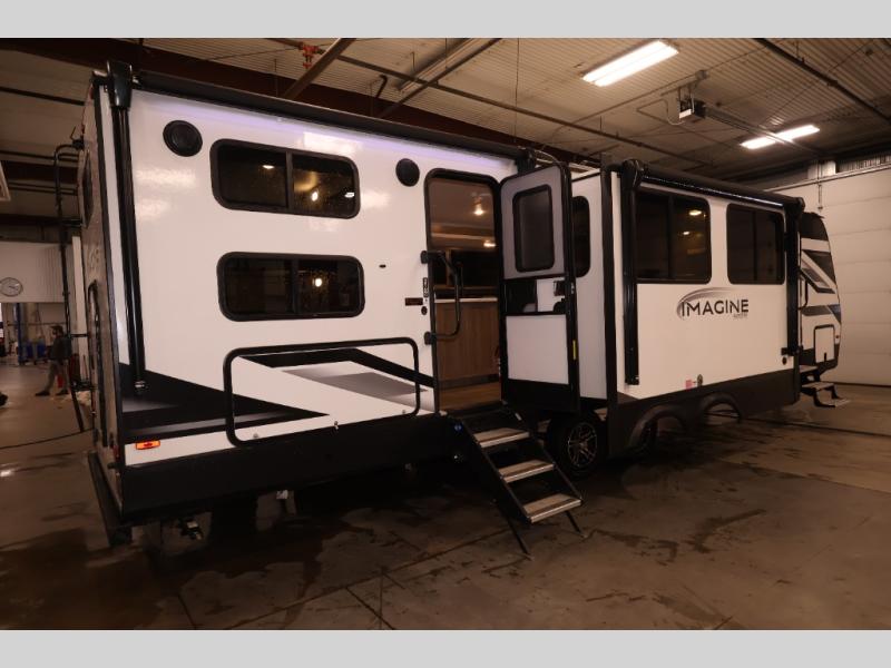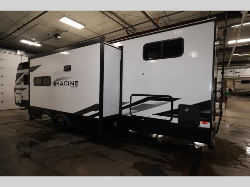 A great travel trailer for larger families or those that enjoy traveling with a few friends! This Imagine quad bunk model features two private bedrooms, with the master up front including a private entry/exit door just beyond a spacious walk-through bathroom that features a 30" x 36" shower with skylight to bring in more natural lighting each day, plus a toilet, sink and linen storage. In the kitchen, a nice island for food prep and cleaning up makes it easy to be part of the conversation in the room while you get meals ready for everyone. Speaking of food prep, how about the outside griddle and 1.6 cu. ft. refrigerator which is perfect for cooking outside, or for making late night snacks when all are enjoying the evening under the stars or in lawn chairs under one of two 9' 6" awnings with LED lighting. Your kids can bring along extra guests with the added sleeping that a quad bunk model provides. And, there is plenty of storage in the private bunkroom with drawers beneath for their things, plus a rear baggage door that is 42" x 22" for even more storage space for extra toys and gear.