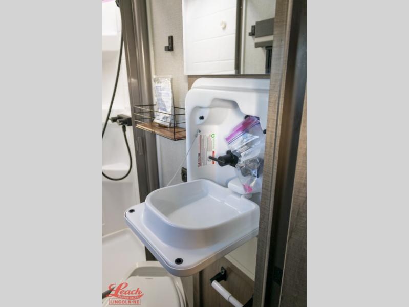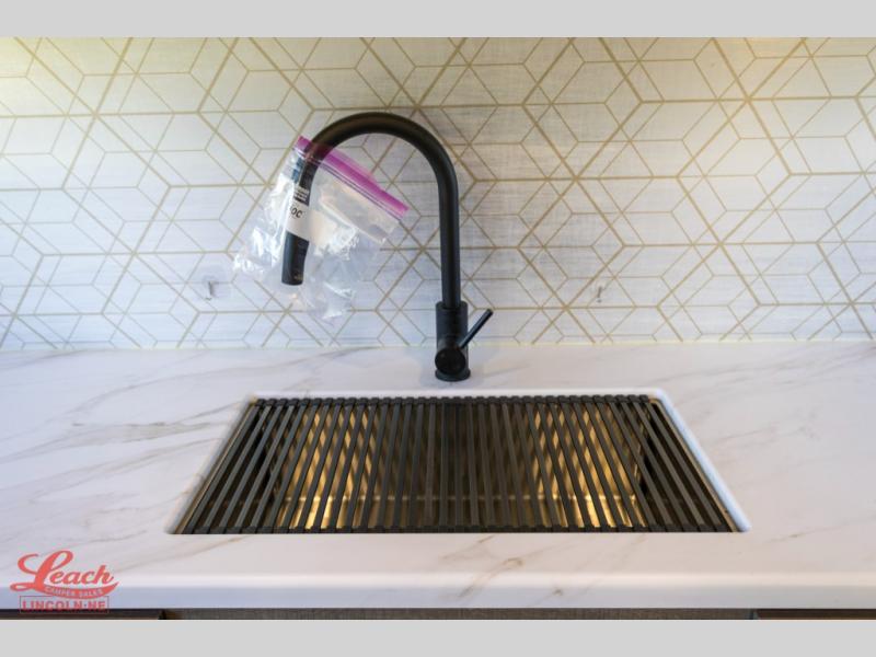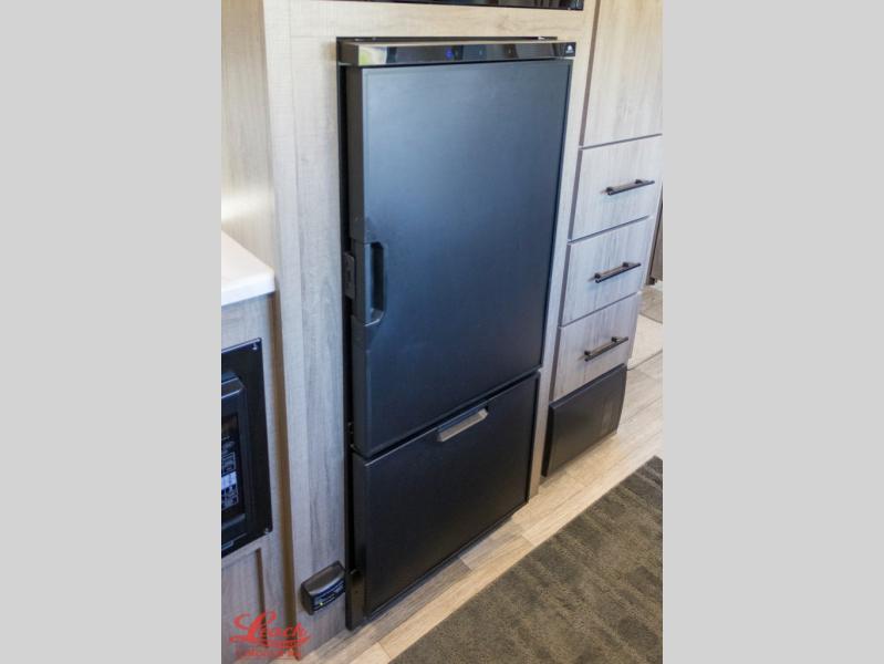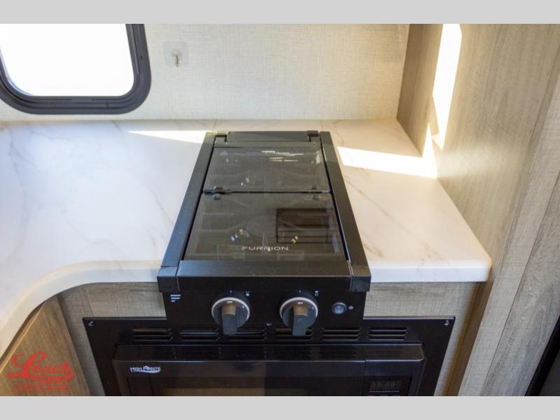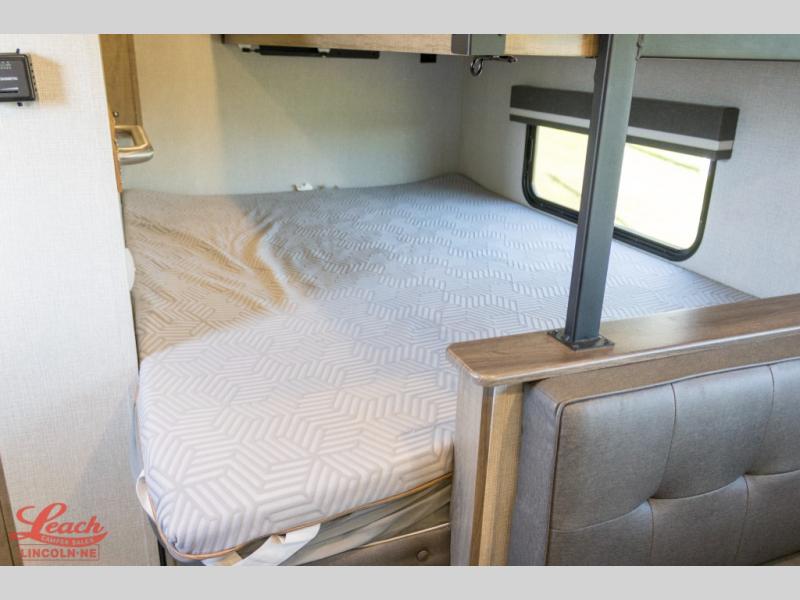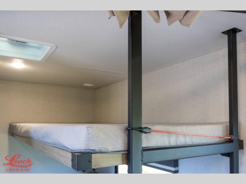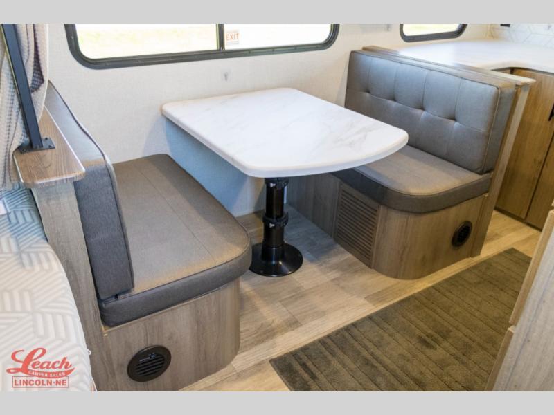 Your small family will have a fun time camping in this travel trailer! There is a queen bed below a 40" x 80" flip top bunk above it for comfortable sleeping spaces. You could even transform the booth dinette into an extra sleeping space when you aren't using it to enjoy a meal prepared with the front kitchen. You could even grill up some burgers on the outside griddle. Underneath the queen bed is a storage portal and the exterior has baggage doors to keep all of your gear out of the way!