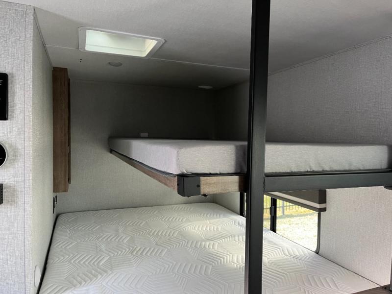 Beyond the bunkhouse, the trailer includes a comfortable main sleeping area that ensures a restful night after a busy day exploring the outdoors. Thoughtful storage options help keep clothing and personal items neatly stowed while enhancing comfort and convenience.