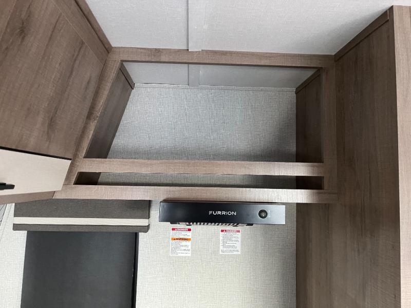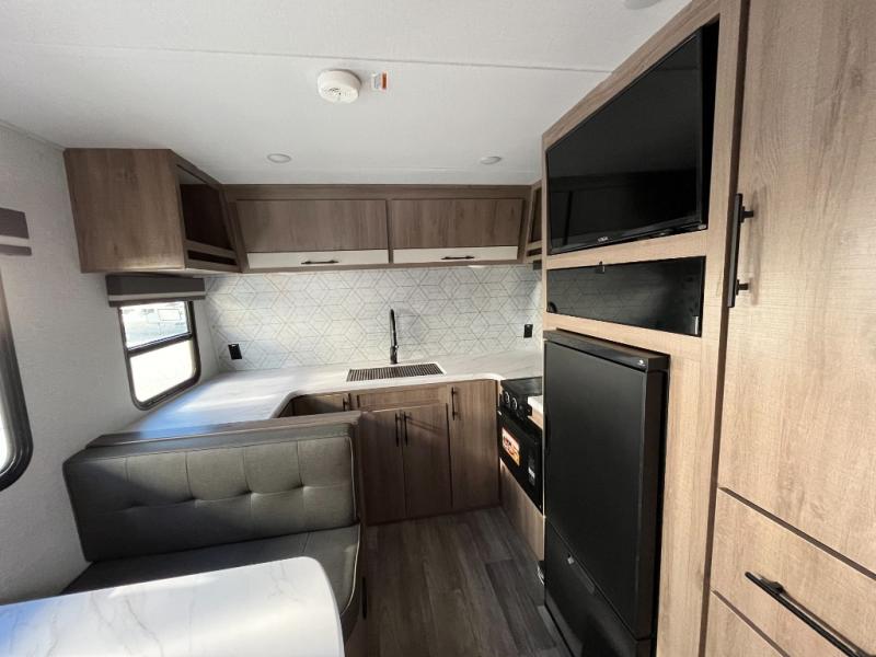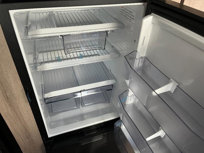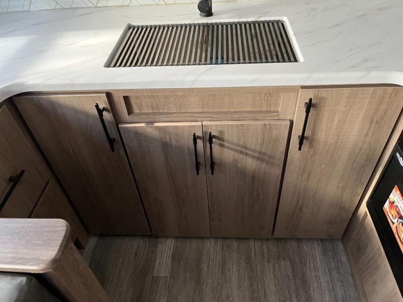 The galley kitchen is equipped to support everyday cooking on the road. Featuring a refrigerator, cooktop, microwave, and plenty of storage space, this kitchen lets you prepare everything from quick breakfasts to hearty dinners with ease. Ample counter space and smart cabinet design keep supplies organized and accessible.