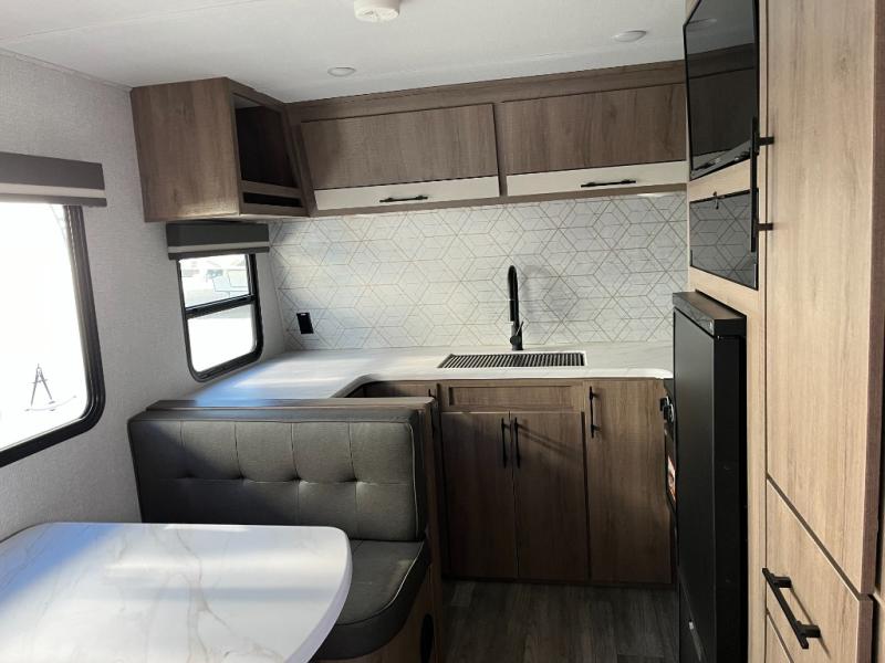 Step inside and you’ll discover a bright, well-organized interior designed to maximize every inch of space. Large windows let in plenty of natural light, creating an open and inviting feel throughout. The multifunctional dinette offers a comfortable spot for meals, games, or planning your next adventure, and converts into extra sleeping space when needed.