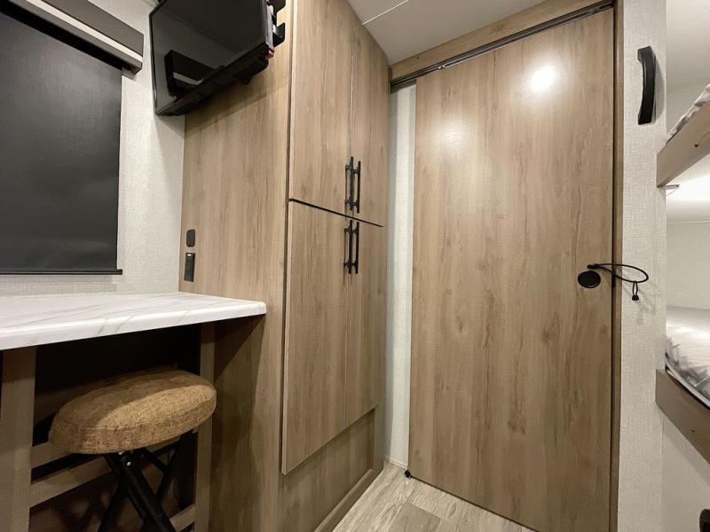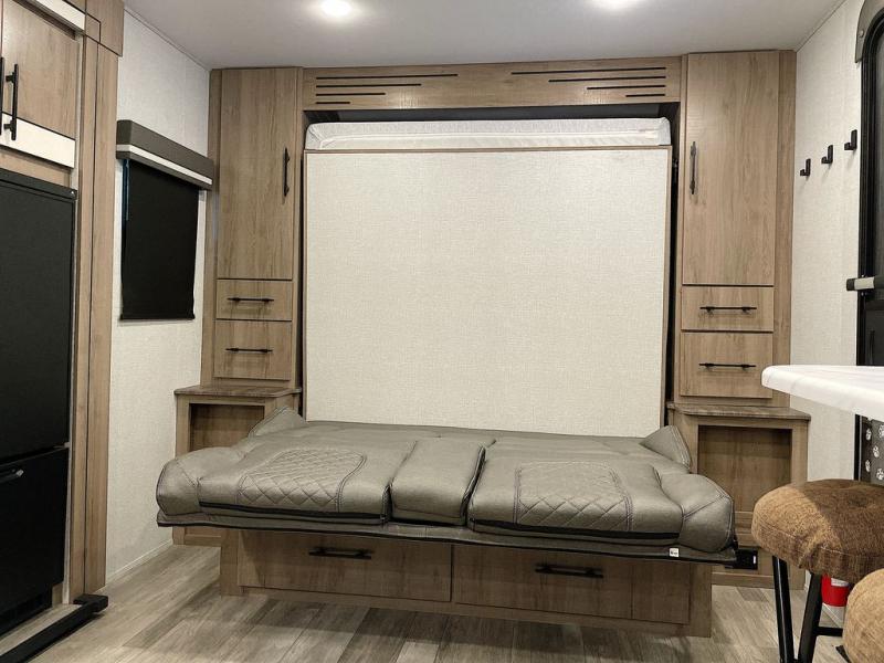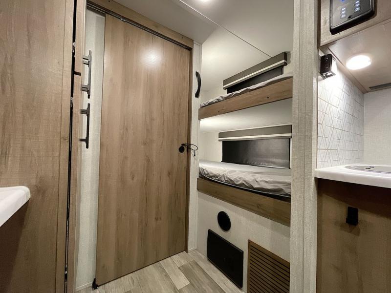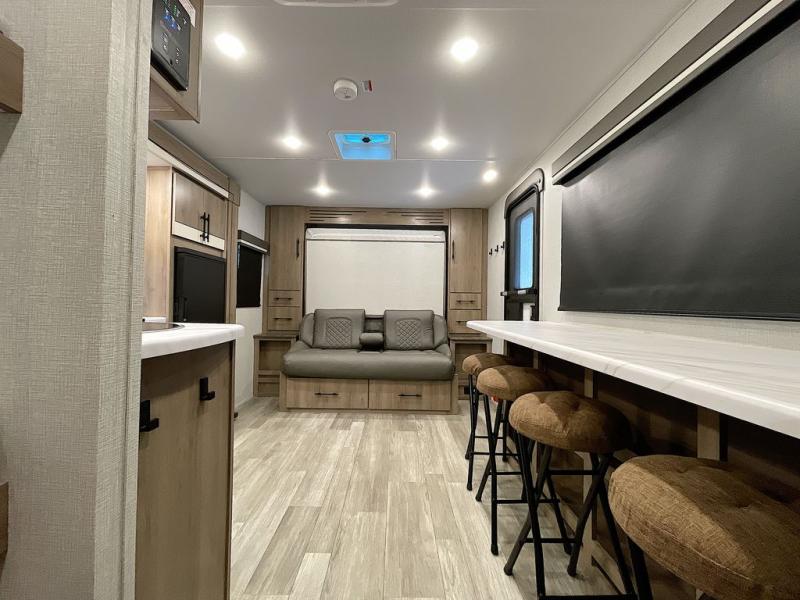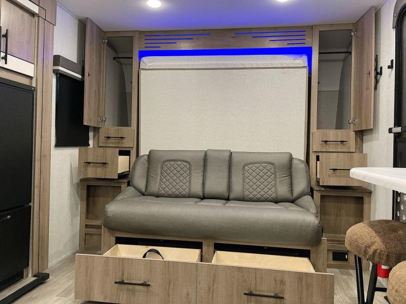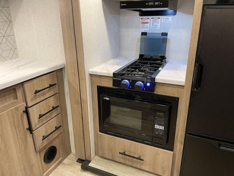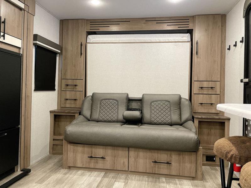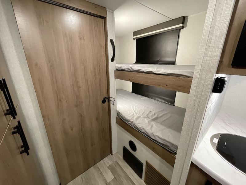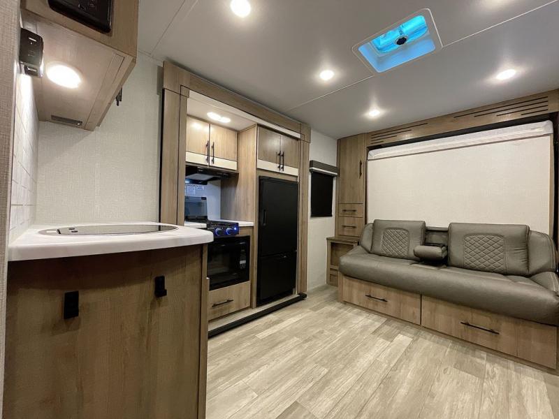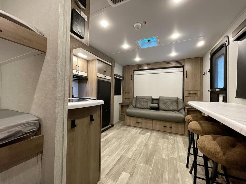 You will feel right at home in this travel trailer! Everyone will have a comfortable place to sleep between the front queen Murphy bed which can transform into a sofa and the 32" x 72" bunk beds. After you have prepared a delicious meal on the two burner cooktop or outside griddle, you can enjoy it at the bar tabletop dinette with four stools for seating. The full bathroom has a walk-in shower with skylight to let in natural lighting and a flip-up sink to save on space!