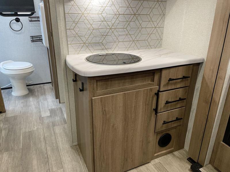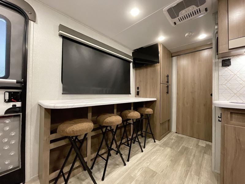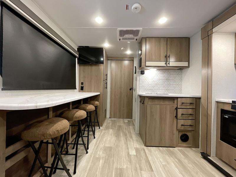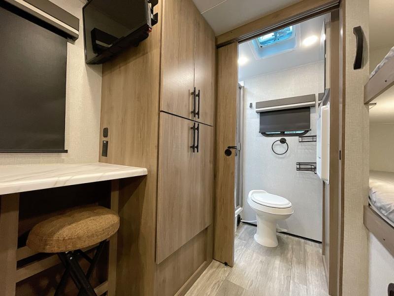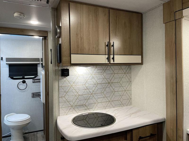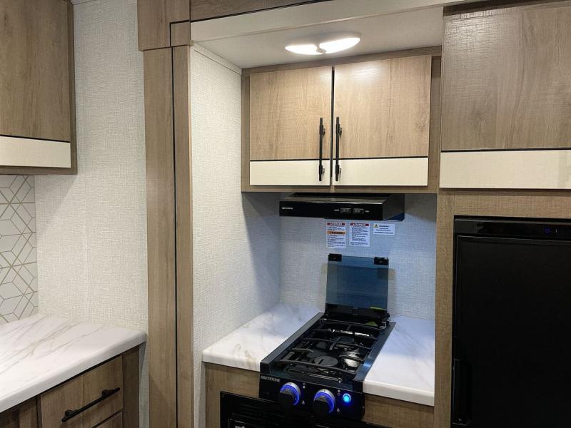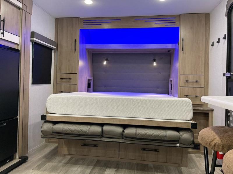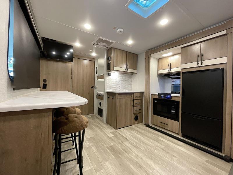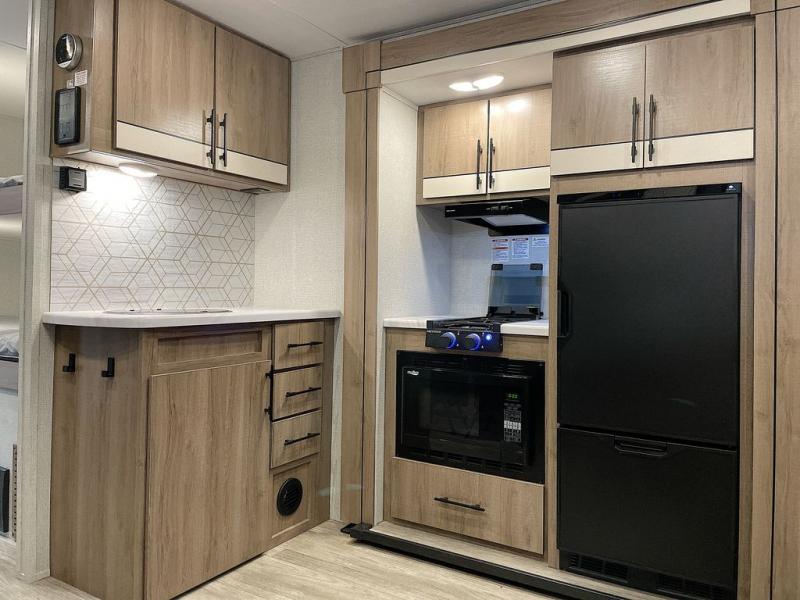 You will feel right at home in this travel trailer! Everyone will have a comfortable place to sleep between the front queen Murphy bed which can transform into a sofa and the 32" x 72" bunk beds. After you have prepared a delicious meal on the two burner cooktop or outside griddle, you can enjoy it at the bar tabletop dinette with four stools for seating. The full bathroom has a walk-in shower with skylight to let in natural lighting and a flip-up sink to save on space!