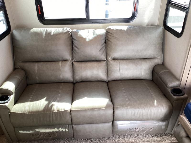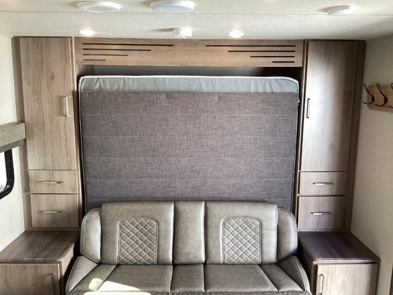Inside, you’ll find a queen Murphy bed that converts into roomy lounge space, a theater-style dinette for dining or relaxing, and a full bath for comfort on the road. Additional highlights include a large panoramic window, residential-style cabinetry, and thoughtfully designed storage so your gear stays organized.