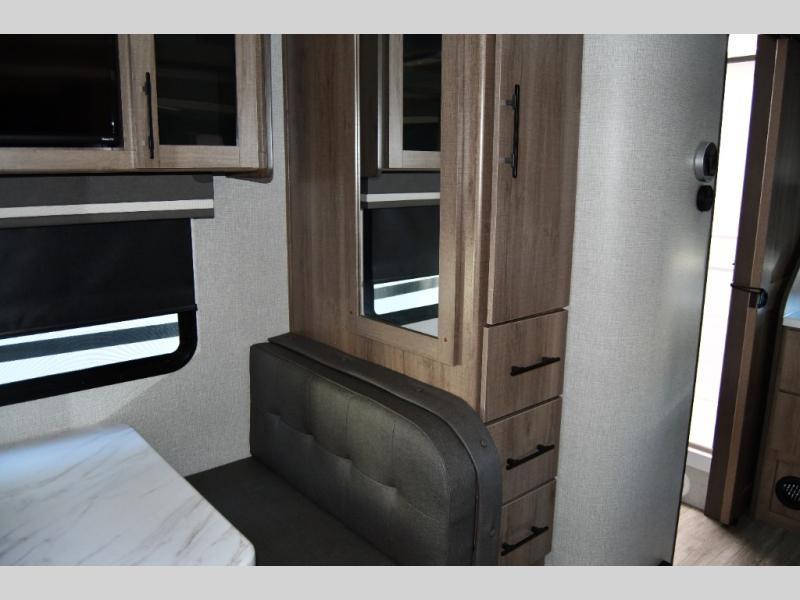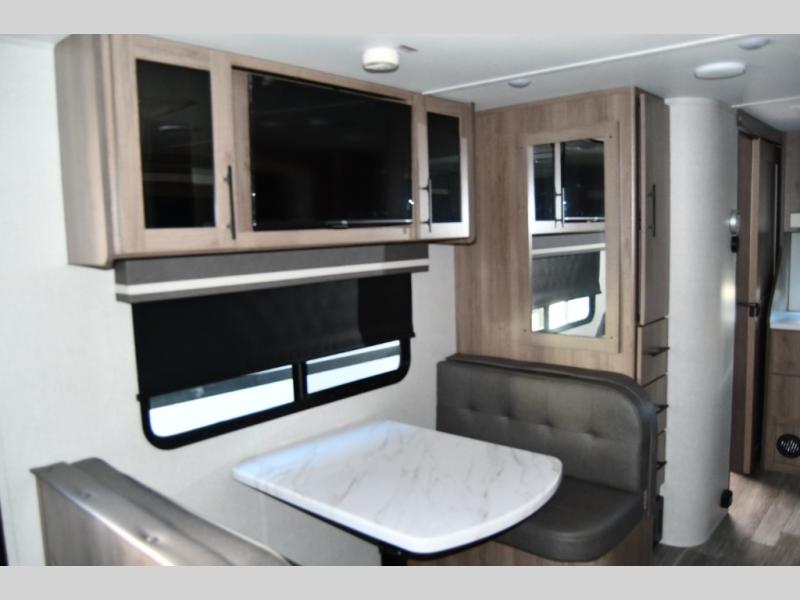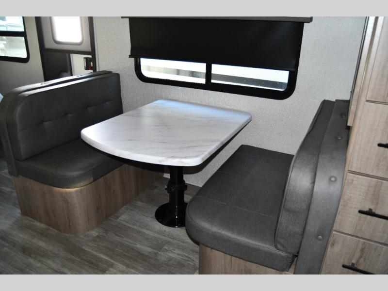 This Imagine XLS travel trailer has theater seating and a booth dinette that you can use any time you need a little break from the outdoors. If you want to come in and grab a coffee, put together a puzzle, or work on your itinerary for the week, just put up your feet and relax. You could even switch on the LED HDTV if you want a little entertainment. The front queen-size bed has a privacy curtain that you can draw to create a semi-private bedroom, and in the back of the trailer you will find the rest of your amenities, like the kitchen and the bathroom. The large slide makes it easy to enjoy spending your time indoors, but if you do want to get back outside, you can sit underneath the 18' electric awning for some shade.