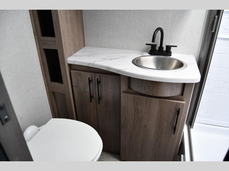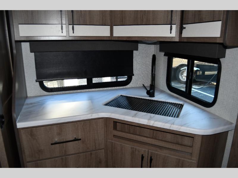 The kitchen is designed for efficiency and convenience, featuring solid-surface countertops, a cooktop, microwave, refrigerator, and generous storage. Whether you’re preparing quick meals or enjoying longer stays, this kitchen makes cooking on the road easy and enjoyable.