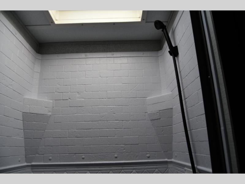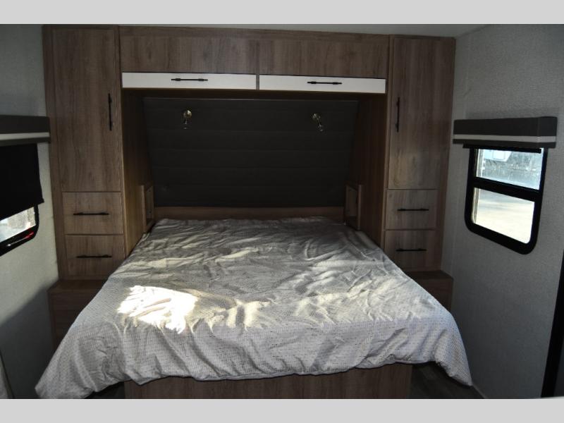The front private bedroom provides a comfortable retreat with a walk-around bed and ample storage. The full bathroom includes a spacious shower, sink, toilet, and smart storage solutions, offering all the comforts you need wherever your travels take you.