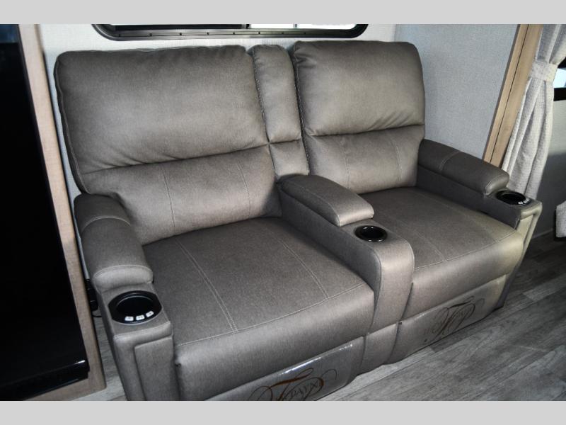 Step inside and you’ll immediately appreciate the open, inviting layout. The rear living area offers comfortable seating with theater-style recliners, large windows, and an entertainment center that creates the perfect space to relax after a day of adventure. High-quality cabinetry, durable flooring, and modern finishes give this travel trailer a refined, residential feel.