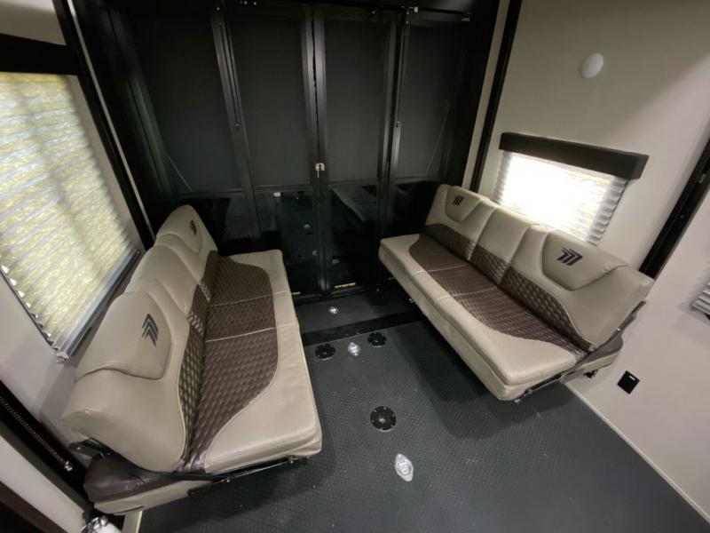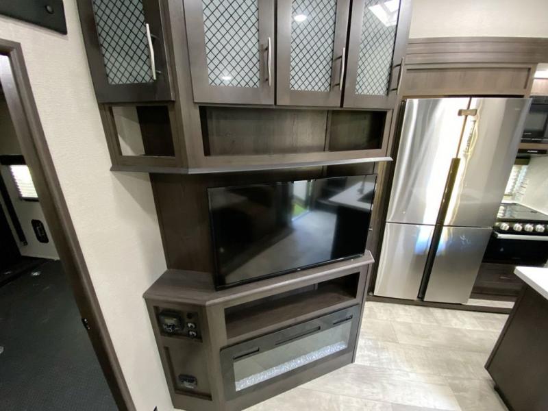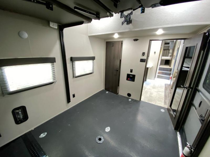 Are you looking forward to arriving at your destination, unloading your toys from an 11' separate garage, and heading out to the dunes? You can return to this Momentum G-Class toy hauler afterwards to find the convenience of having a full and half bath, two entry doors, and a loft bed. The rear ramp door can even be converted into a patio, plus there are exterior speakers to keep the party going! You will also appreciate the separate living area with a fireplace, theater seating slide, and full kitchen amenities. The front bedroom offers an escape to rest and relax for the next ride. Take a look outside and inside because you will be sold!