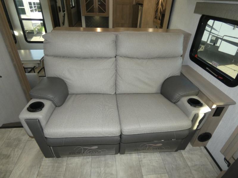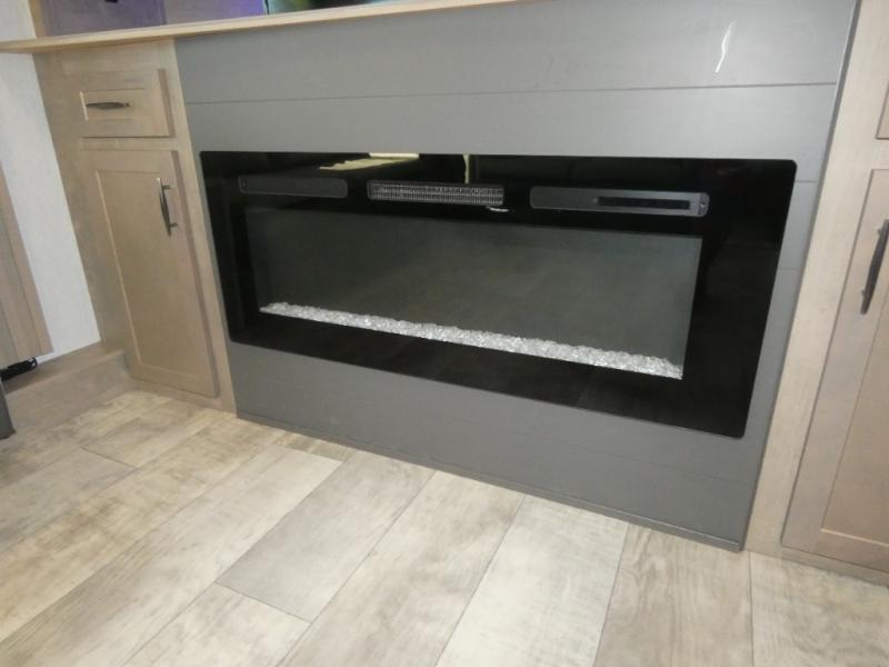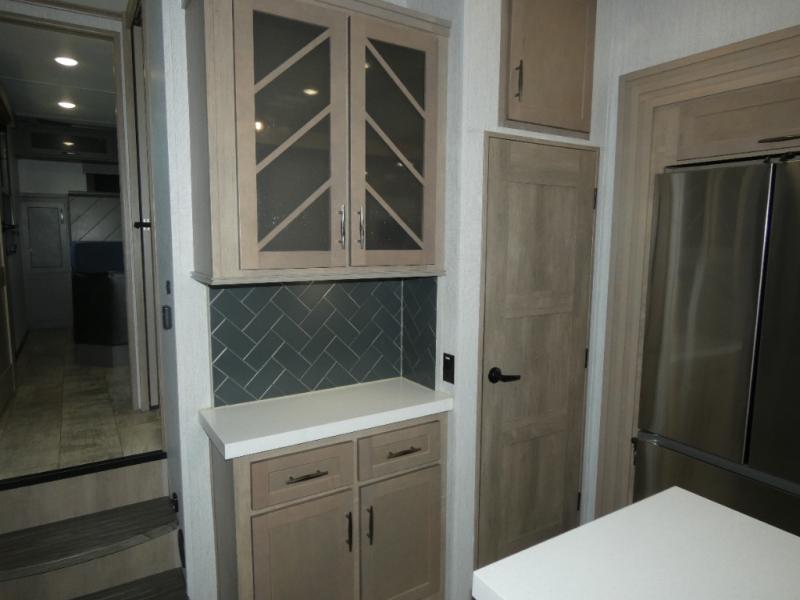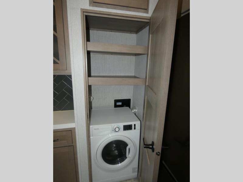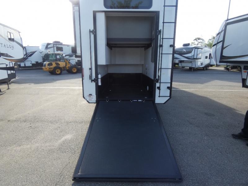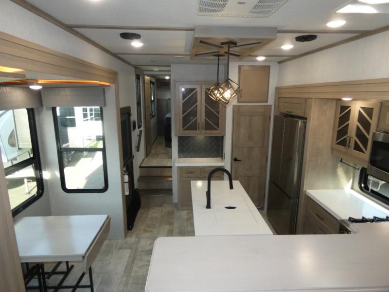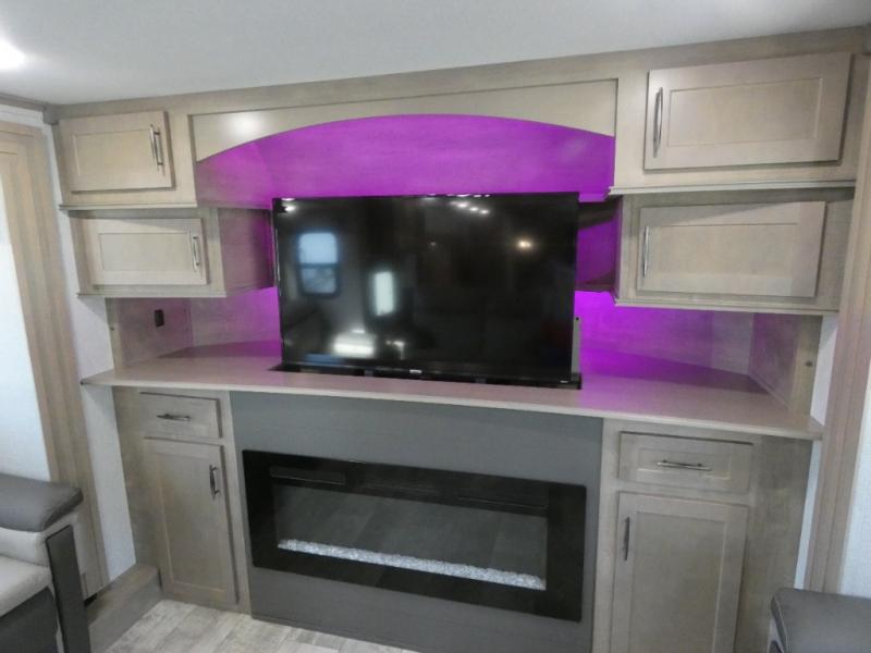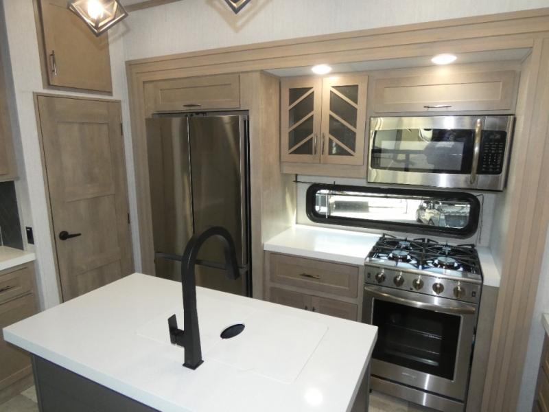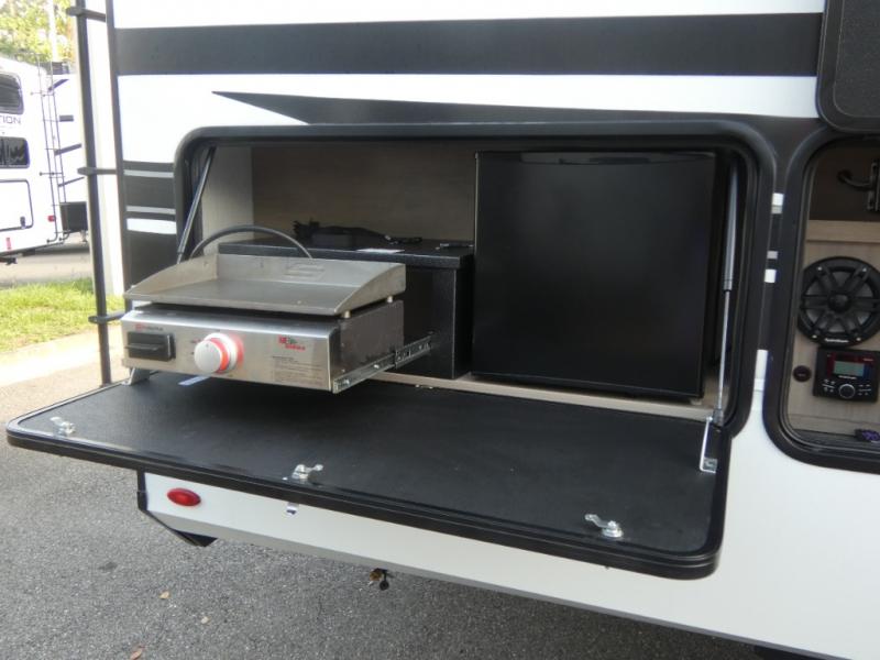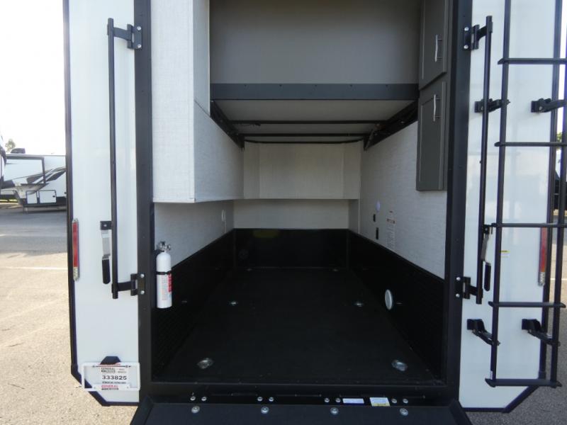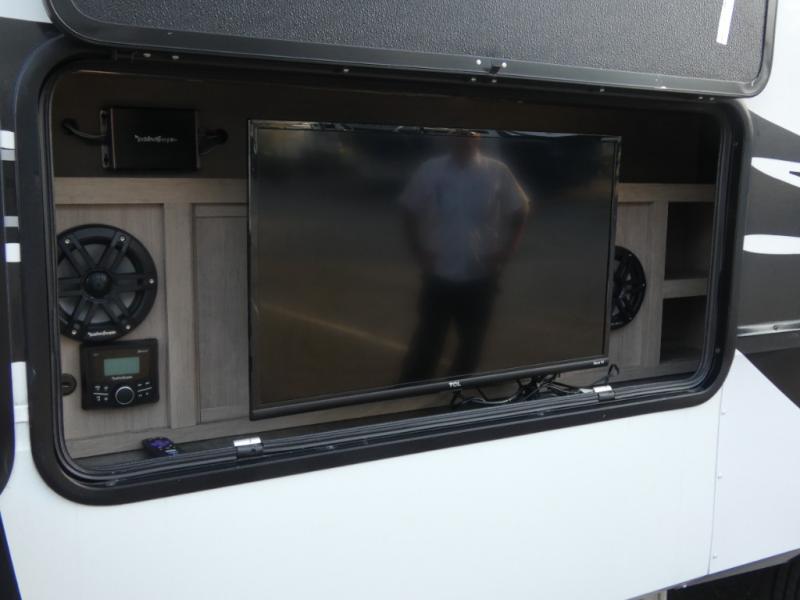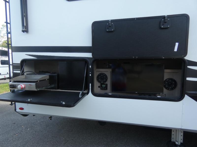 This unique fifth wheel offers a below-floor garage for your toy(s), an outside kitchen and LED TV, two pass-through compartments and two awnings! The front, separate living area gives you a place to relax with opposing tri-fold sofa slides and theatre seating across from the telescoping LED TV with a fireplace below. The separate kitchen is spacious as well and includes a kitchen island with stools, a hutch and a desk, plus a free standing dinette within a slide out. The pantry even has a space for a washer/dryer to keep the linens clean. You will enjoy dual access to the full bath, and the rear bedroom provides a walk-around queen bed or choose the king option, plenty of storage and USB charging outlets.