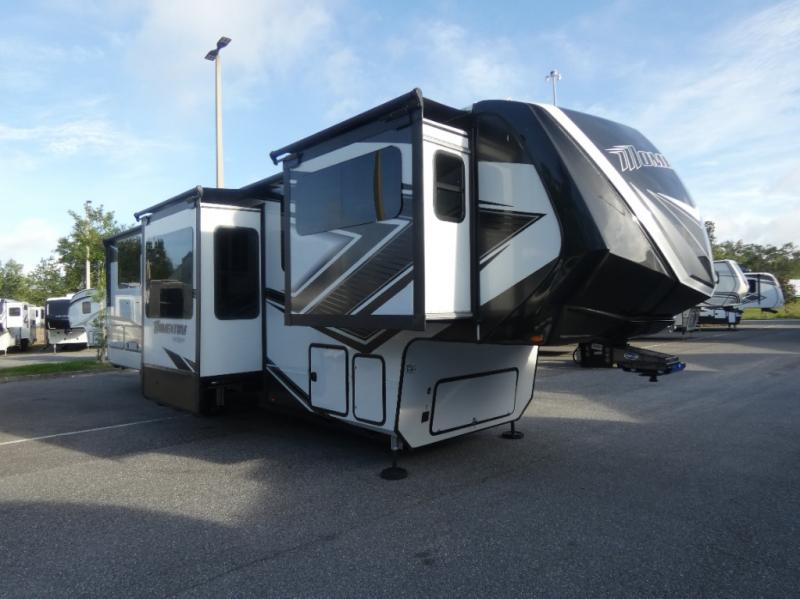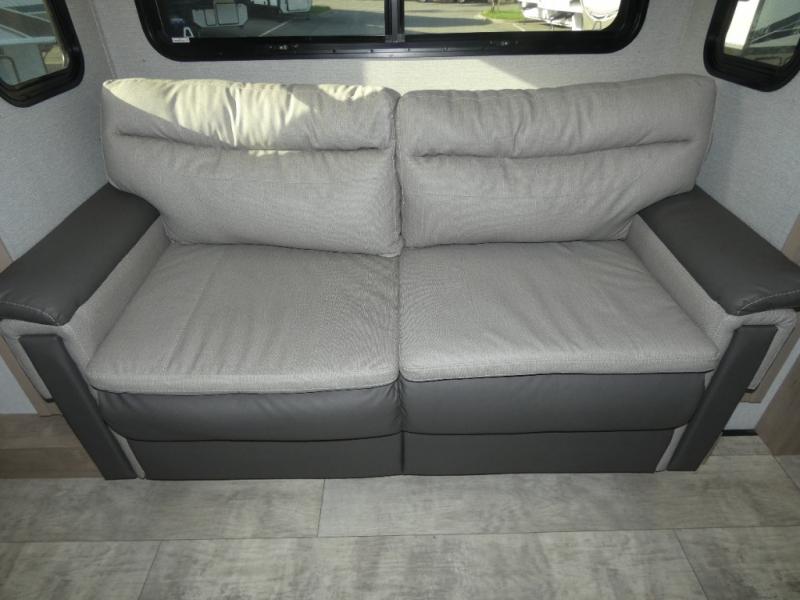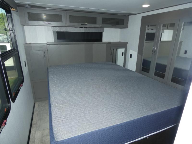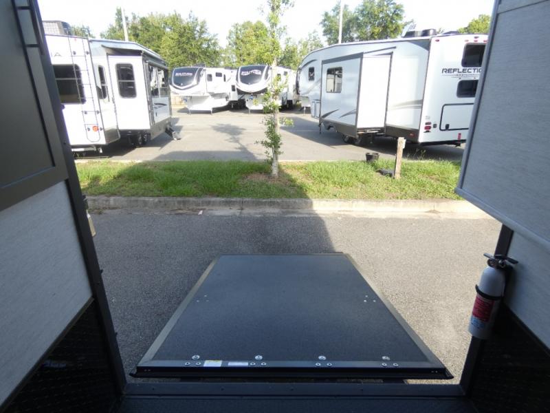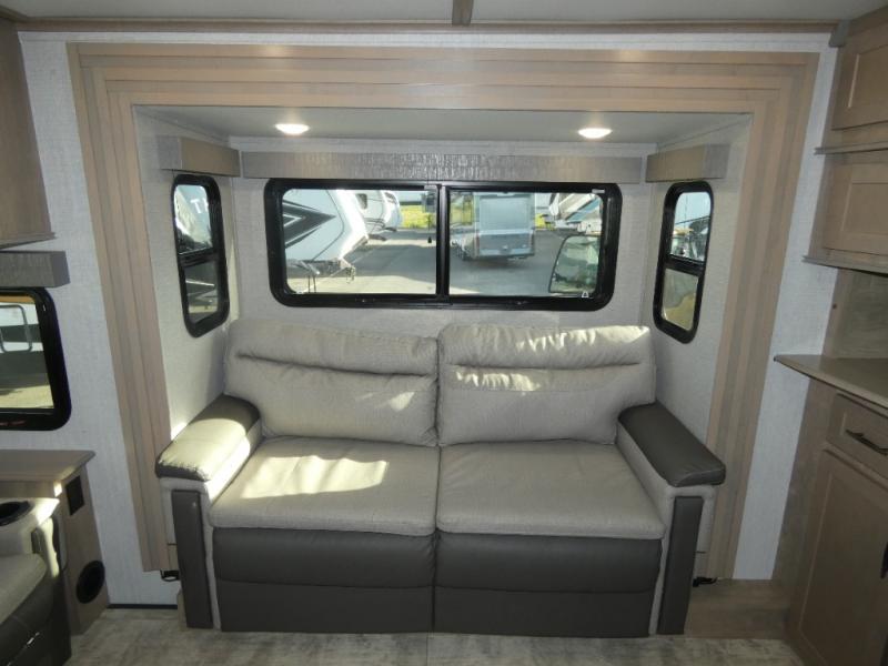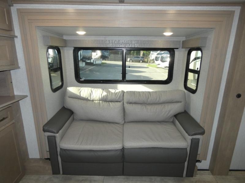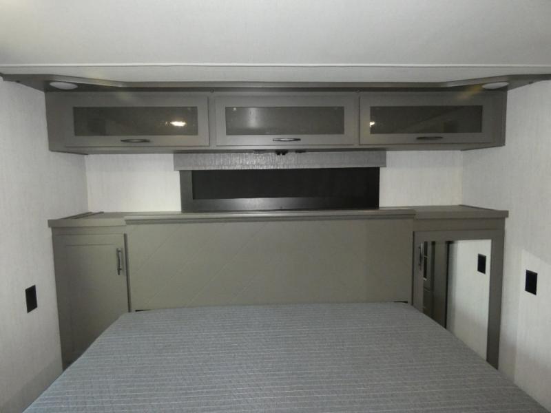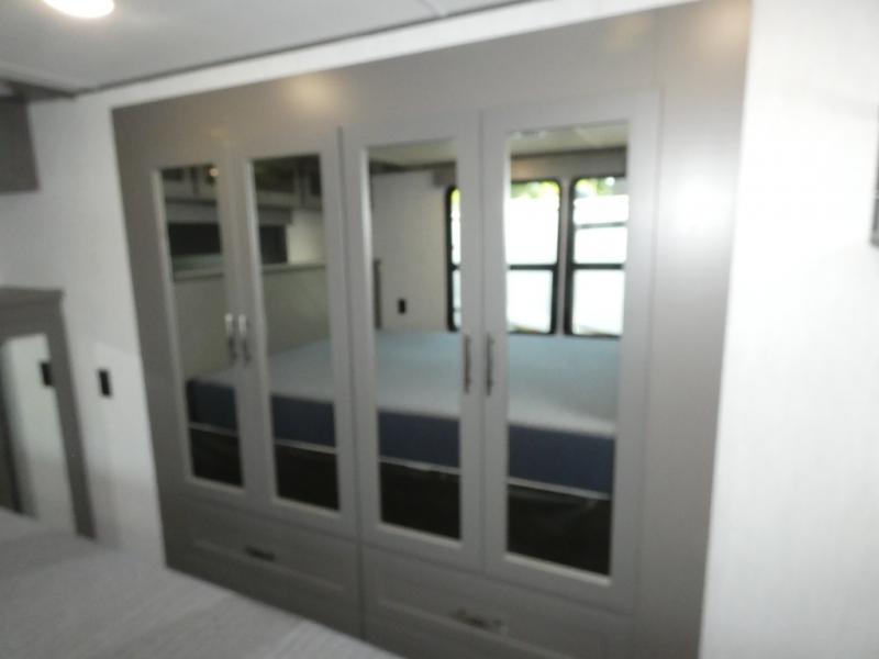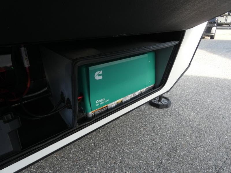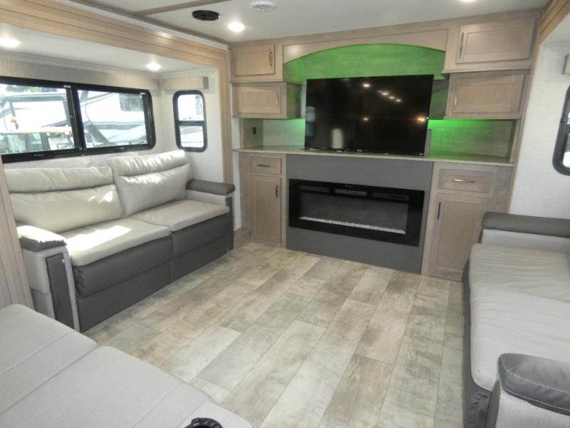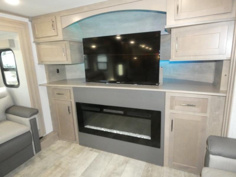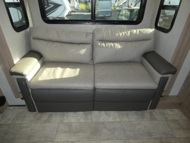 This unique fifth wheel offers a below-floor garage for your toy(s), an outside kitchen and LED TV, two pass-through compartments and two awnings! The front, separate living area gives you a place to relax with opposing tri-fold sofa slides and theatre seating across from the telescoping LED TV with a fireplace below. The separate kitchen is spacious as well and includes a kitchen island with stools, a hutch and a desk, plus a free standing dinette within a slide out. The pantry even has a space for a washer/dryer to keep the linens clean. You will enjoy dual access to the full bath, and the rear bedroom provides a walk-around queen bed or choose the king option, plenty of storage and USB charging outlets.