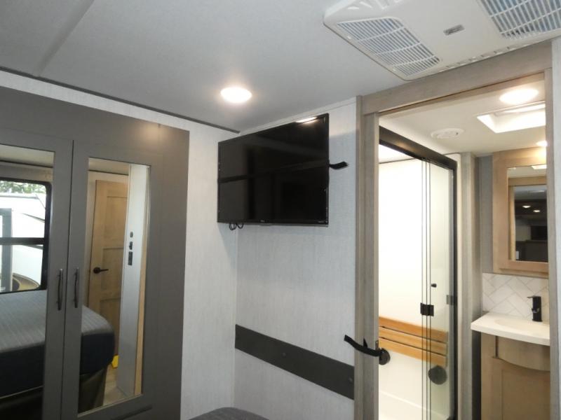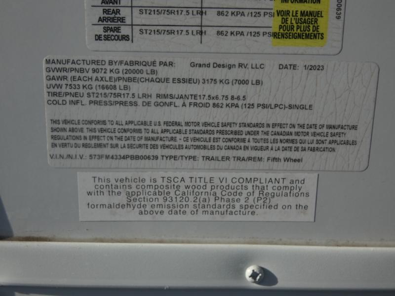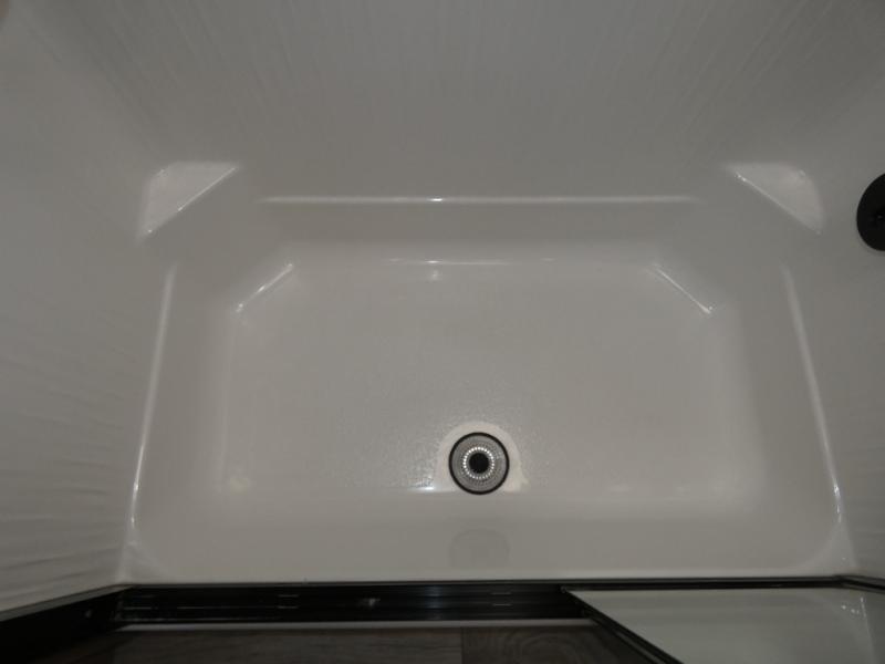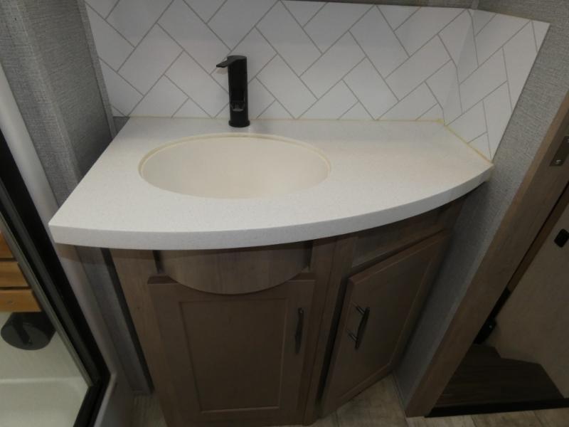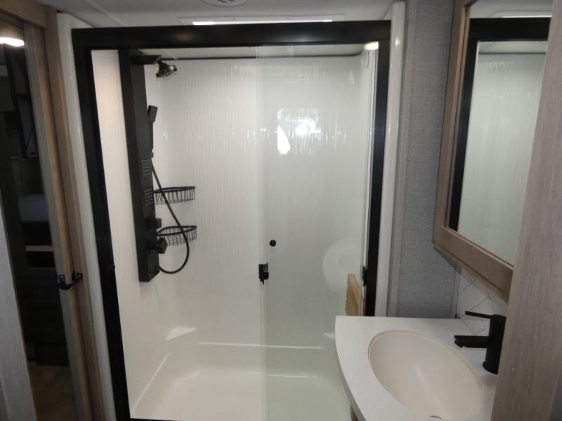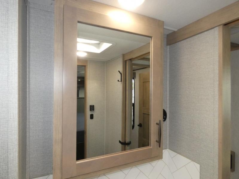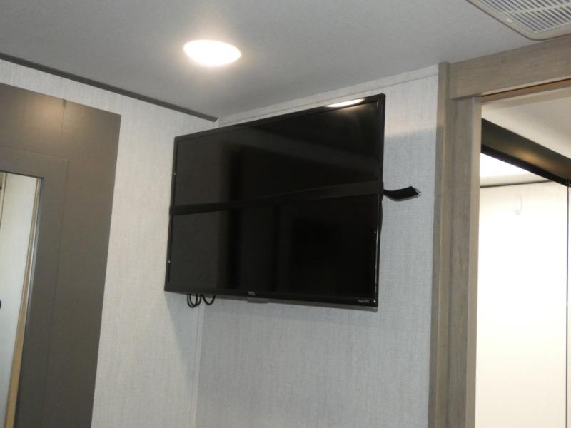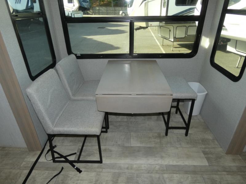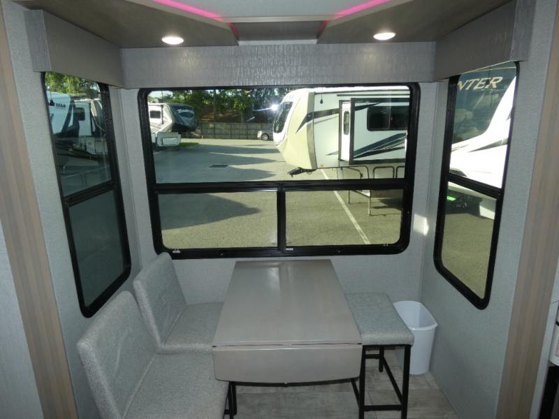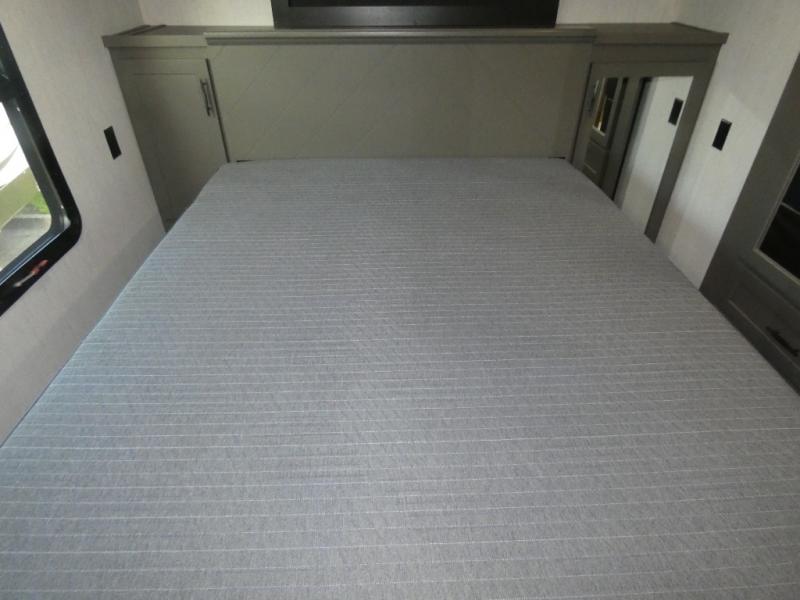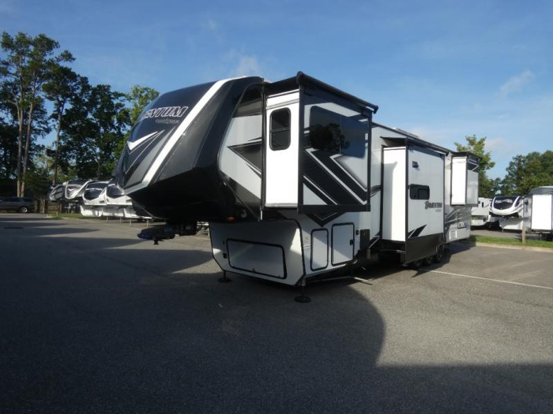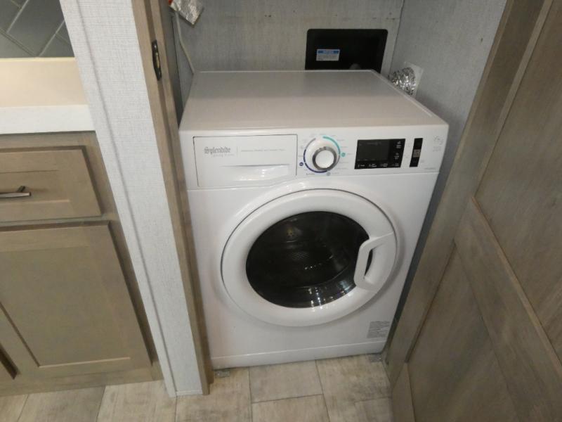 This unique fifth wheel offers a below-floor garage for your toy(s), an outside kitchen and LED TV, two pass-through compartments and two awnings! The front, separate living area gives you a place to relax with opposing tri-fold sofa slides and theatre seating across from the telescoping LED TV with a fireplace below. The separate kitchen is spacious as well and includes a kitchen island with stools, a hutch and a desk, plus a free standing dinette within a slide out. The pantry even has a space for a washer/dryer to keep the linens clean. You will enjoy dual access to the full bath, and the rear bedroom provides a walk-around queen bed or choose the king option, plenty of storage and USB charging outlets.