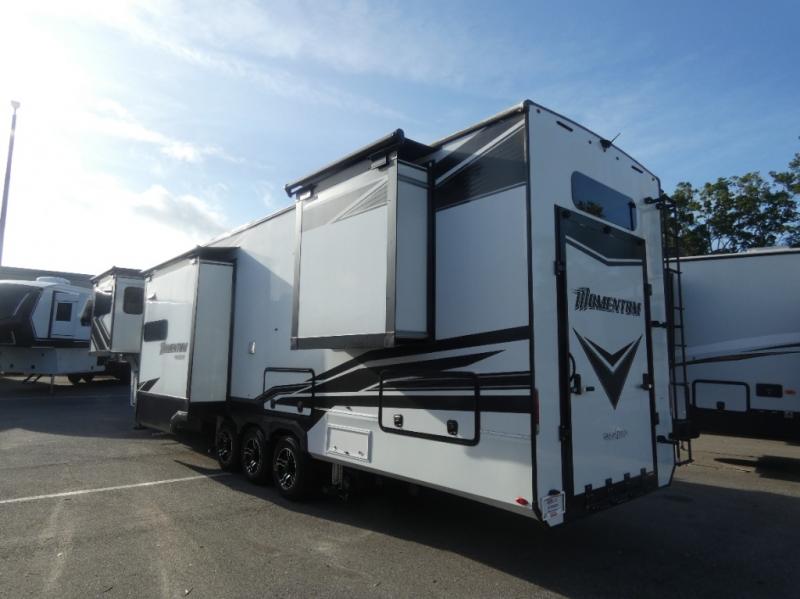 The Momentum fifth wheel toy haulers by Grand Design are built for four seasons of travel with your off-road toys and include luxurious accommodations throughout for extreme living! Each is constructed to a superior standard with the thermal roof design, the full-laminated walls, and the triple insulated garage floor. The MORryde CRE3000 suspension system and rubber pin box, plus the upgraded axle hangers provide the performance and smooth towing you desire, while the interior offers luxury such as color changing LED accent lighting, raised panel hardwood cabinet doors with hidden hinges, and a central vacuum system. Each toy hauler also includes four packages, including the Garage Package with Tuff-Ply gas and oil resistant flooring, the Weather-Tek Package with a Stealth AC System, and the Interior Luxury Package with solid surface countertops!