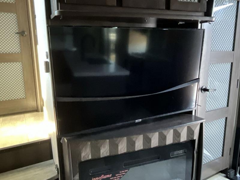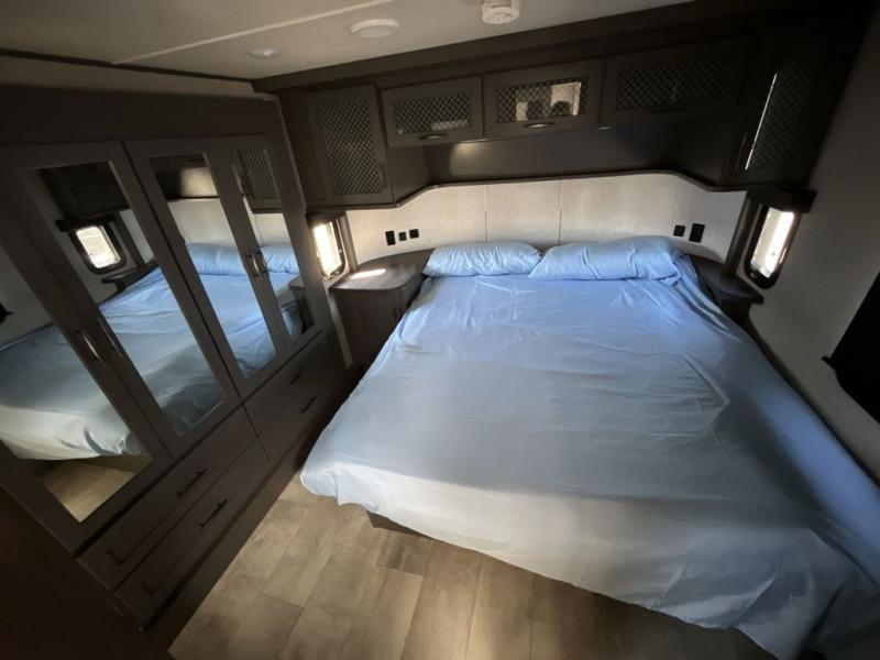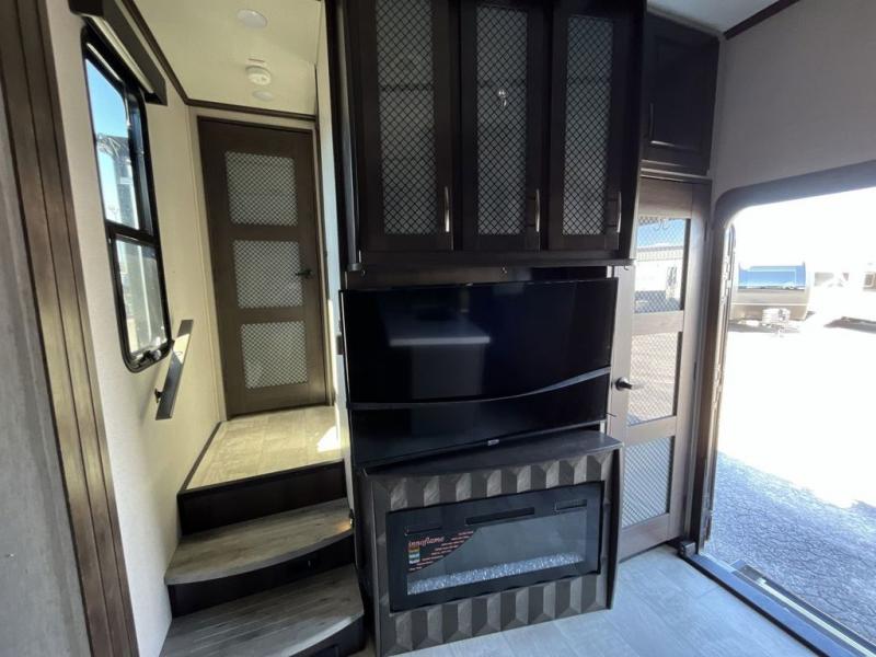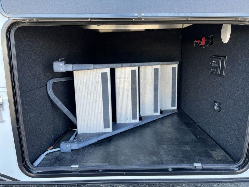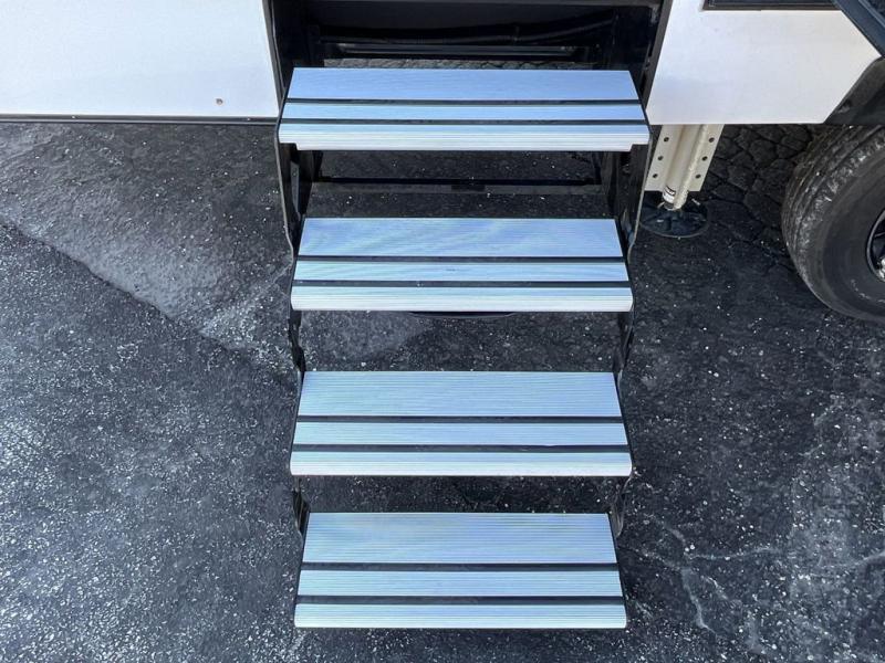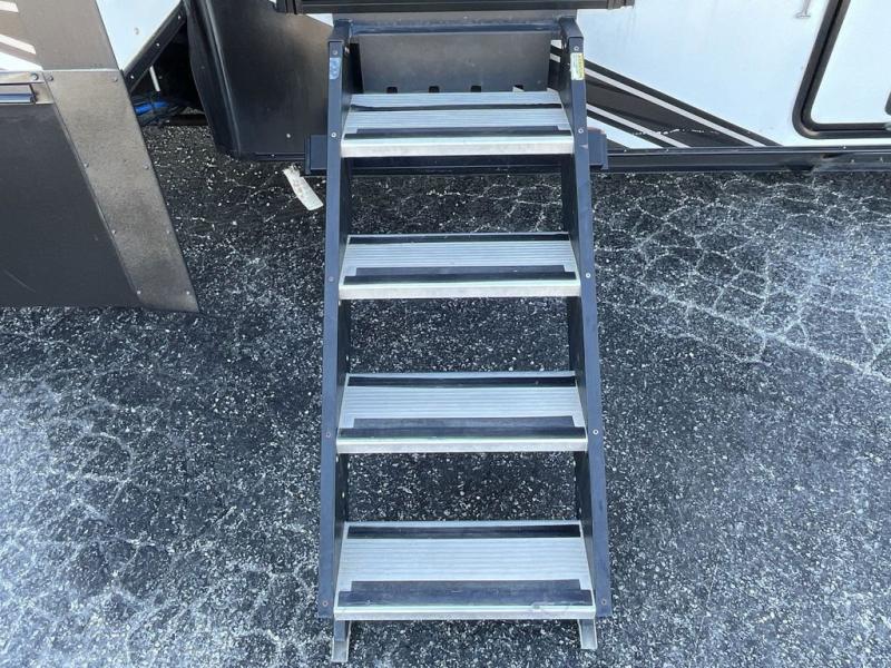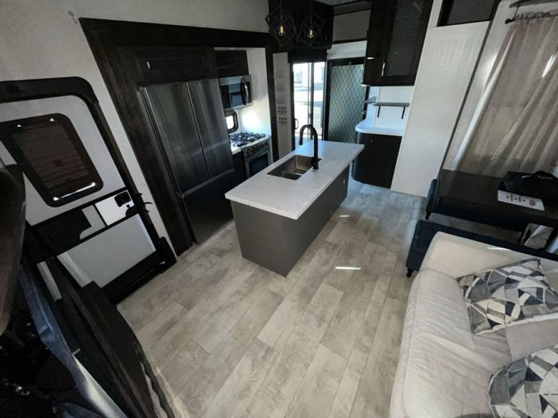 Get ready for a lot of fun when you head out to the off-road park, a special event, or a long trip with your toys! You will love the garage with the Fast Ramp rear ramp door, the Ram-Air garage vents on both sides, the 2,500 lb. rated flush-mount tie-downs and the protective diamond plate on the garage sidewalls. This area can become a bedroom or an extra living area if you want to add Happi-Jac rollover sofas/table with a top bed option, plus you will already have a half bath for convenience, an LED TV and storage for your gear. The living and kitchen area is spacious with dual slides and a kitchen island with bar stools, a free standing table and theatre seating or choose the super sofa option, and everything you need to feed everyone. The fold-down side patio offers an LED TV, storage and a great place to relax outdoors above ground. There are many more features to enjoy, and several options to customize your fifth wheel.