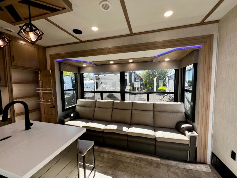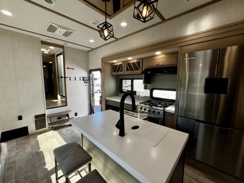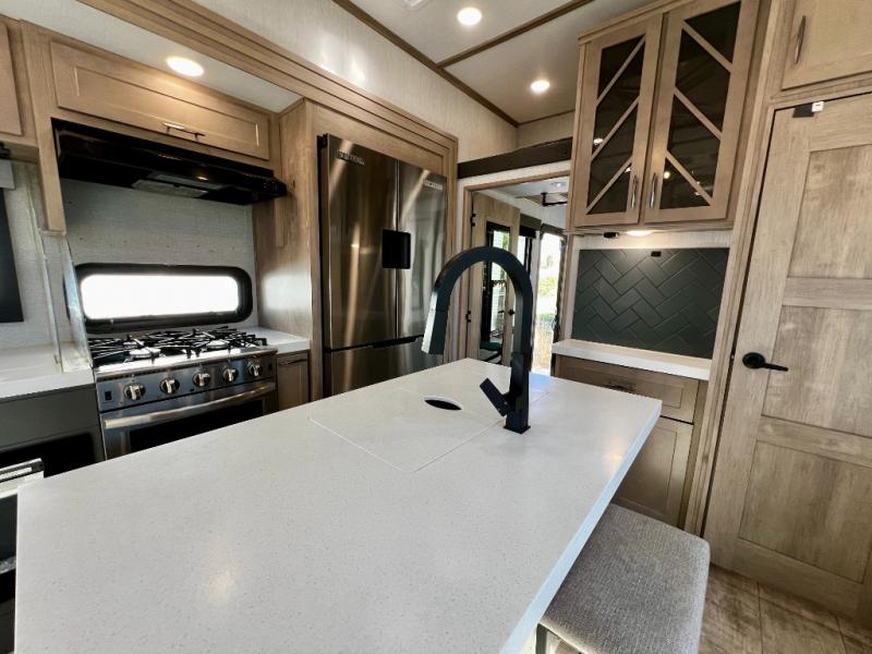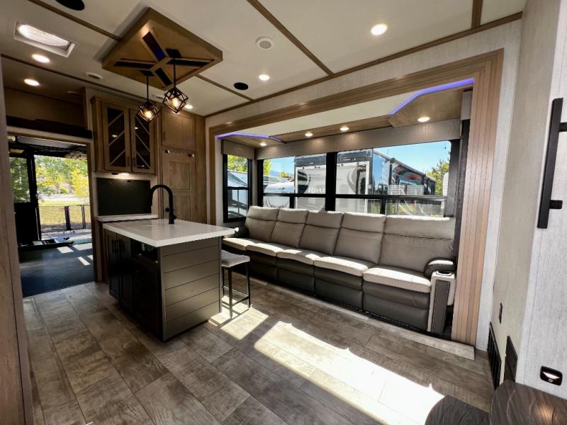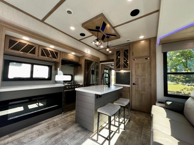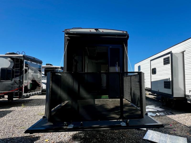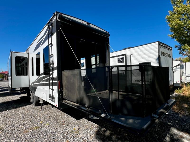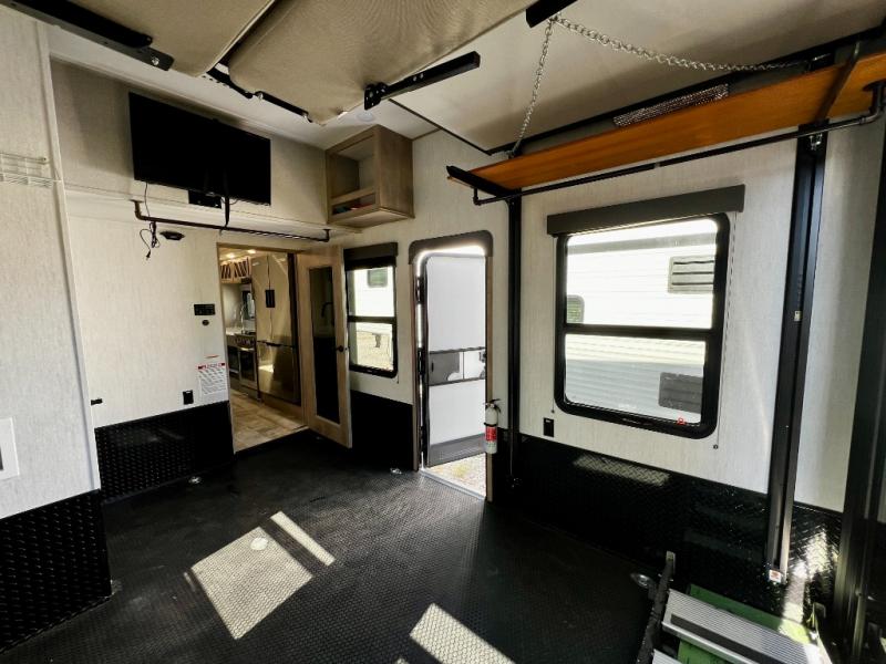 There is much to love about this fifth wheel toy hauler! Starting with the 13' 6" garage that comes with Happi-jac rollover sofas with table and an optional top bed above them, an overhead bed, an LED TV, one of the dual entry doors, and an optional half bath to add. You will also love the ramp door/patio for entertainment at night. The chef will love cooking in the kitchen with a hutch, three burner cooktop, and an island with a flip-up countertop and two bar stools for extra helpers. The rest of the group can socialize together at either the free standing dinette or at the chaise lounge with pull-out sofa across from the entertainment center with an LED TV and fireplace. As you head to the front of the unit, you will pass through the separated bathroom with a private toilet and a shower with a flip-up teak seat. It enters directly into the front private bedroom where there is a queen bed slide to lay your head on at night, a front wardrobe prepped to add an optional washer and dryer, and a flip-up dresser with TV prep above it!