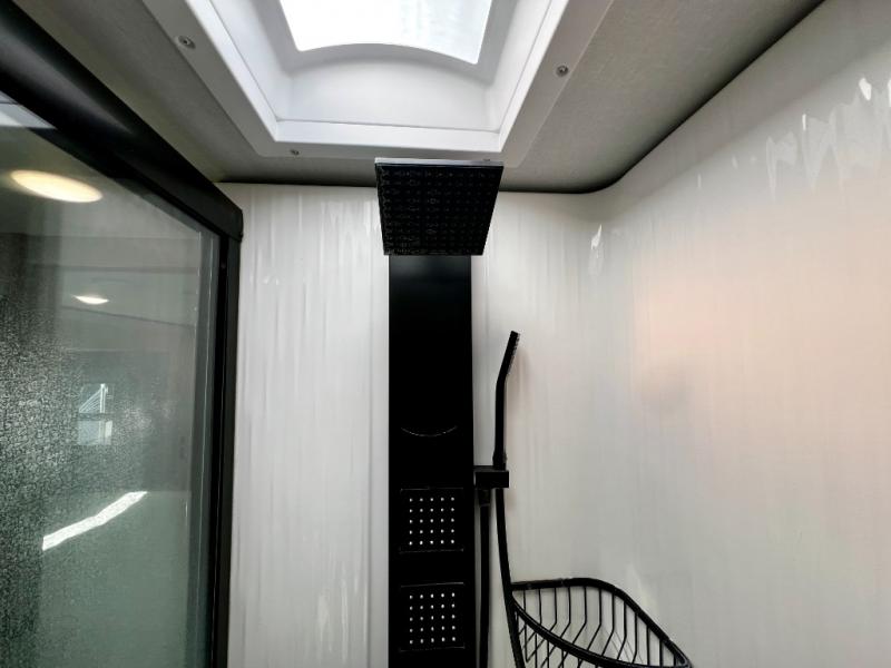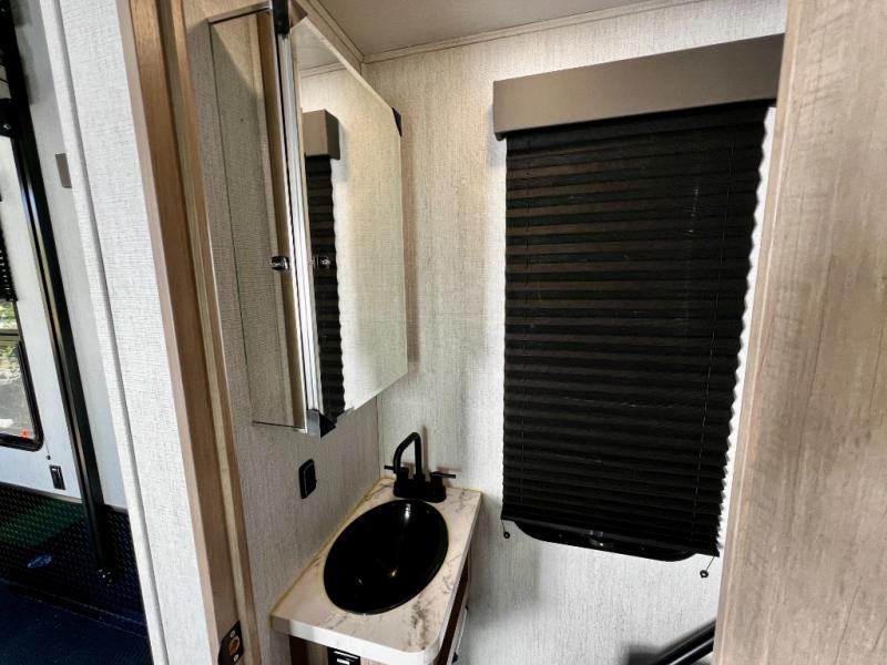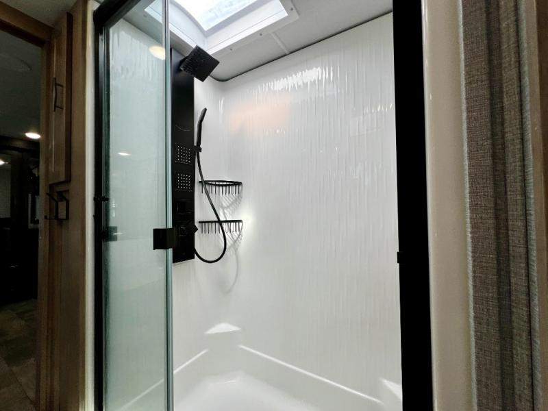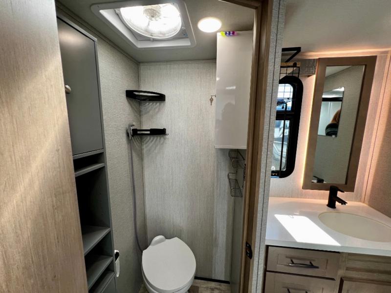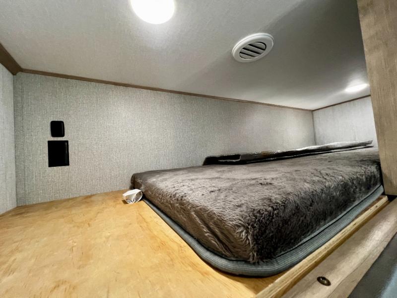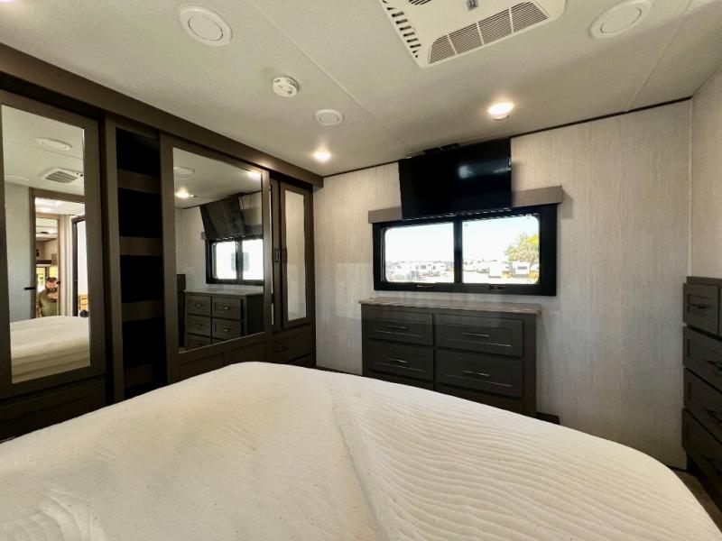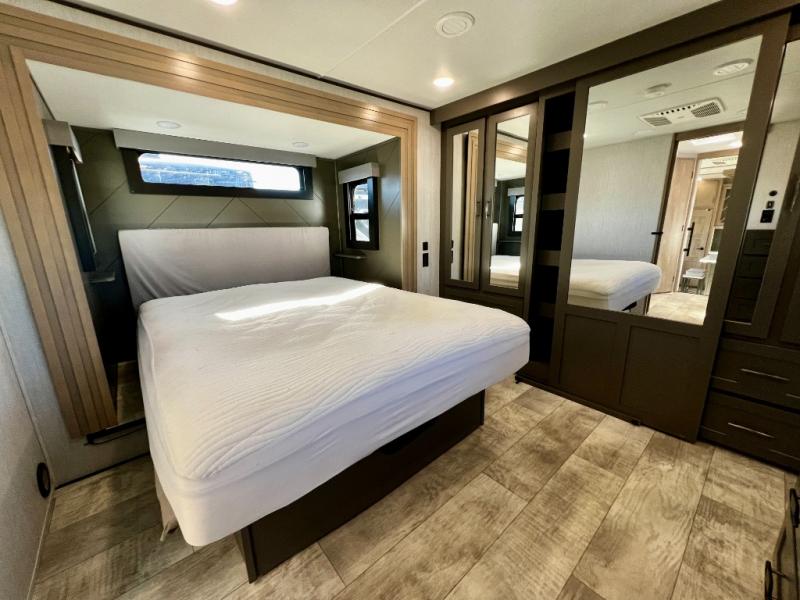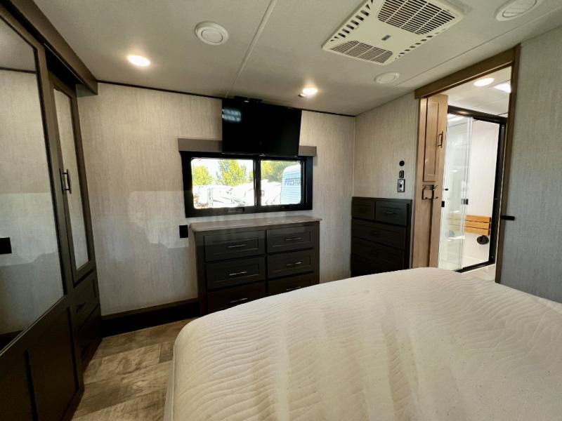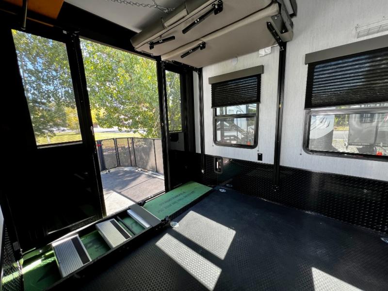 There is much to love about this fifth wheel toy hauler! Starting with the 13' 6" garage that comes with Happi-jac rollover sofas with table and an optional top bed above them, an overhead bed, an LED TV, one of the dual entry doors, and an optional half bath to add. You will also love the ramp door/patio for entertainment at night. The chef will love cooking in the kitchen with a hutch, three burner cooktop, and an island with a flip-up countertop and two bar stools for extra helpers. The rest of the group can socialize together at either the free standing dinette or at the chaise lounge with pull-out sofa across from the entertainment center with an LED TV and fireplace. As you head to the front of the unit, you will pass through the separated bathroom with a private toilet and a shower with a flip-up teak seat. It enters directly into the front private bedroom where there is a queen bed slide to lay your head on at night, a front wardrobe prepped to add an optional washer and dryer, and a flip-up dresser with TV prep above it!