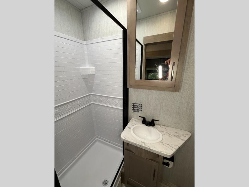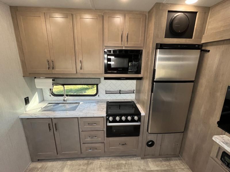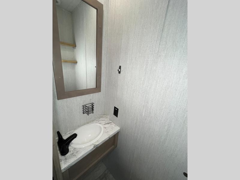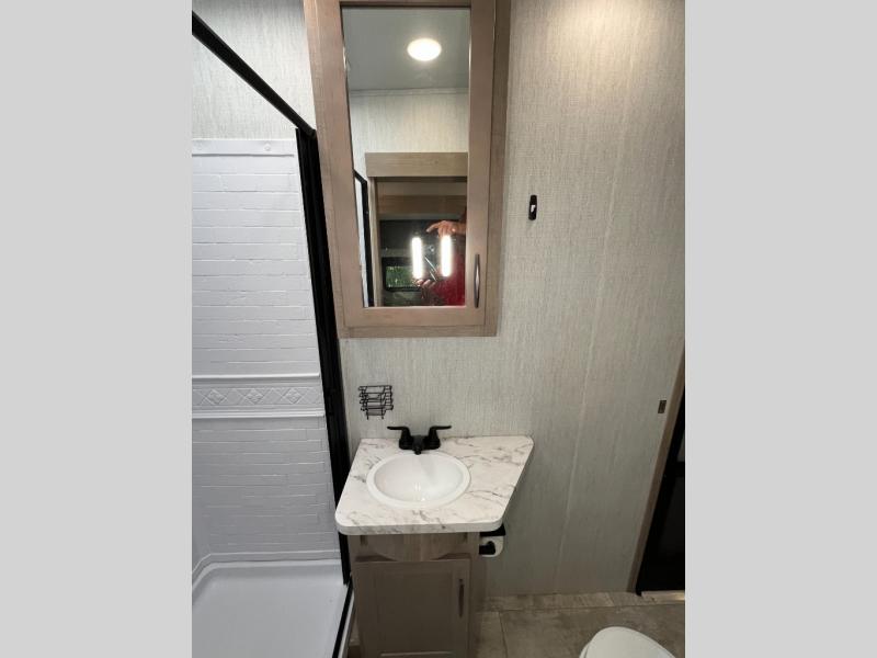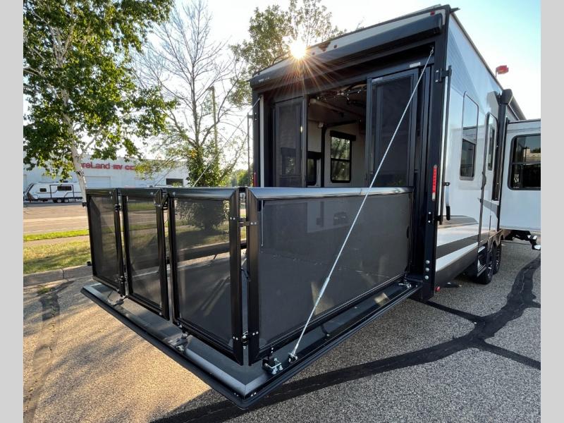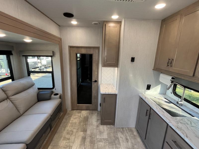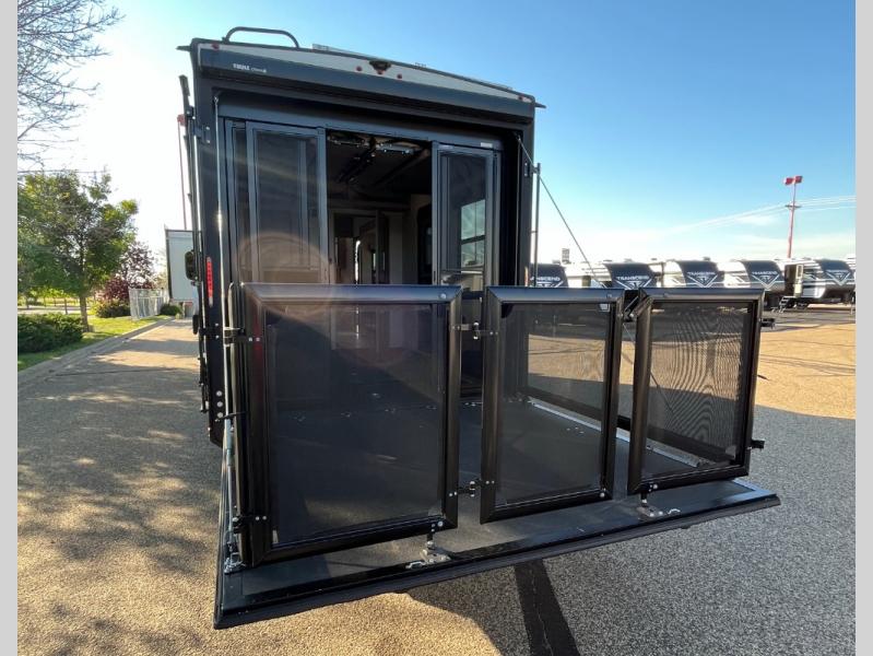 Start your engines for a fun weekend with your toys and your family in this Momentum G-Class toy hauler. The 11' separate garage includes Happi-Jac rollover sofas with a table, a top bunk for the kids, plus a half bath! There is even a second entry door which leads directly into the garage so that you don't have to walk through the entire trailer just to get to your cargo. Now that's helpful! In the front of this unit, you will have your own master suite that has private access to the residential walk-in shower in the dual-entry bathroom. The main living and kitchen area offers everything you need and would want, plus more. This is the one!