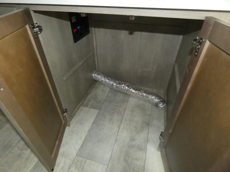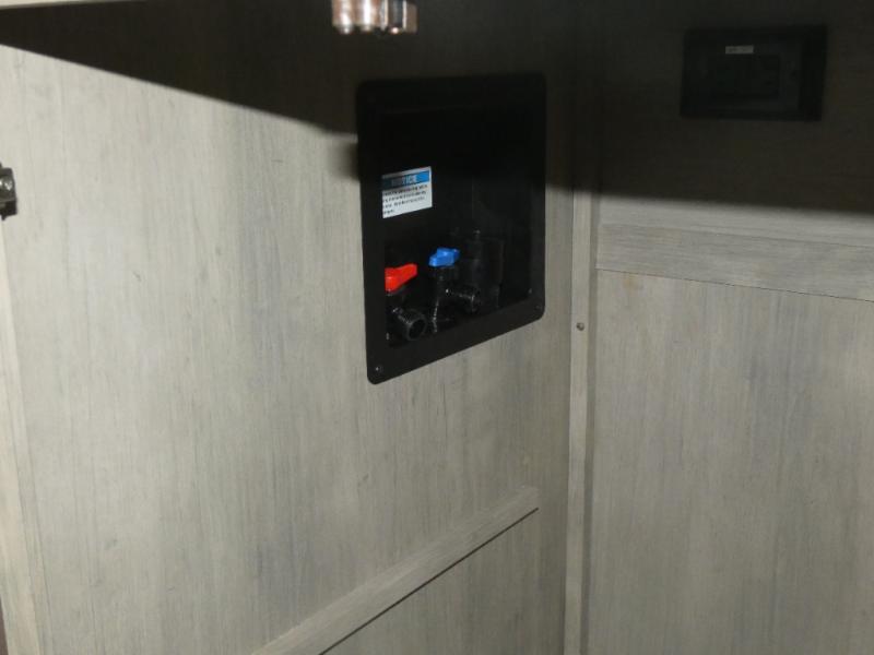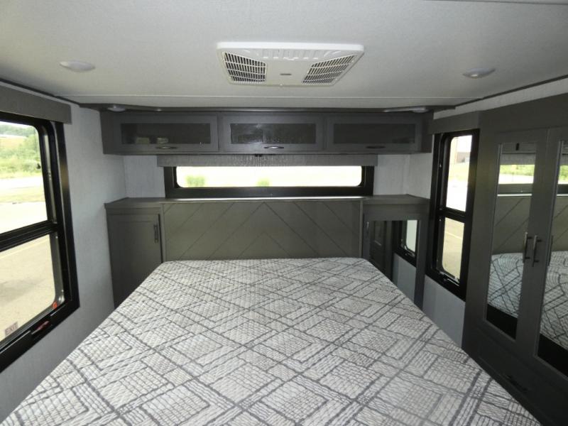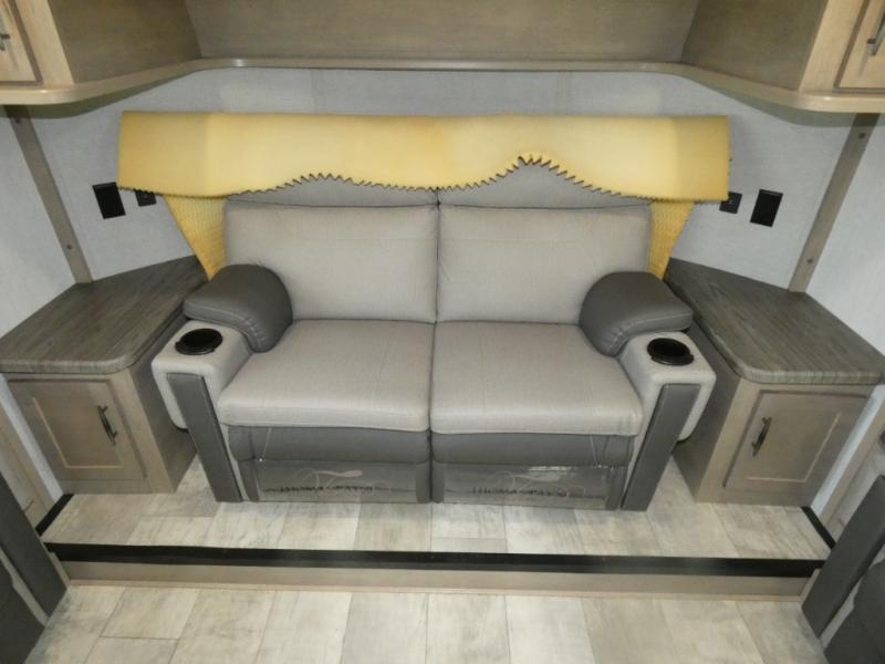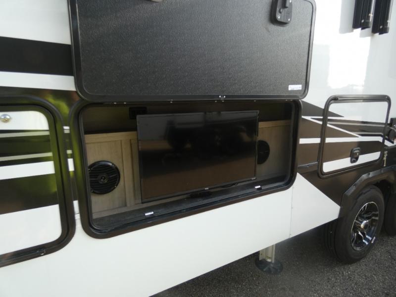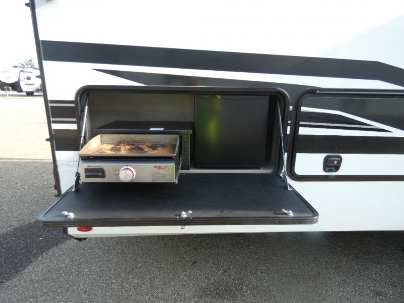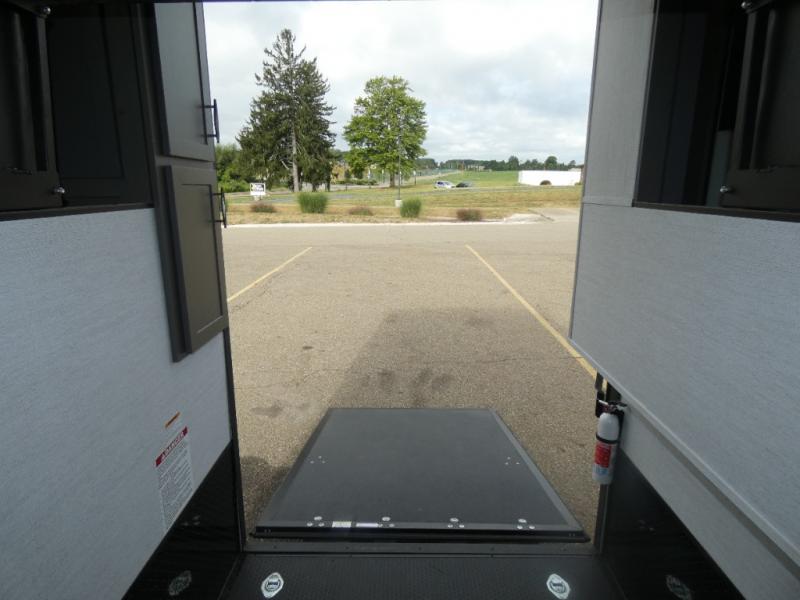 This toy hauler has all the space you need to enjoy a weekend with friends, or a week long family vacation. The fuel station will certainly keep the toys going, and the inside amenities including a full featured kitchen with butler pantry, 18 cu. ft. refrigerator, cooktop and oven, plus microwave and island with bar stools will make mealtime easy. The rear master suite is a couple of steps up and features a bed, a slide out wardrobe with drawers beneath, plus easy entry into the full bath with skylight over the shower, and a seat for relaxing after a long day of trail riding. There is a bed lift system that raises the bed to provide up to 77" of headroom space in the garage area below where you can easily load up your favorite ride on toys using the rear ramp door.