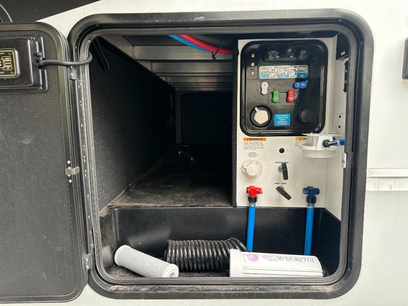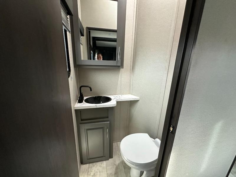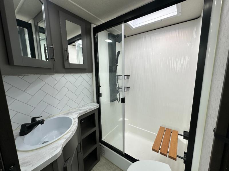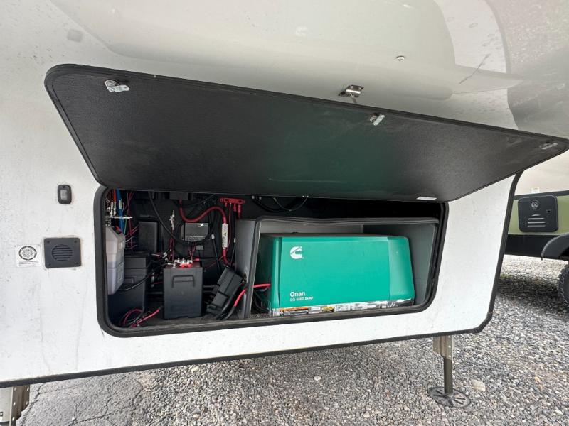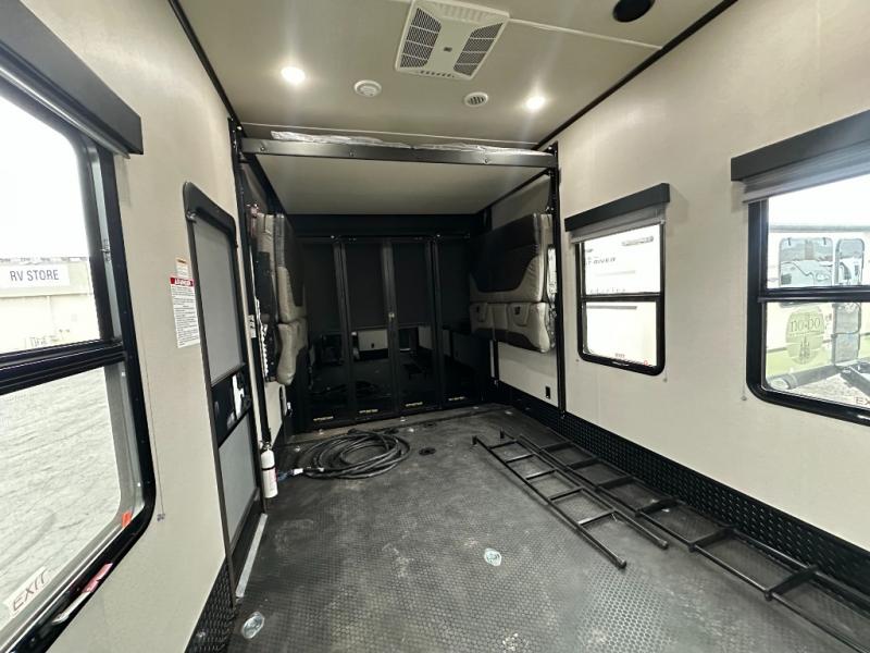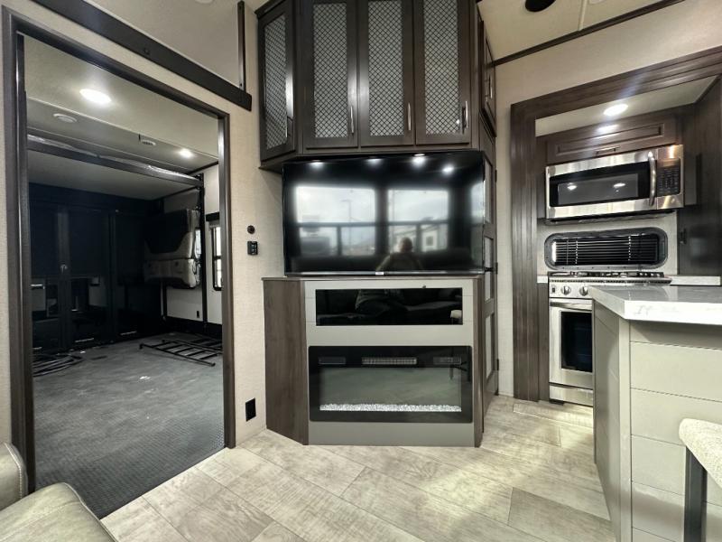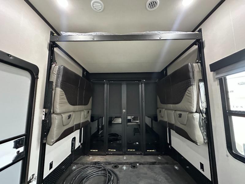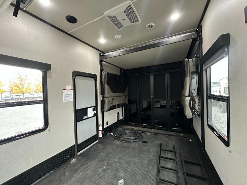 Traveling with friends and family can be comfortable when you have a full double entry bathroom and a half bath available when camping and enjoying the trails on your off-road toys! You will have an 15' garage space that can become a second living/dining area as well as a bedroom if you decide to add the Happi-Jac rollover sofas and a table with a top bed option. There is an overhead loft bed and a four-seat sofa slide for more sleeping space in the main living area. Everyone can watch the LED TV when waiting for dinner, and enjoy the fireplace on those chiller nights. The kitchen island offers a sink to wash dishes, extra counter space for serving meals and two stools to dine at. The cook will love all the upgraded appliances and the space thanks to the slide. The front bedroom gives you a queen bed slide with a king bed option, lots of clothing space, and a slide top dresser for even more storage.