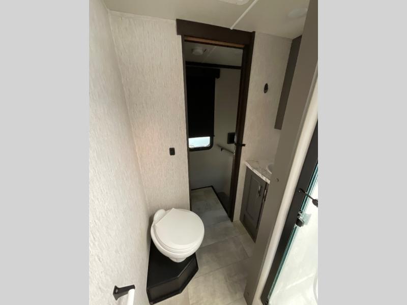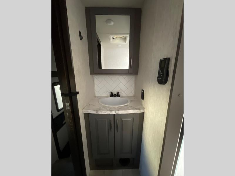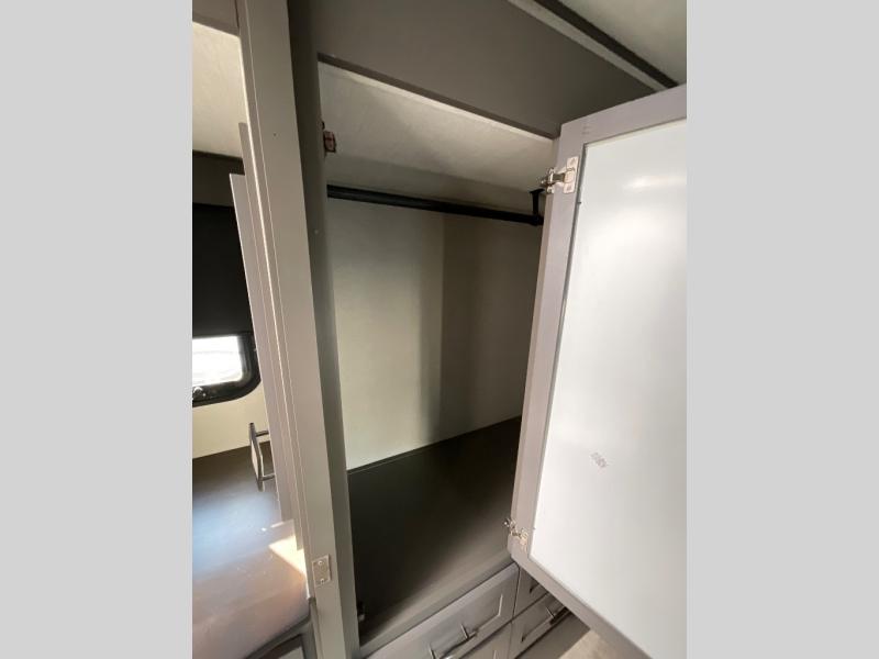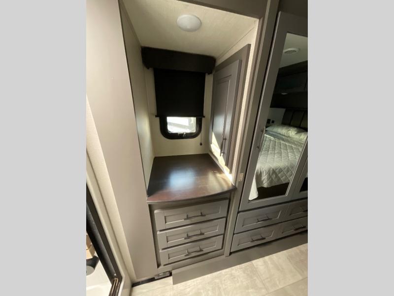 You want a toy hauler to carry your toys to the trails, and you can get an extra living room/bedroom out of this space once everything is unload when you add the Happi-Jac rollover sofas with a table with a top bed option. You might even like to add more optional features such a half bath and washer/dryer. There is an overhead loft bed and an L-shaped pull-out sofa in the main living area that offers sleeping space as well. Everyone can watch a movie on the LED TV with a fireplace below while sitting on the sofa, in the theatre seats, or while at the free standing dinette with four chairs. The chef will have upgraded appliances to make meals for everyone, an L-shaped countertop with a kitchen sink, and a USB charging outlet. You will love the sunken tub/shower with seat in the full bathroom with two space savings sliding doors that lead into the hallway, and into the front bedroom where you will have a walk-around queen bed, a slide out wardrobe and more USB charging outlets.