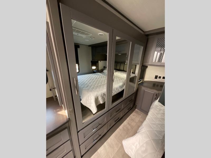 With any Momentum M-Class toy hauler by Grand Design, you will enjoy luxury at every turn! They have been constructed to a superior standard with a thermal roof design, triple insulated main floor and garage floor, and a Rail-Tite underbelly seal that will allow you to camp in all elements. Each model also features an 8' 5" wide body chassis with a wide rail design, no wheel wheels, and a dovetail entry for easier loading. The Stealth A/C system provides maximum cooling power, and the CRE3000 suspension system means you can enjoy a smooth tow each time. You will love the luxurious interior with a professional grade stainless steel cooktop, interior color changing LED accent lighting, a fiberglass shower with a glass door, and solid surface countertops.