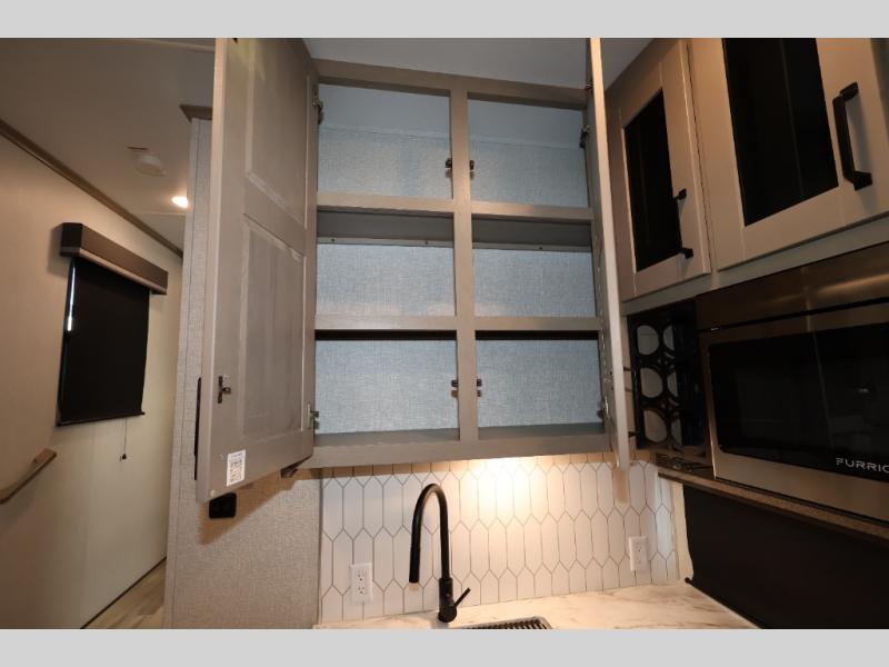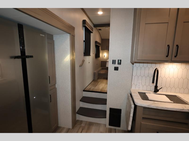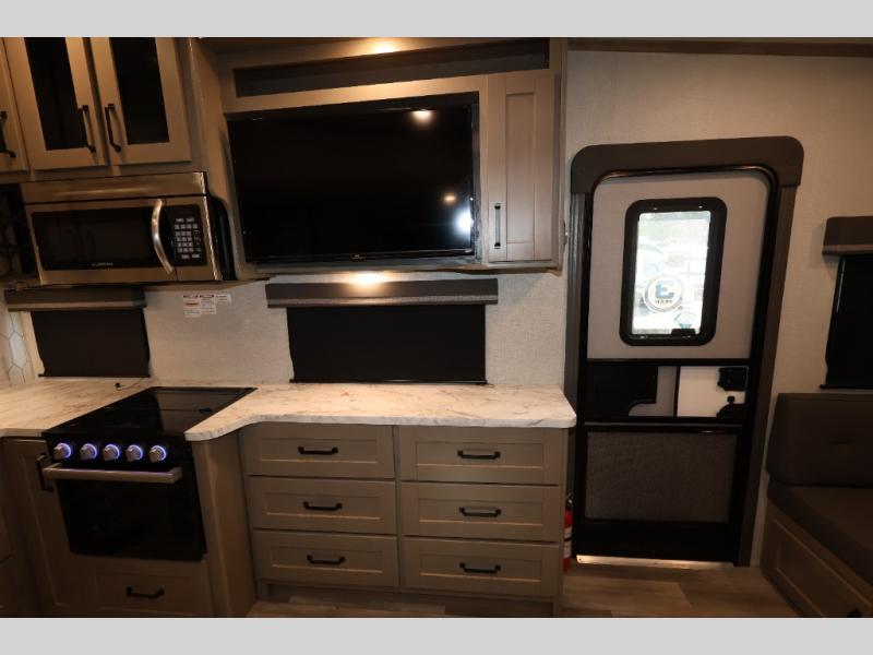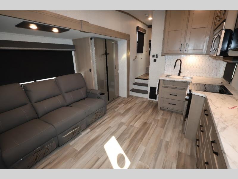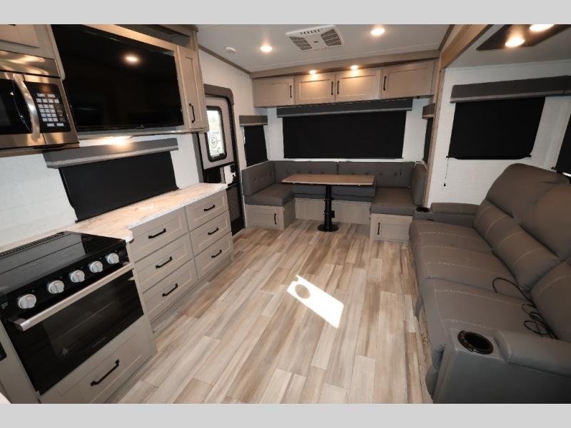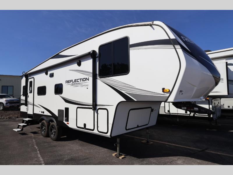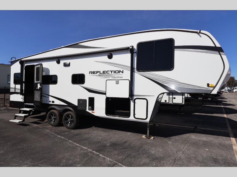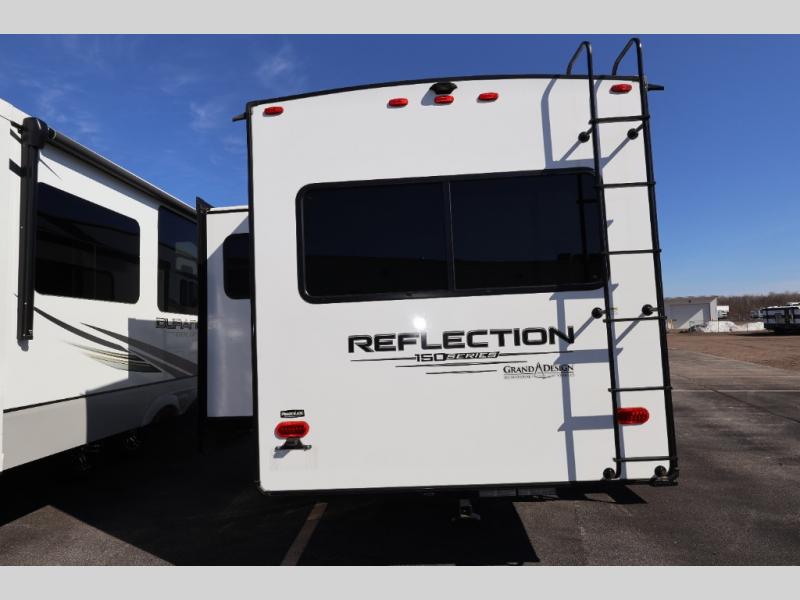 With any Reflection 150 Series fifth wheel by Grand Design, there is more available payload capacity and a broader range of half-ton trucks capable of towing this fifth wheel, and no slider hitch is needed thanks to the 90-degree turning radius which makes them short bed friendly and easier to tow. The mandatory Ultimate Power package provides a "One-Touch" automatic leveling system and a detachable power cord with LED light for easy setup, plus motion sensor pass-through lighting and entry lighting, and the Tire Linc TPMS will help you stay safe on the road. The interior offers residential luxury from the cabinetry and premium congoleum flooring, plus the booth dinette to the residential-style window treatment. Make your refined decision today!