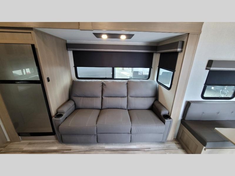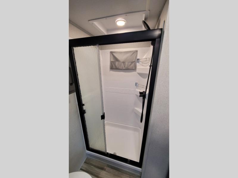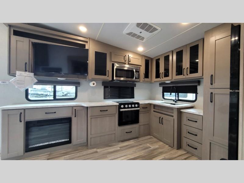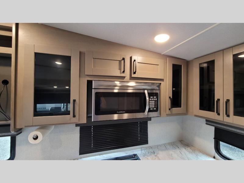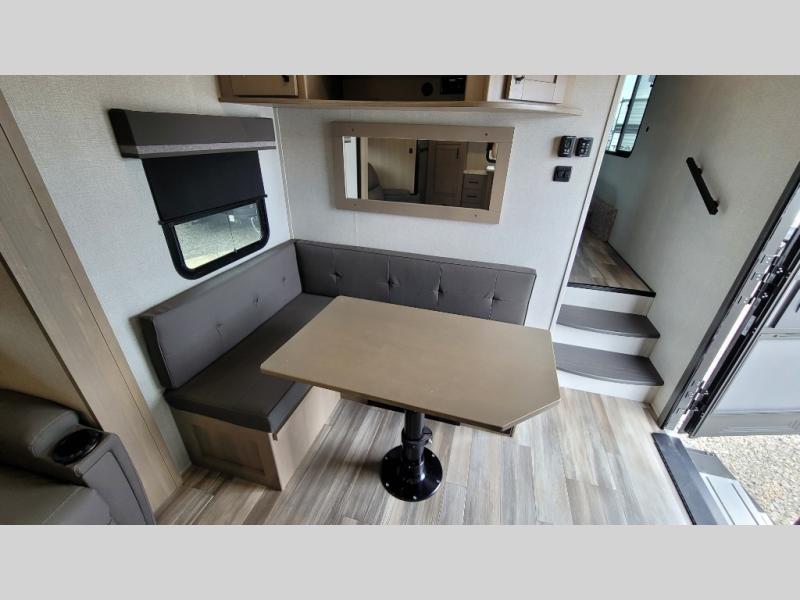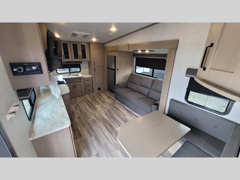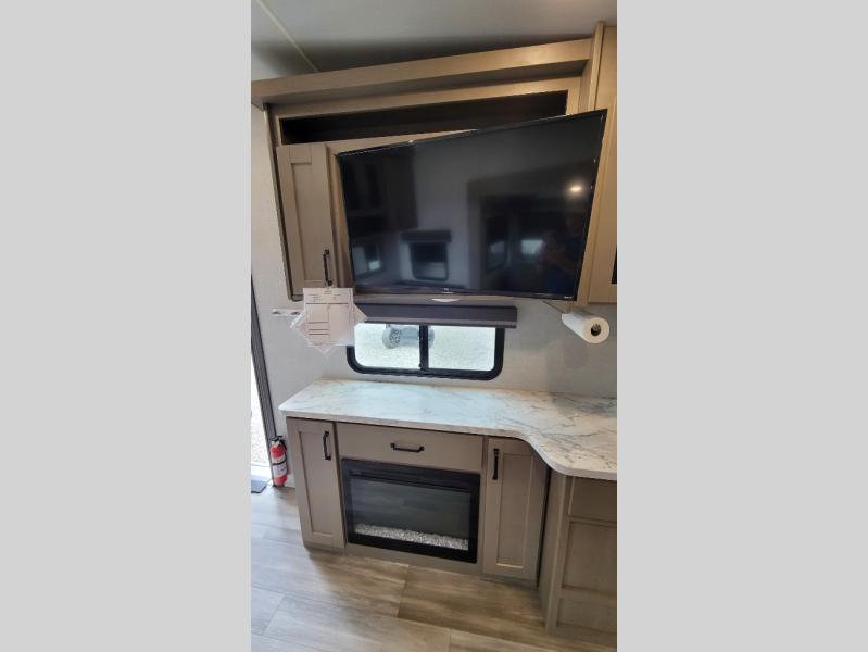Your short bed truck will love this fifth wheel with swivel pin box and a 90 degree turning radius without a slider hitch. You will love this fifth wheel featuring a single slide for added interior living space and all the comforts and conveniences it provides you while you travel. The slide features a 78" theater seat plus there is a breakfast nook for more seating. Both can easily view the entertainment center with 40" TV. A rear kitchen indoors provides everything you need to create meals like home while on the road, and if you want to spend as much time outside as possible, then the outdoor griddle will certainly accommodate you for meals. Up front, a cozy private bedroom with queen bed, wardrobe, and overhead cabinets. Right next door, you will find a large walk-in shower with skylight for more natural lighting, as well as a toilet, and a vanity with sink and linen cabinet for your towels and toiletries. This unit offers ample storage both inside and out. You will love the full unobstructed pass-through compartment for all of your gear, plus so much more!