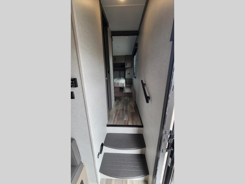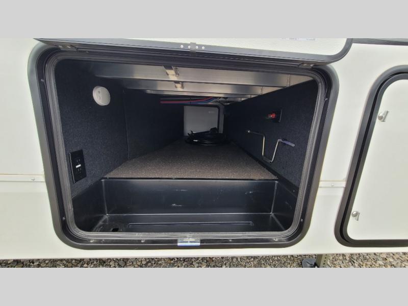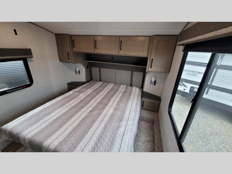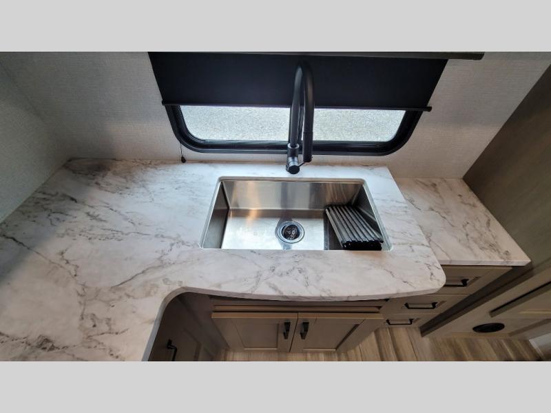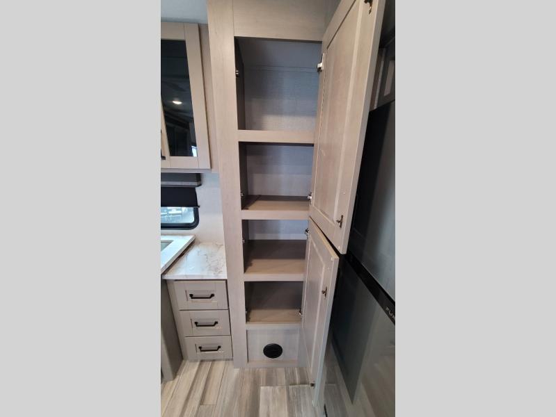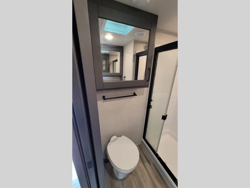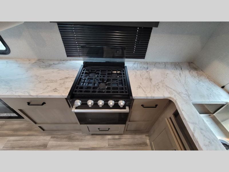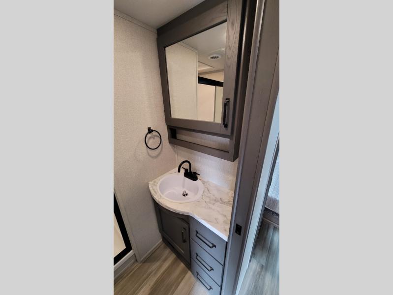 Your short bed truck will love this fifth wheel with swivel pin box and a 90 degree turning radius without a slider hitch. You will love this fifth wheel featuring a single slide for added interior living space and all the comforts and conveniences it provides you while you travel. The slide features a 78" theater seat plus there is a breakfast nook for more seating. Both can easily view the entertainment center with 40" TV. A rear kitchen indoors provides everything you need to create meals like home while on the road, and if you want to spend as much time outside as possible, then the outdoor griddle will certainly accommodate you for meals. Up front, a cozy private bedroom with queen bed, wardrobe, and overhead cabinets. Right next door, you will find a large walk-in shower with skylight for more natural lighting, as well as a toilet, and a vanity with sink and linen cabinet for your towels and toiletries. This unit offers ample storage both inside and out. You will love the full unobstructed pass-through compartment for all of your gear, plus so much more!