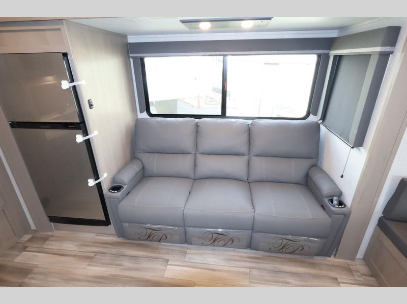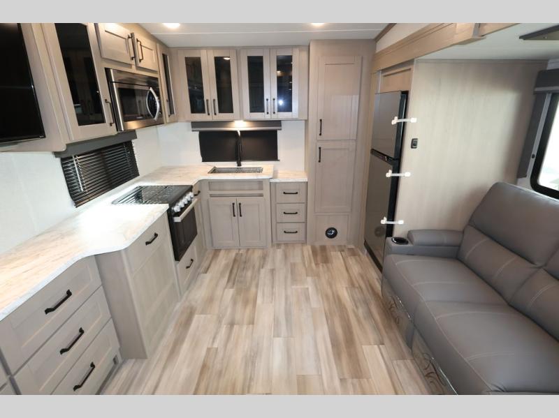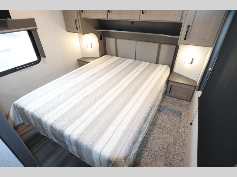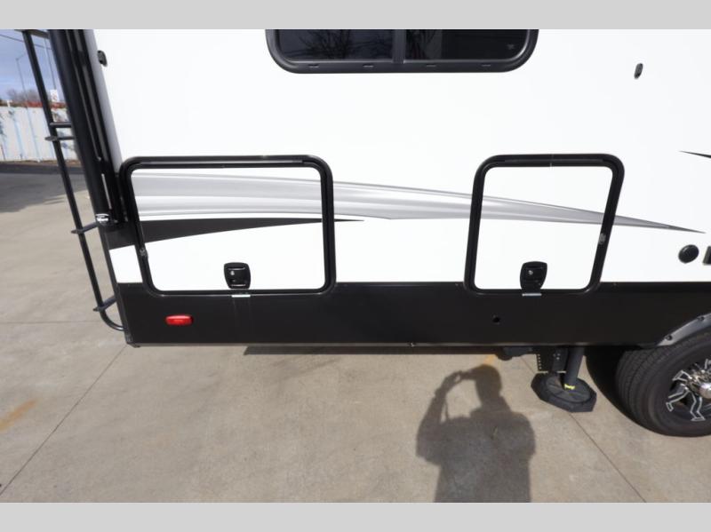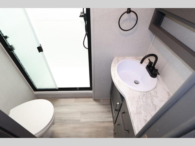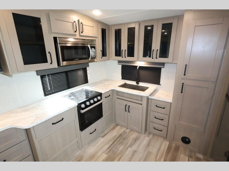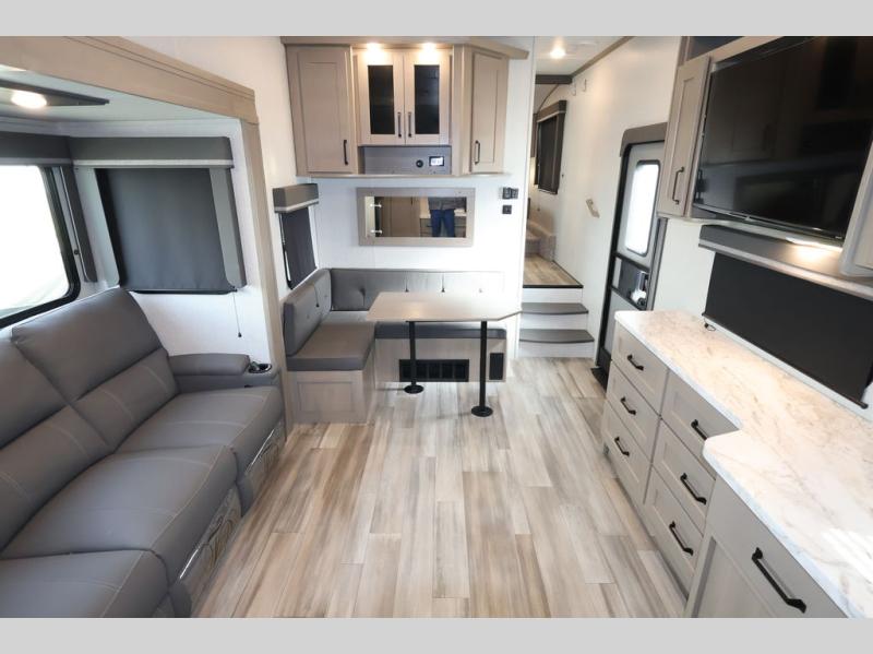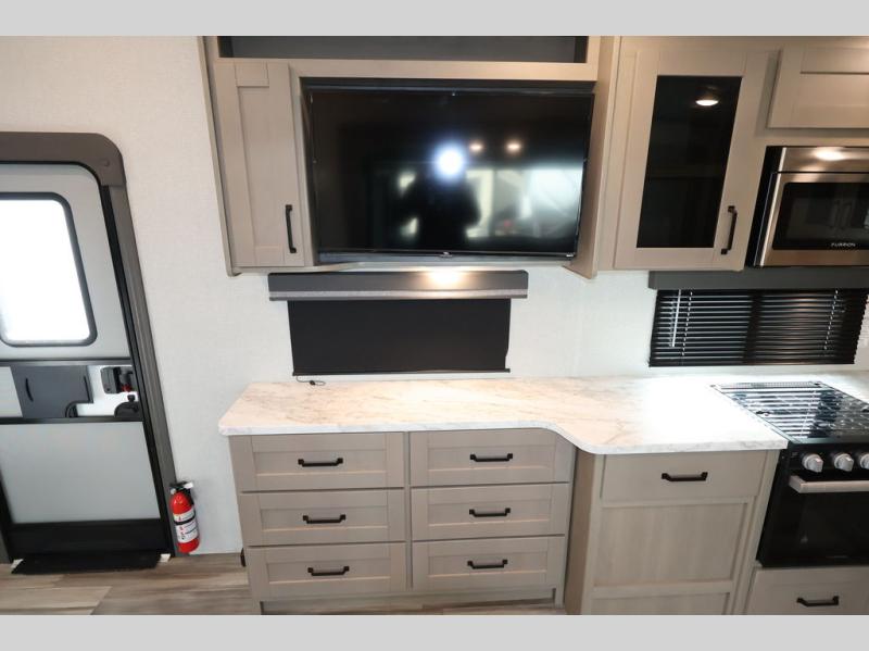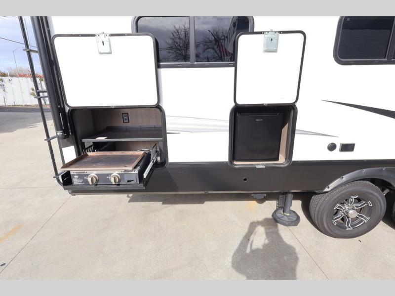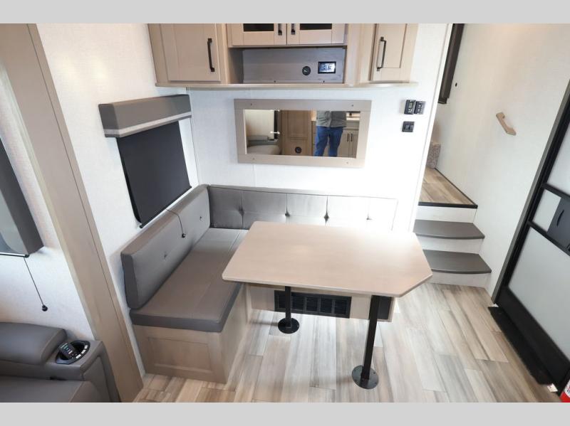 Your short bed truck will love this fifth wheel with swivel pin box and a 90 degree turning radius without a slider hitch. You will love this fifth wheel featuring a single slide for added interior living space and all the comforts and conveniences it provides you while you travel. The slide features a 78" theater seat plus there is a breakfast nook for more seating. Both can easily view the entertainment center with 40" TV. A rear kitchen indoors provides everything you need to create meals like home while on the road, and if you want to spend as much time outside as possible, then the outdoor griddle will certainly accommodate you for meals. Up front, a cozy private bedroom with queen bed, wardrobe, and overhead cabinets. Right next door, you will find a large walk-in shower with skylight for more natural lighting, as well as a toilet, and a vanity with sink and linen cabinet for your towels and toiletries. This unit offers ample storage both inside and out. You will love the full unobstructed pass-through compartment for all of your gear, plus so much more!