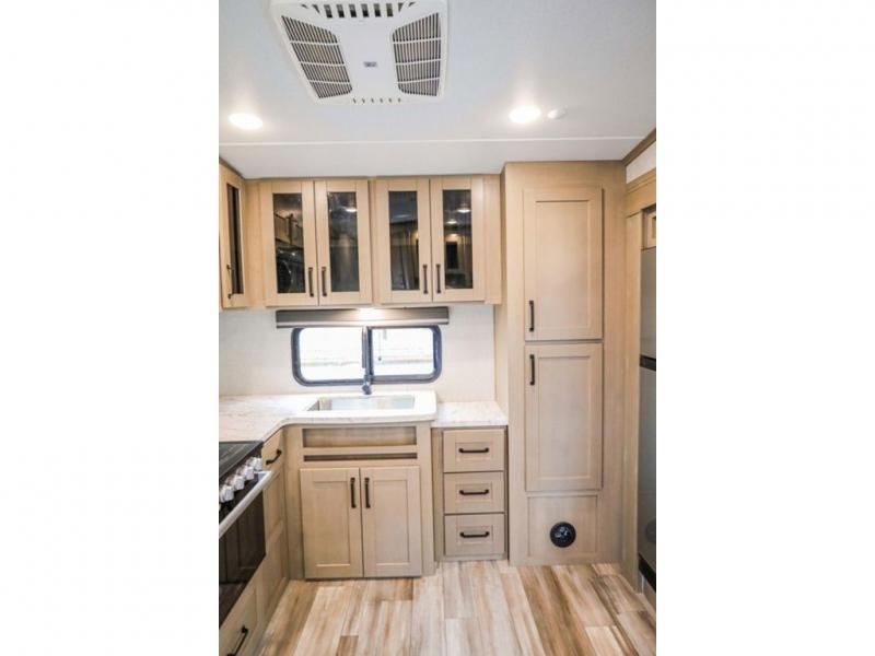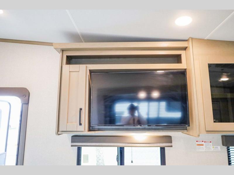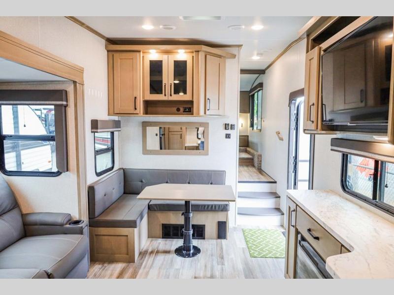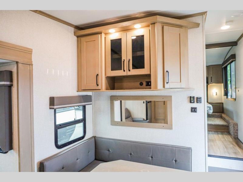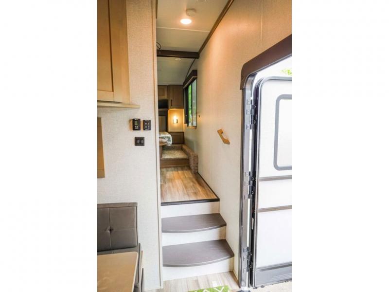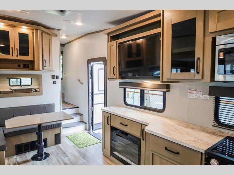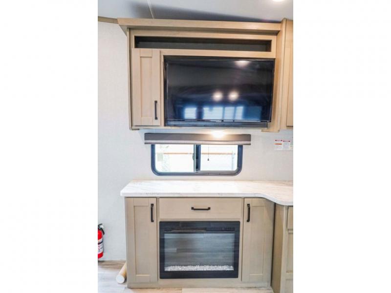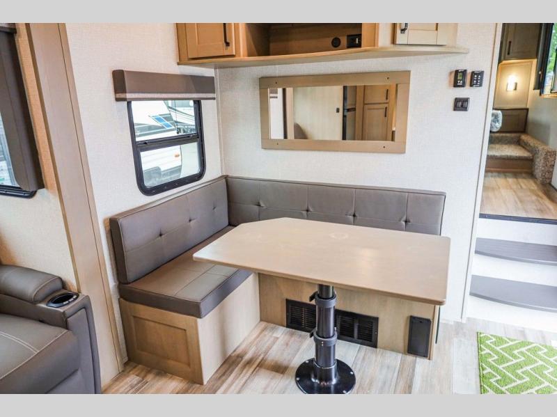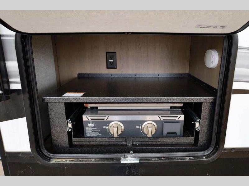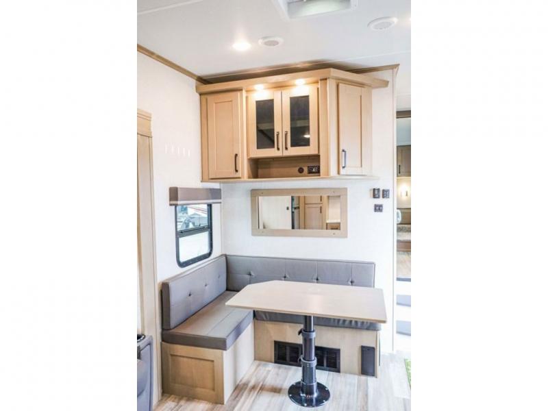Your short bed truck will love this fifth wheel with swivel pin box and a 90 degree turning radius without a slider hitch. You will love this fifth wheel featuring a single slide for added interior living space and all the comforts and conveniences it provides you while you travel. The slide features a 78" theater seat plus there is a breakfast nook for more seating. Both can easily view the entertainment center with 40" TV. A rear kitchen indoors provides everything you need to create meals like home while on the road, and if you want to spend as much time outside as possible, then the outdoor griddle will certainly accommodate you for meals. Up front, a cozy private bedroom with queen bed, wardrobe, and overhead cabinets. Right next door, you will find a large walk-in shower with skylight for more natural lighting, as well as a toilet, and a vanity with sink and linen cabinet for your towels and toiletries. This unit offers ample storage both inside and out. You will love the full unobstructed pass-through compartment for all of your gear, plus so much more!