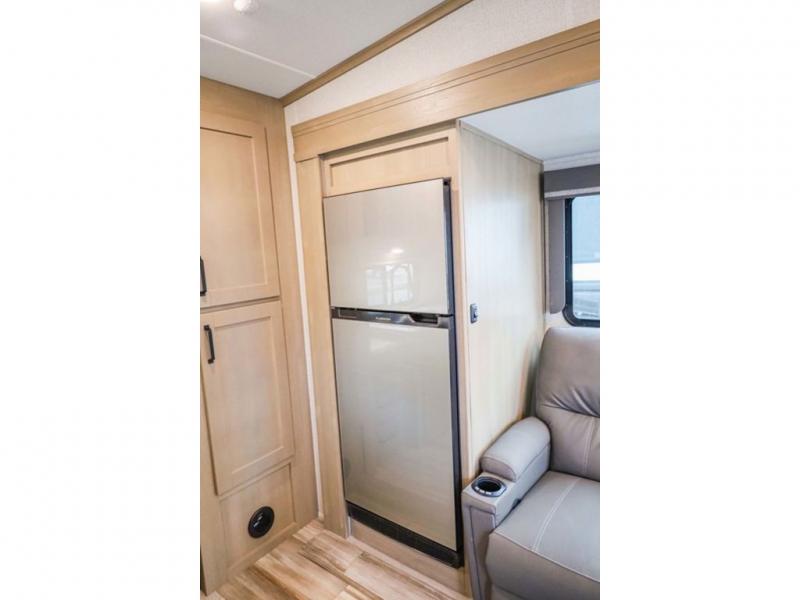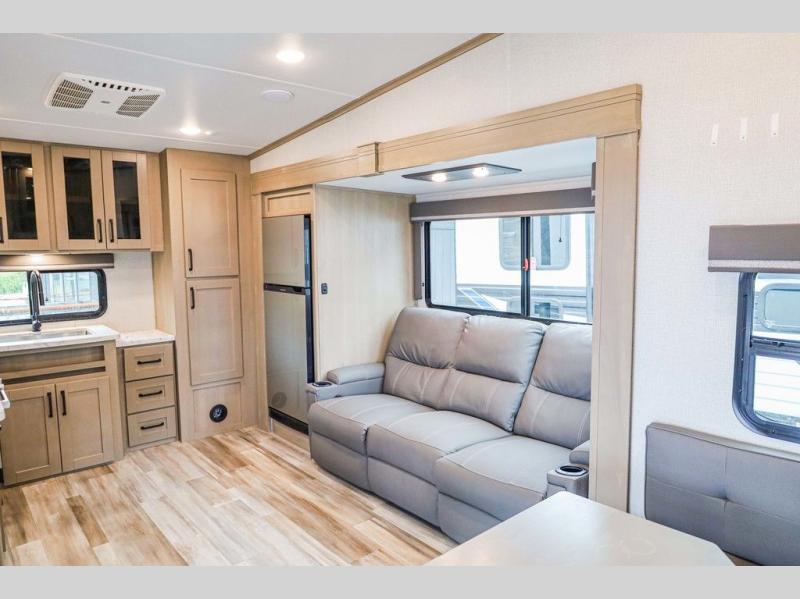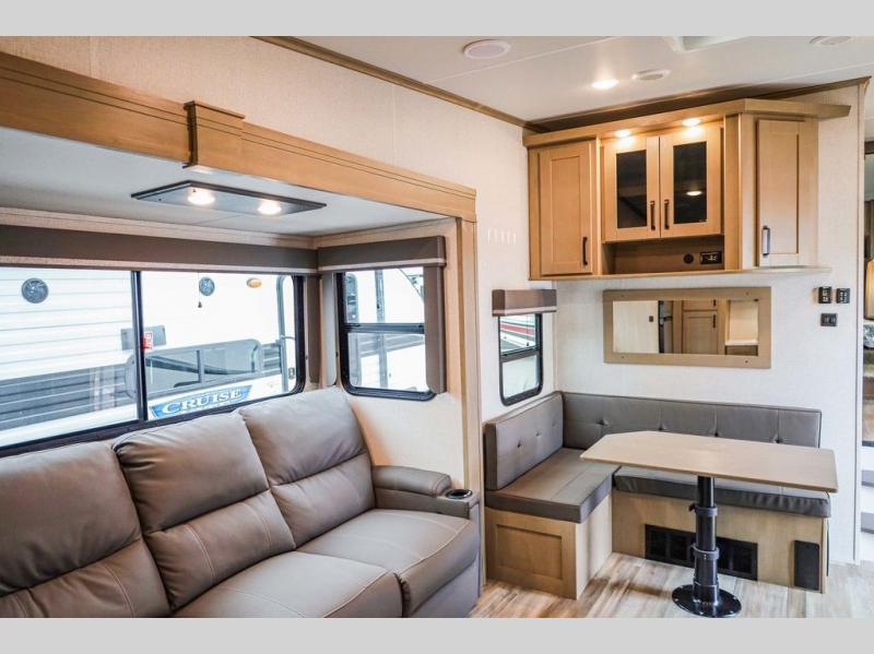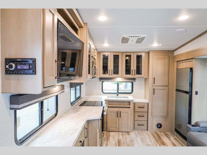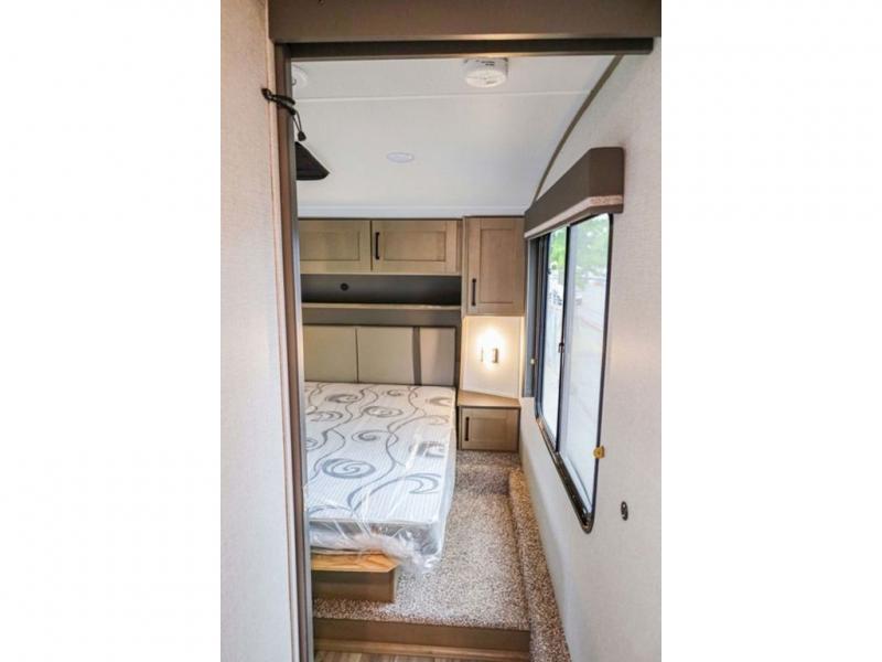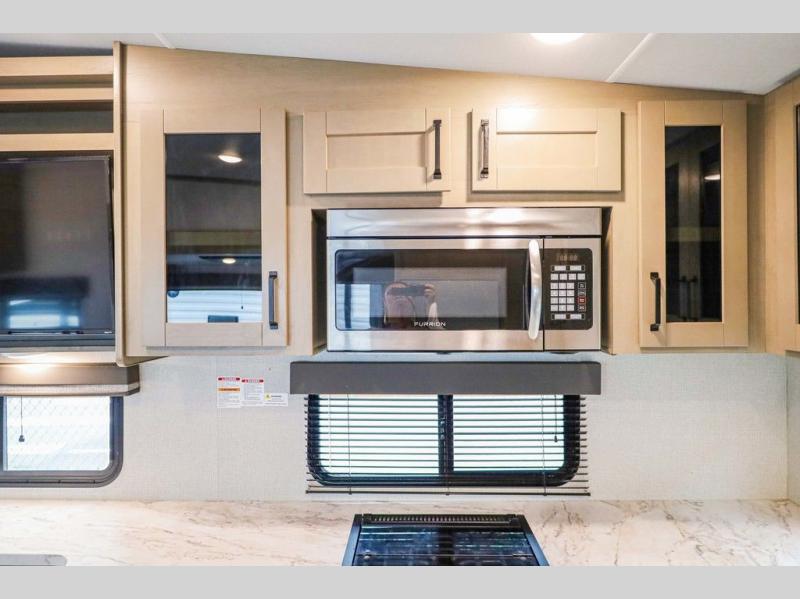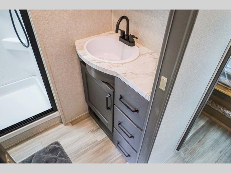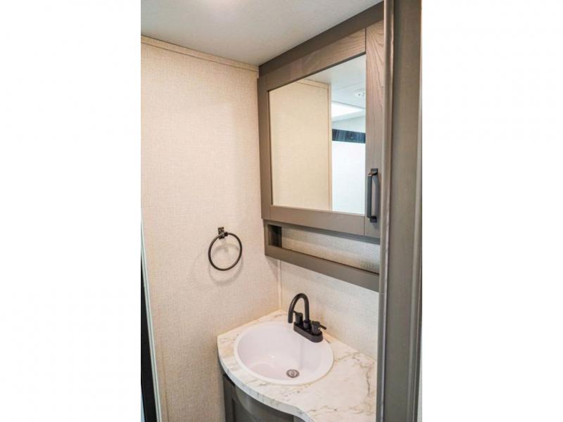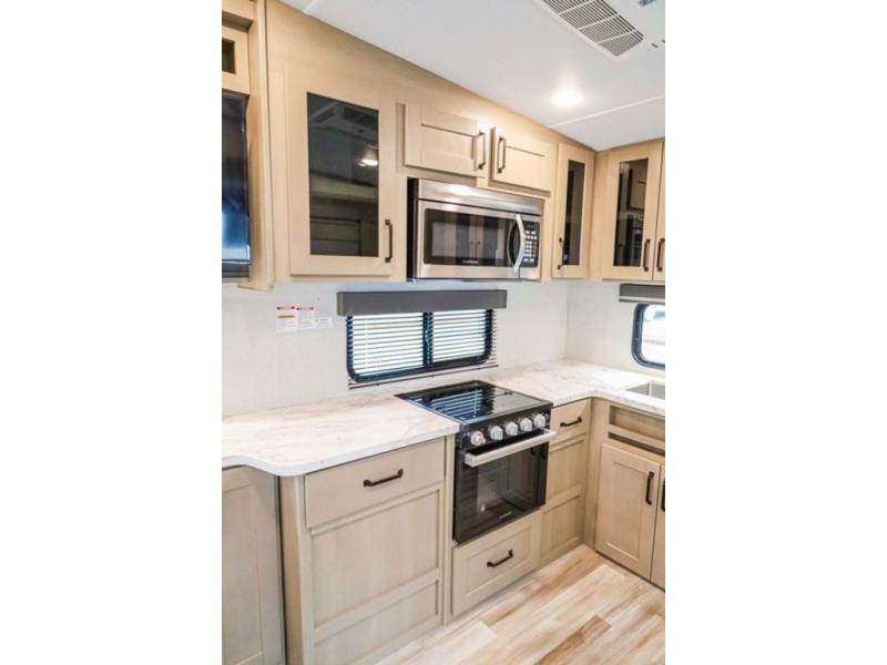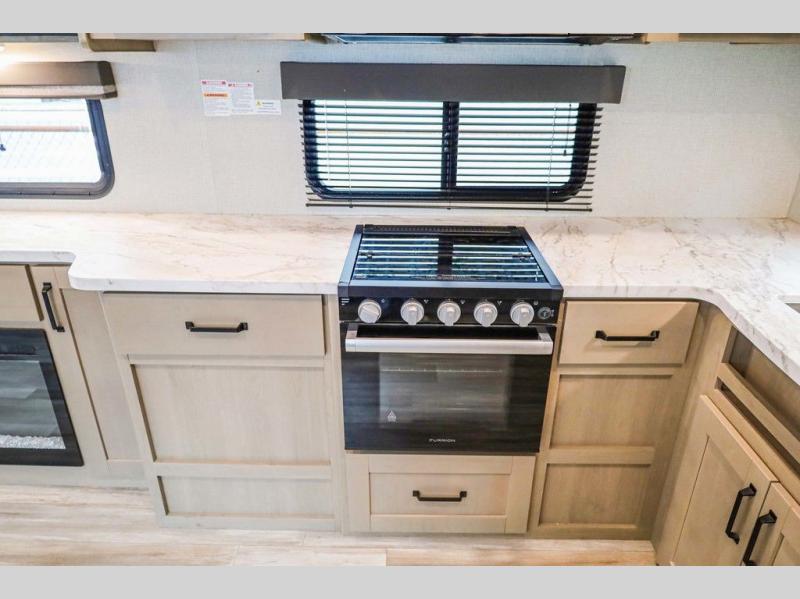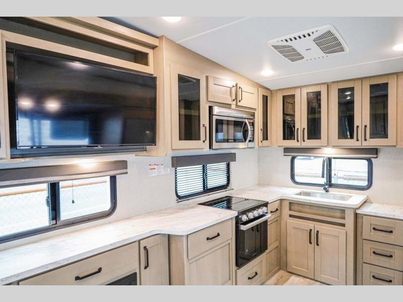 Your short bed truck will love this fifth wheel with swivel pin box and a 90 degree turning radius without a slider hitch. You will love this fifth wheel featuring a single slide for added interior living space and all the comforts and conveniences it provides you while you travel. The slide features a 78" theater seat plus there is a breakfast nook for more seating. Both can easily view the entertainment center with 40" TV. A rear kitchen indoors provides everything you need to create meals like home while on the road, and if you want to spend as much time outside as possible, then the outdoor griddle will certainly accommodate you for meals. Up front, a cozy private bedroom with queen bed, wardrobe, and overhead cabinets. Right next door, you will find a large walk-in shower with skylight for more natural lighting, as well as a toilet, and a vanity with sink and linen cabinet for your towels and toiletries. This unit offers ample storage both inside and out. You will love the full unobstructed pass-through compartment for all of your gear, plus so much more!