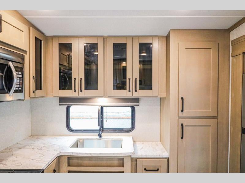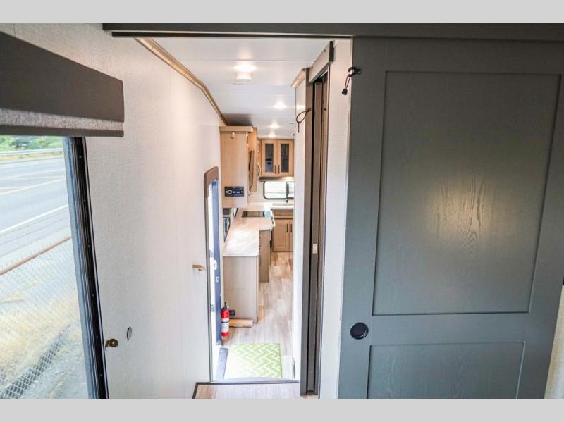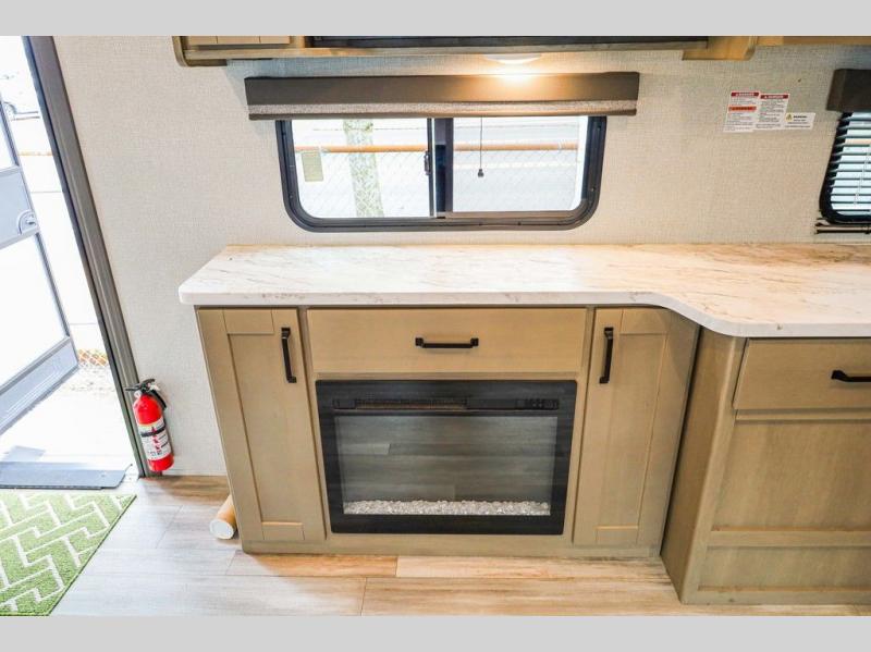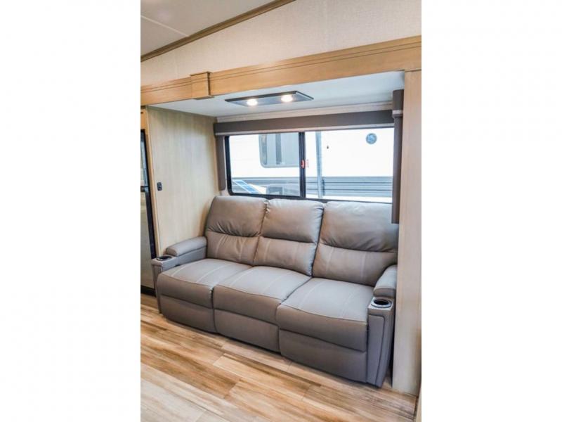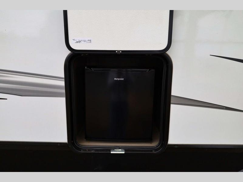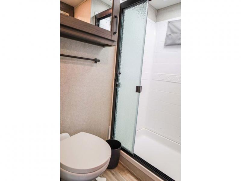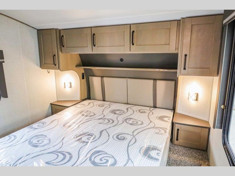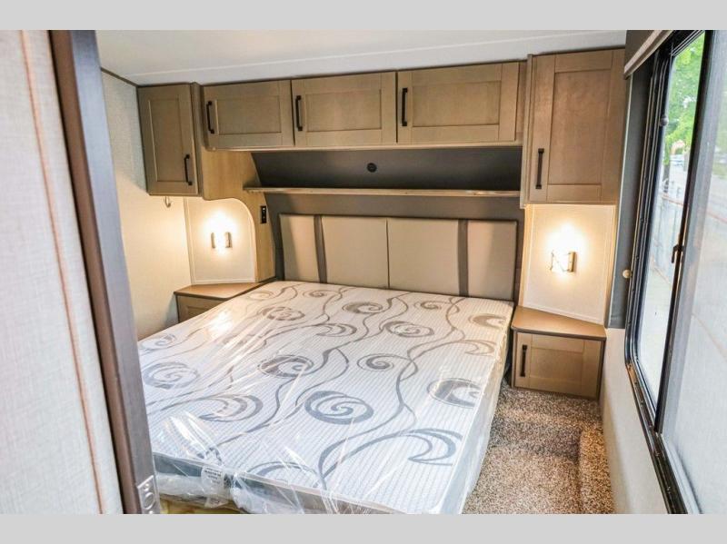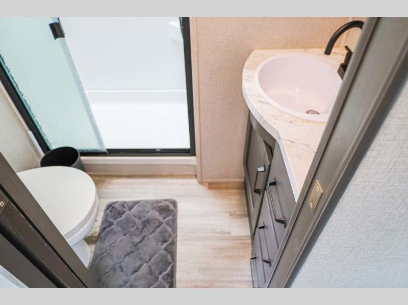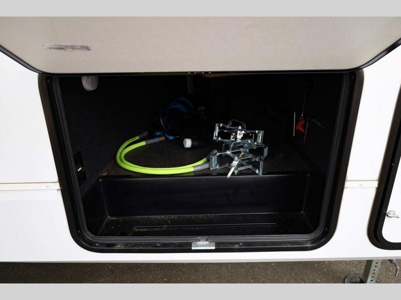 Your short bed truck will love this fifth wheel with swivel pin box and a 90 degree turning radius without a slider hitch. You will love this fifth wheel featuring a single slide for added interior living space and all the comforts and conveniences it provides you while you travel. The slide features a 78" theater seat plus there is a breakfast nook for more seating. Both can easily view the entertainment center with 40" TV. A rear kitchen indoors provides everything you need to create meals like home while on the road, and if you want to spend as much time outside as possible, then the outdoor griddle will certainly accommodate you for meals. Up front, a cozy private bedroom with queen bed, wardrobe, and overhead cabinets. Right next door, you will find a large walk-in shower with skylight for more natural lighting, as well as a toilet, and a vanity with sink and linen cabinet for your towels and toiletries. This unit offers ample storage both inside and out. You will love the full unobstructed pass-through compartment for all of your gear, plus so much more!