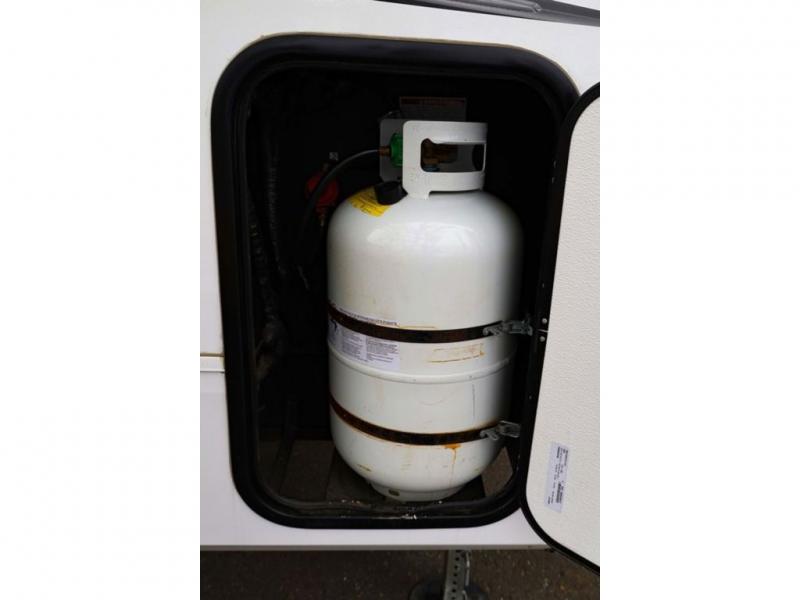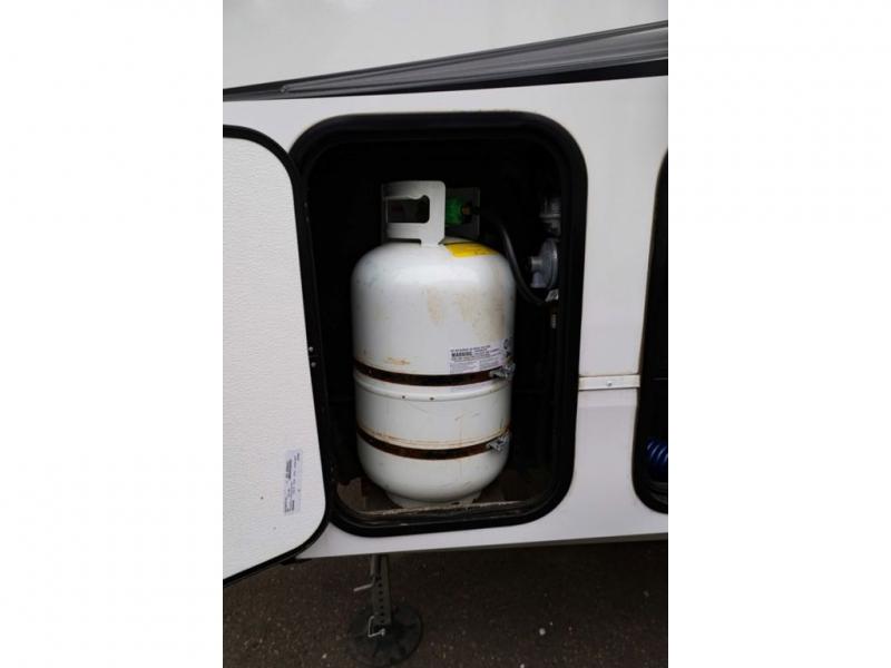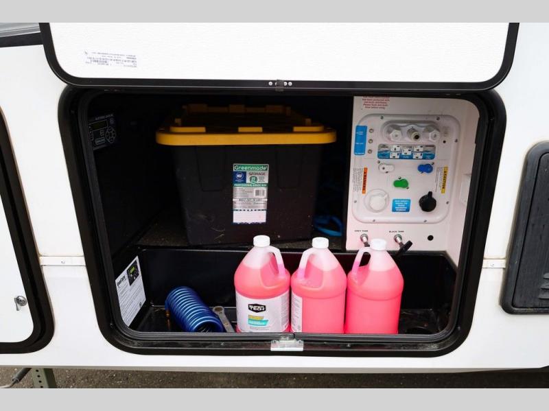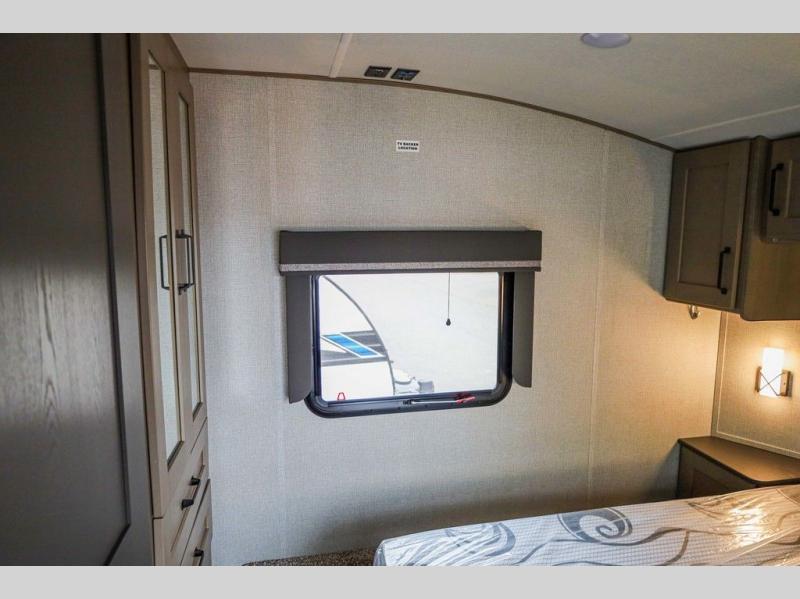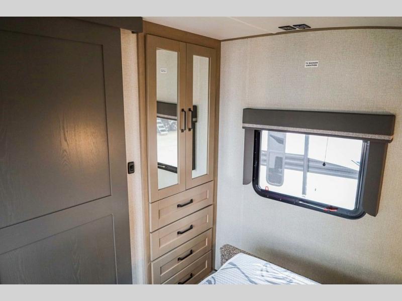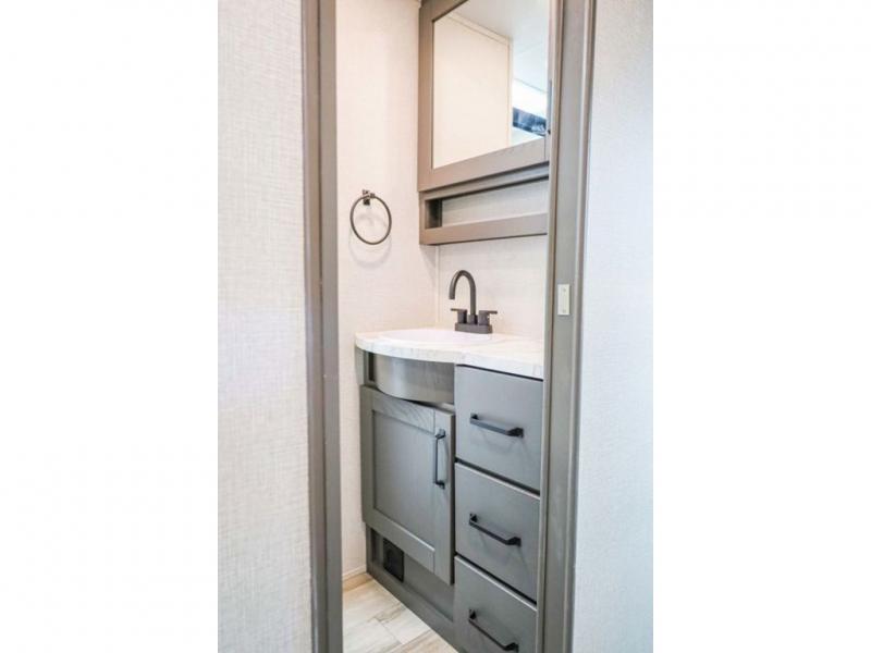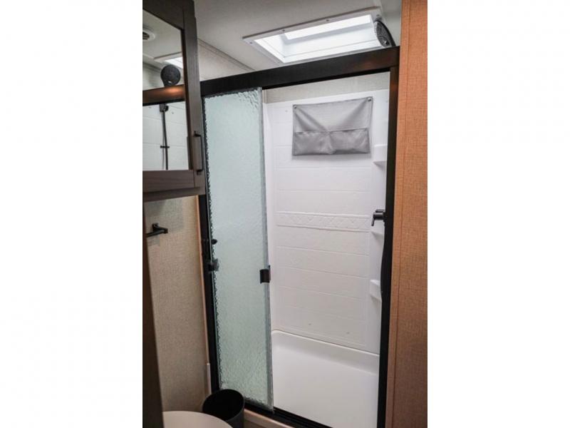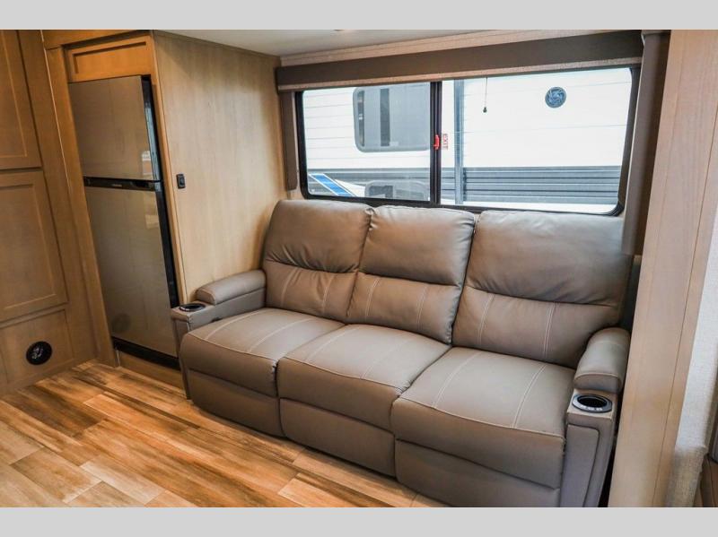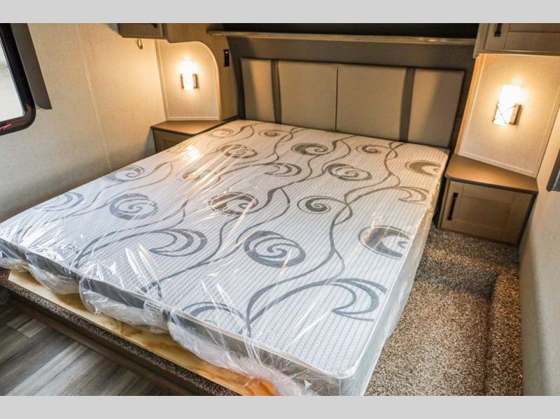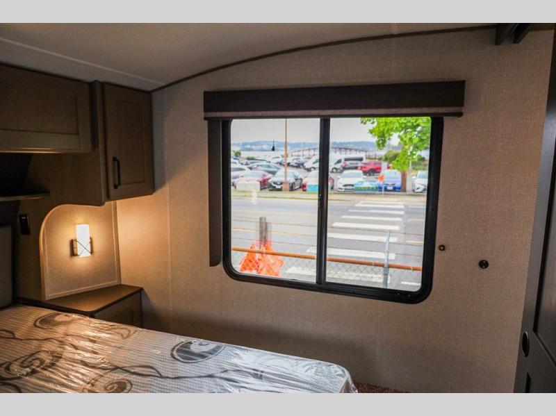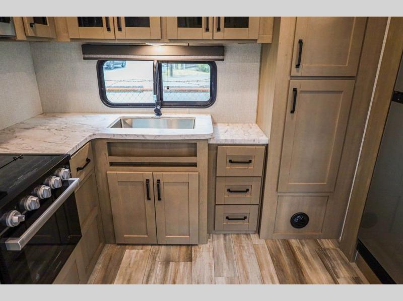 Your short bed truck will love this fifth wheel with swivel pin box and a 90 degree turning radius without a slider hitch. You will love this fifth wheel featuring a single slide for added interior living space and all the comforts and conveniences it provides you while you travel. The slide features a 78" theater seat plus there is a breakfast nook for more seating. Both can easily view the entertainment center with 40" TV. A rear kitchen indoors provides everything you need to create meals like home while on the road, and if you want to spend as much time outside as possible, then the outdoor griddle will certainly accommodate you for meals. Up front, a cozy private bedroom with queen bed, wardrobe, and overhead cabinets. Right next door, you will find a large walk-in shower with skylight for more natural lighting, as well as a toilet, and a vanity with sink and linen cabinet for your towels and toiletries. This unit offers ample storage both inside and out. You will love the full unobstructed pass-through compartment for all of your gear, plus so much more!