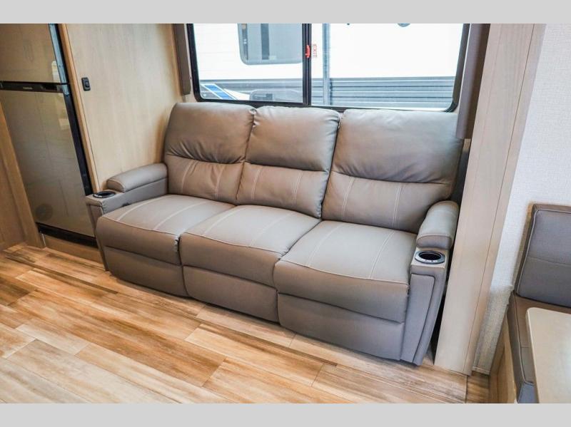 With any Reflection 150 Series fifth wheel by Grand Design, there is more available payload capacity and a broader range of half-ton trucks capable of towing this fifth wheel, and no slider hitch is needed thanks to the 90-degree turning radius which makes them short bed friendly and easier to tow. The mandatory Ultimate Power package provides a "One-Touch" automatic leveling system and a detachable power cord with LED light for easy setup, plus motion sensor pass-through lighting and entry lighting, and the Tire Linc TPMS will help you stay safe on the road. The interior offers residential luxury from the cabinetry and premium congoleum flooring, plus the booth dinette to the residential-style window treatment. Make your refined decision today!