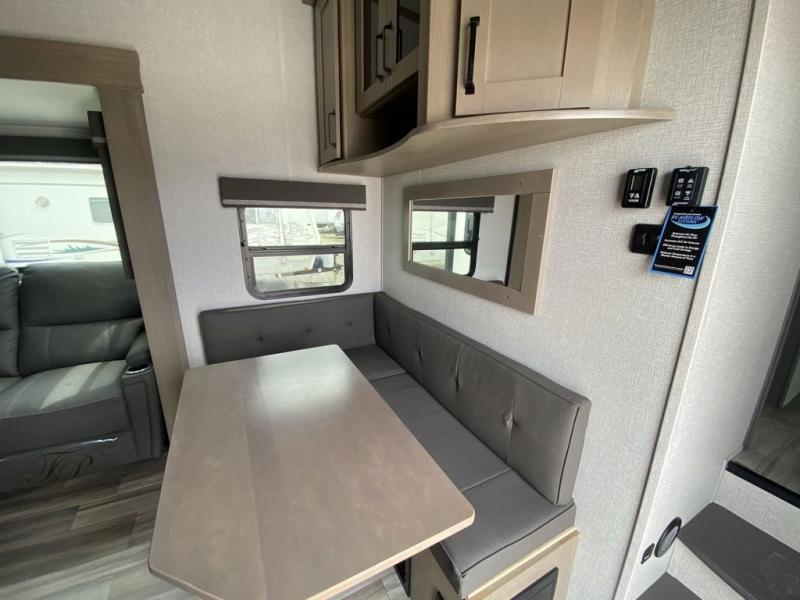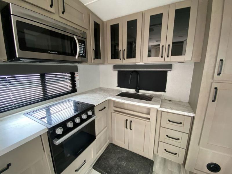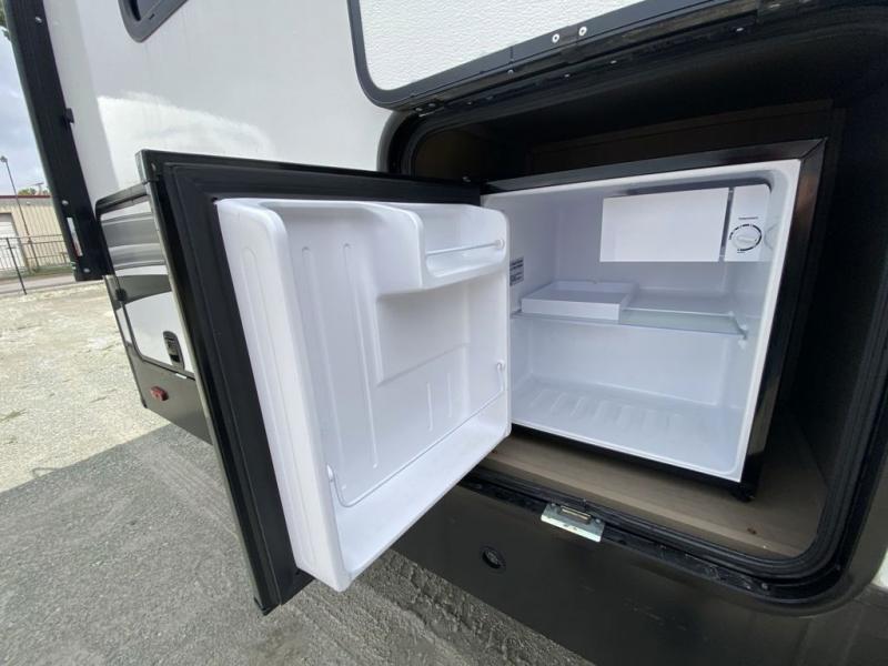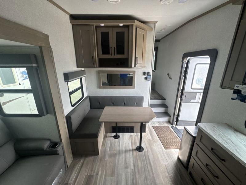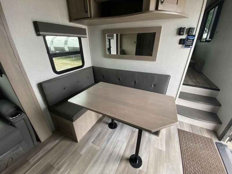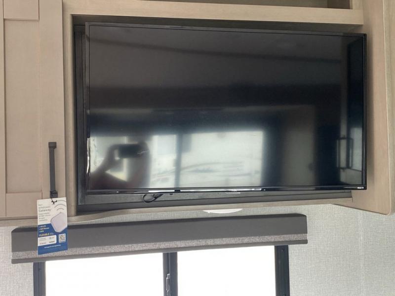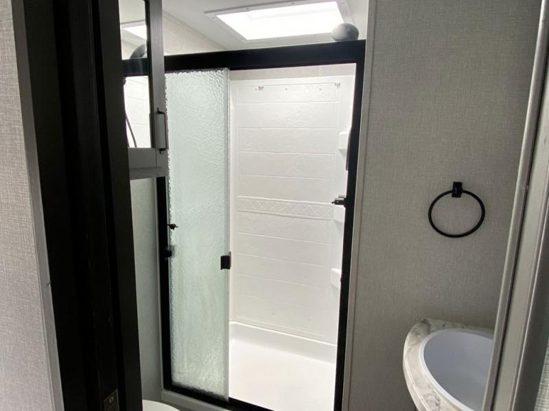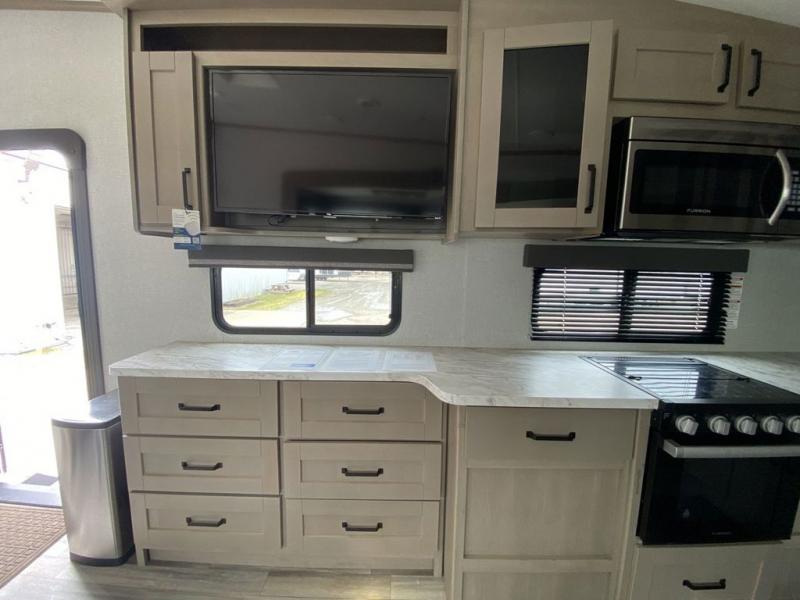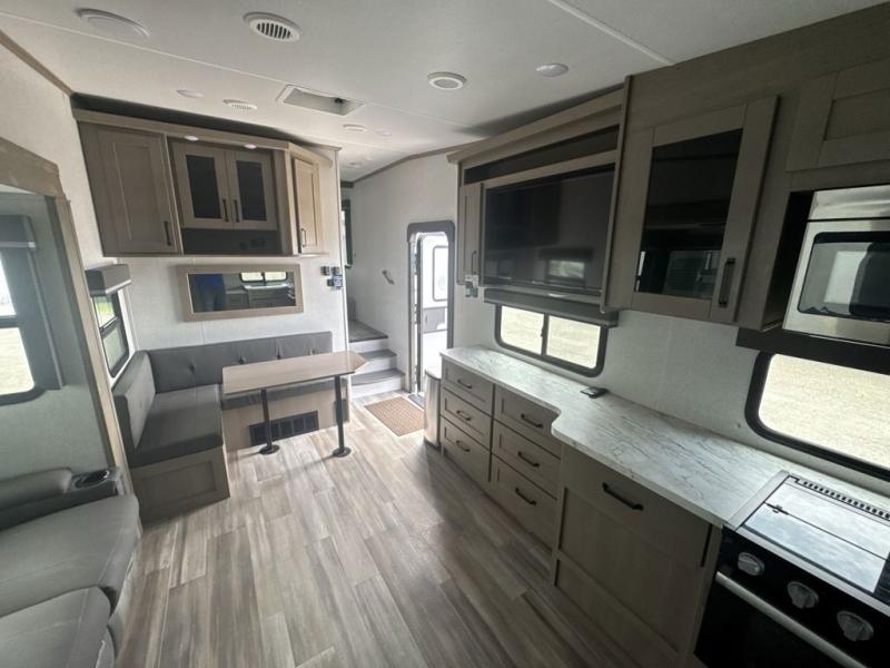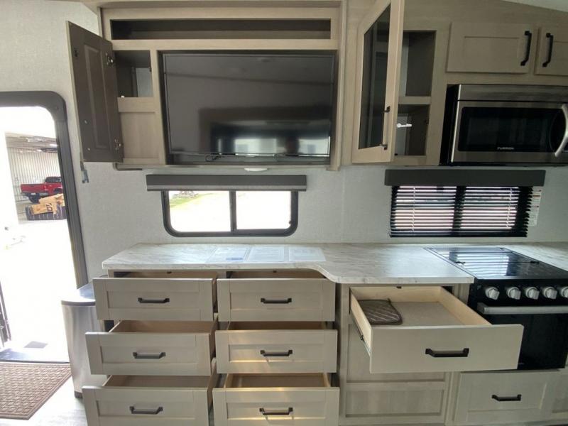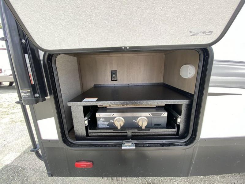 Your short bed truck will love this fifth wheel with swivel pin box and a 90 degree turning radius without a slider hitch. You will love this fifth wheel featuring a single slide for added interior living space and all the comforts and conveniences it provides you while you travel. The slide features a 78" theater seat plus there is a breakfast nook for more seating. Both can easily view the entertainment center with 40" TV. A rear kitchen indoors provides everything you need to create meals like home while on the road, and if you want to spend as much time outside as possible, then the outdoor griddle will certainly accommodate you for meals. Up front, a cozy private bedroom with queen bed, wardrobe, and overhead cabinets. Right next door, you will find a large walk-in shower with skylight for more natural lighting, as well as a toilet, and a vanity with sink and linen cabinet for your towels and toiletries. This unit offers ample storage both inside and out. You will love the full unobstructed pass-through compartment for all of your gear, plus so much more!